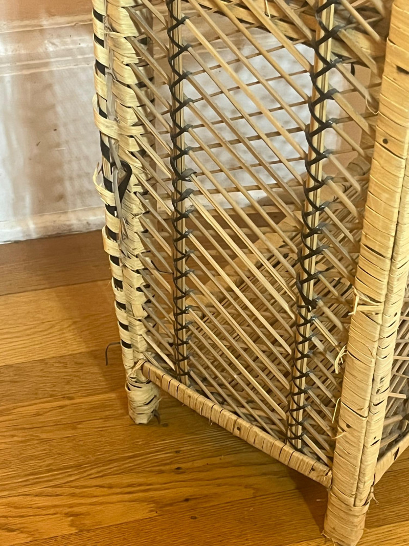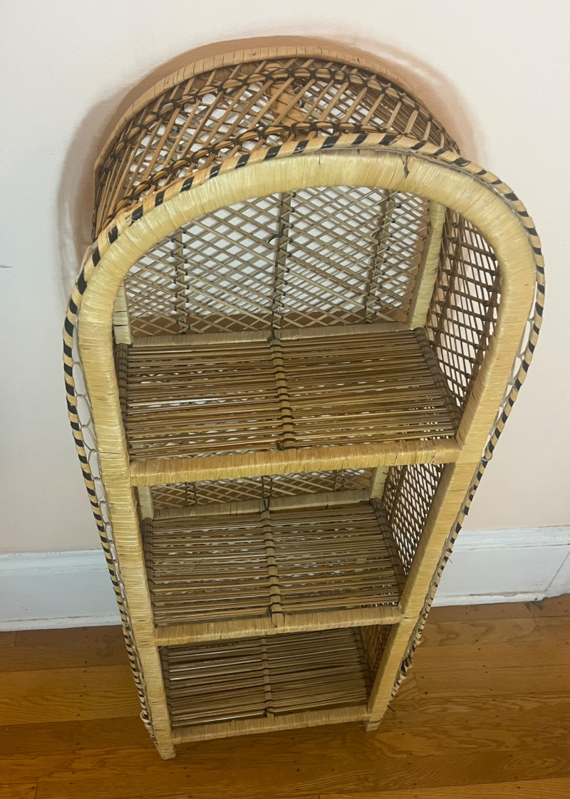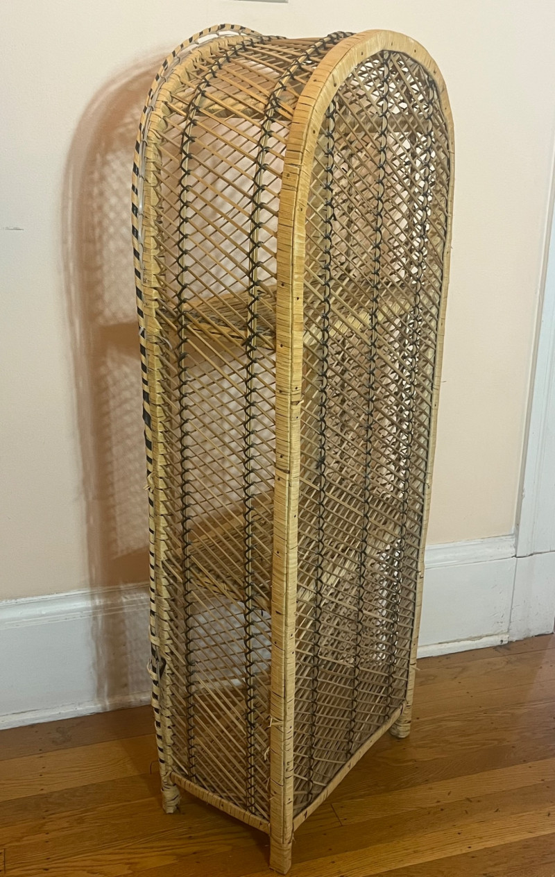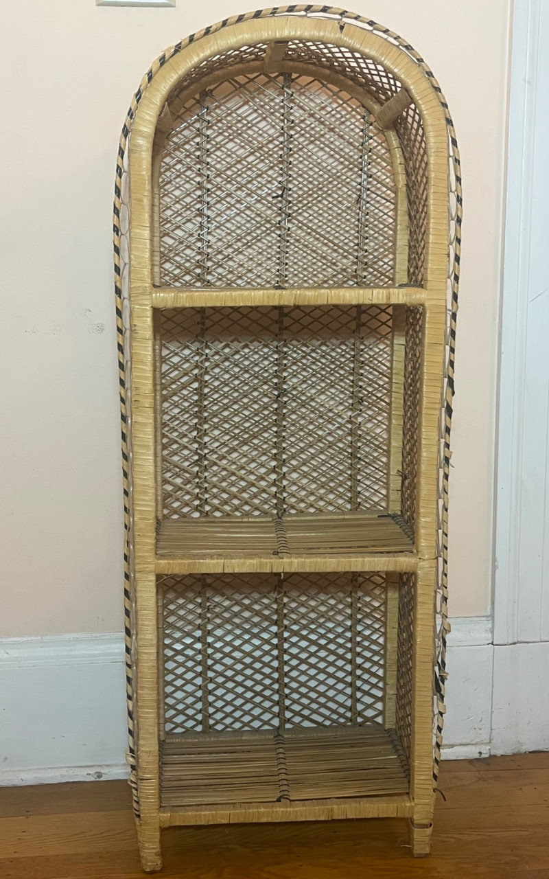Natural Wicker Shelf - 45" tall 45" tall, 9" deep, and 17 1/2" wide. in good condition with only minor cosmetic flaws. See all photos for details regarding condition.