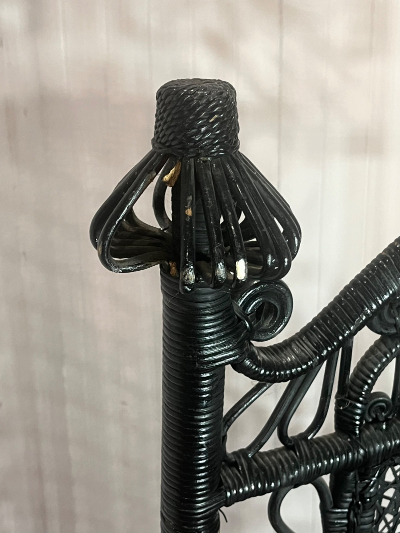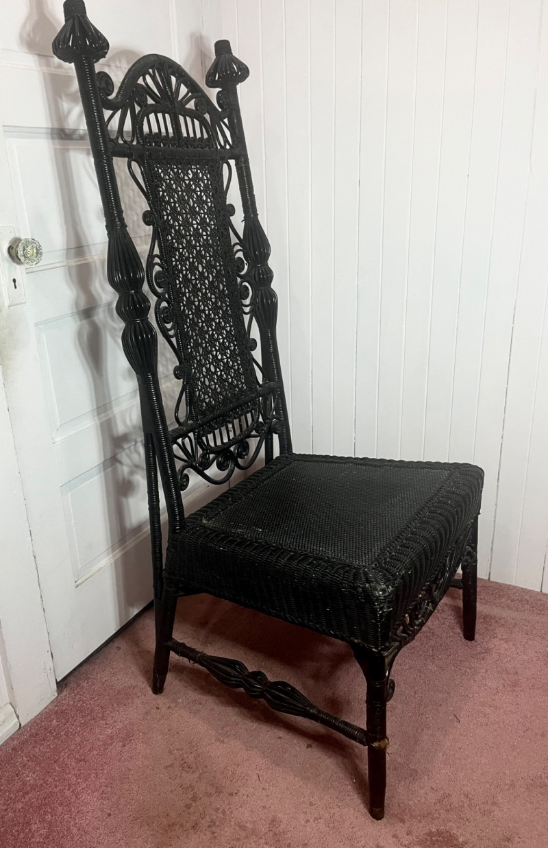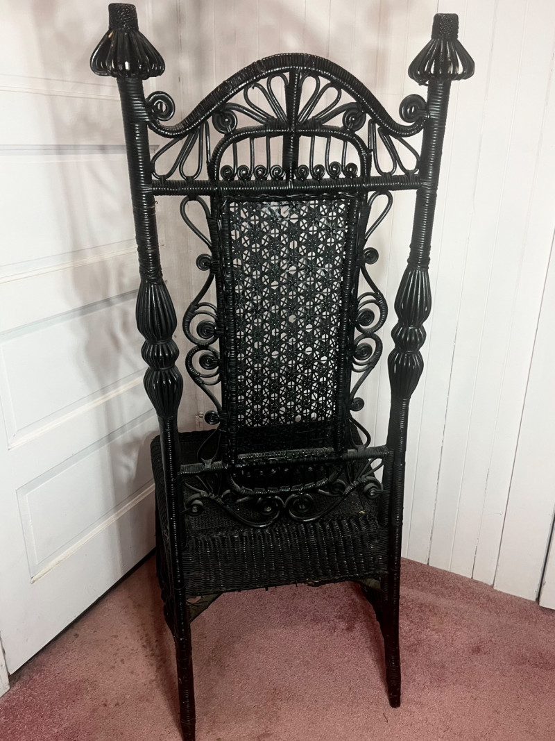 Unique Vintage Black High Back Wicker Chair 54" tall and 23" wide. Chair is sturdy with only cosmetic flaws.