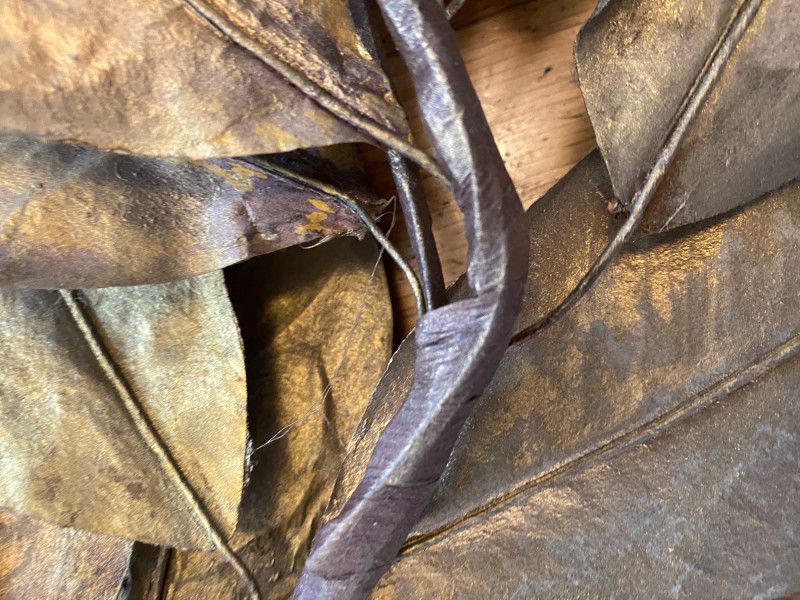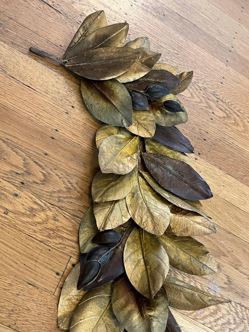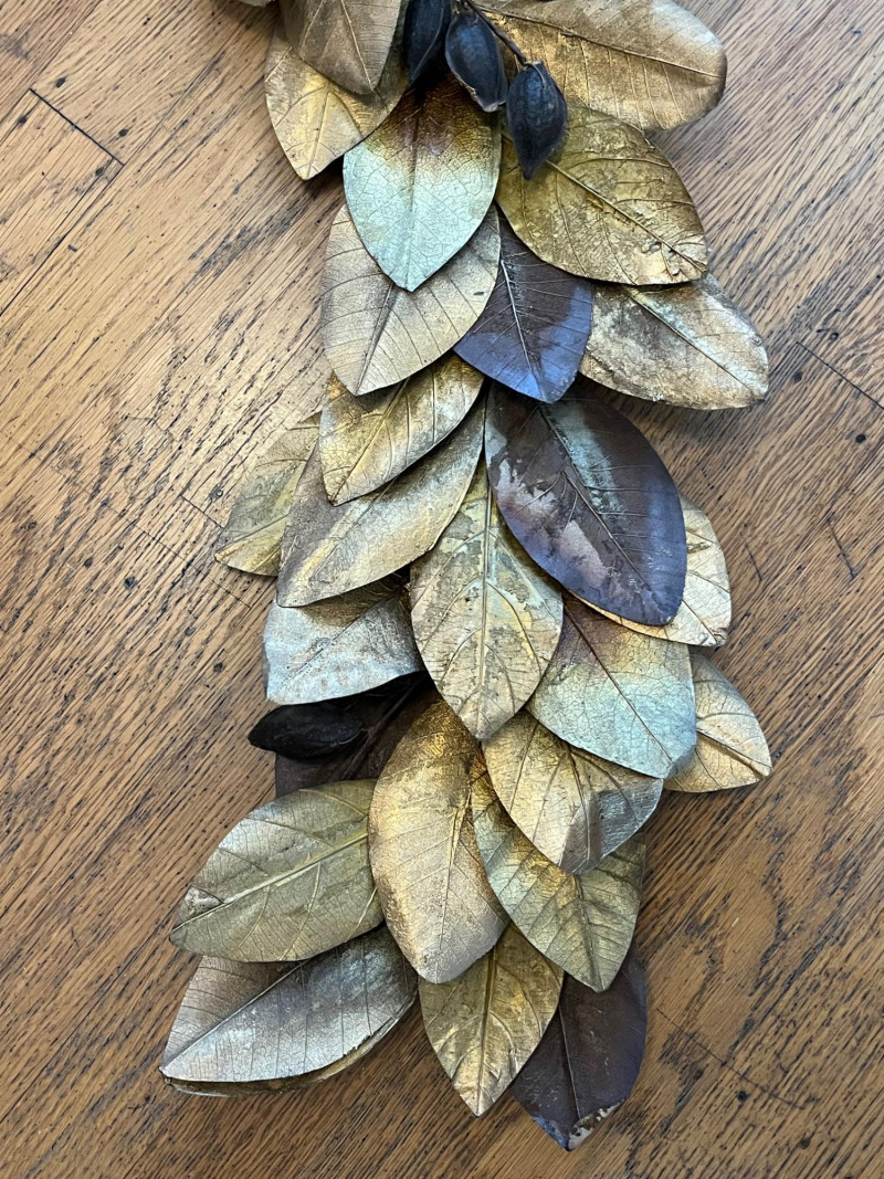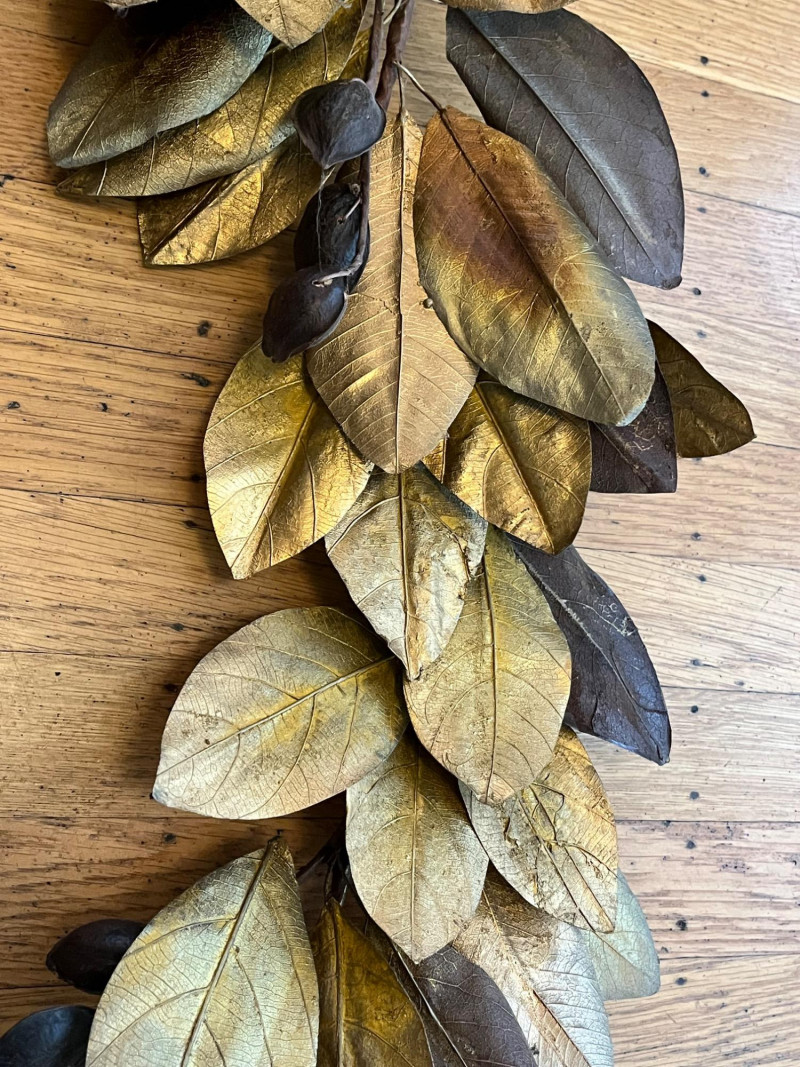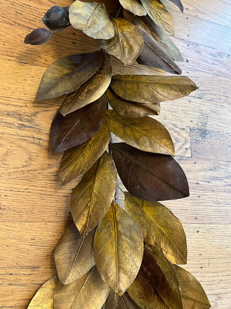 Gold Painted Magnolia Leaves 64” Decorative Garland Swag The leaves look to be real Magnolia leaves, painted gold, and fashioned into a lovely 64" garland or swag.