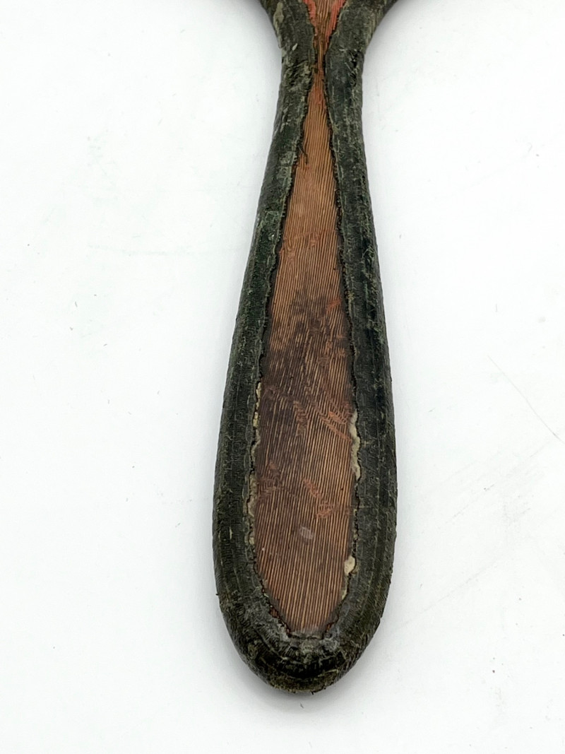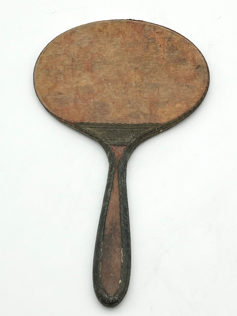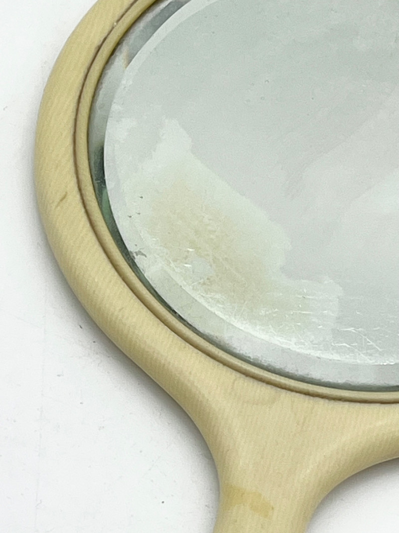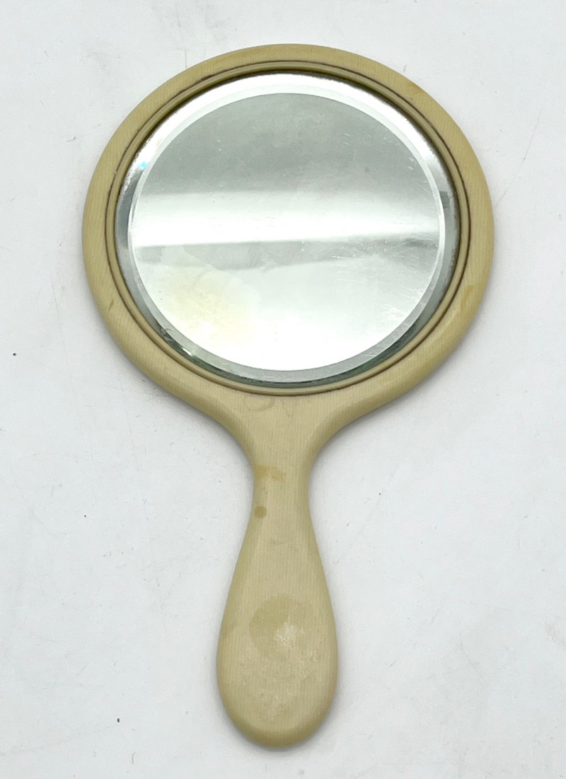 Vintage and Antique Hand Mirrors These range in length from 9" to13" This pale-yellow mirror is made from celluloid, a very early version of plastic. This particular style of celluloid is manufactured to mimic ivory and was popular in the late 1800's. The oval mirror is wood with a cloth/lace overlay but is quite stained. The brass mirror has an ebony handle and dates to the late 1800's.