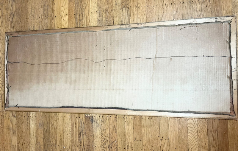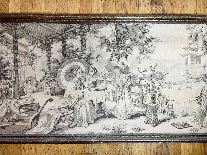 Large Asian Silk Tapestry in Ornate Wood Frame - 57 1/2" x 21" In good condition with no tears, rips, or stains.