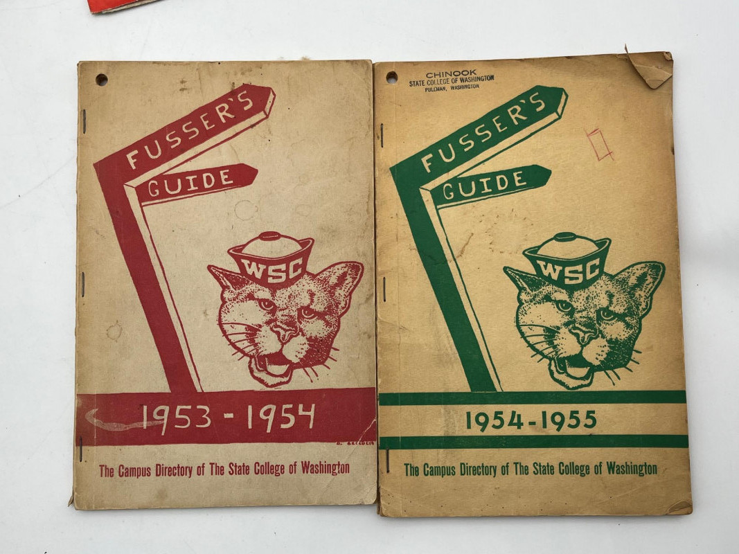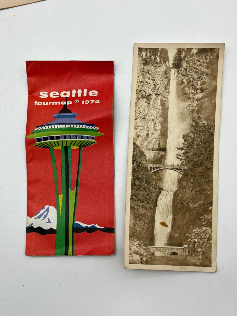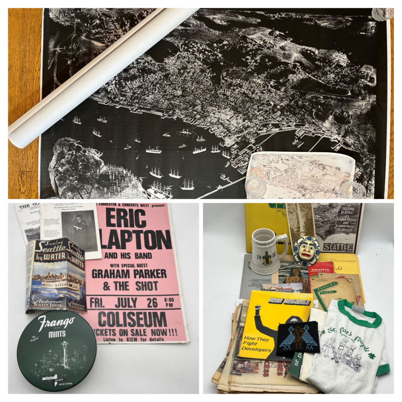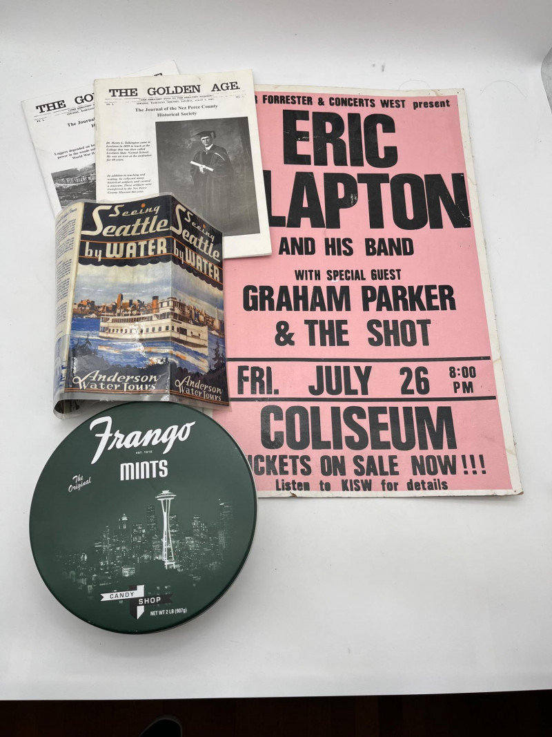 There are at least 6 copies of the large printout of the map of Seattle (rolled up) in addition to the one shown rolled out. The lot includes a 1952 copy of the University of Idaho yearbook, an antique photo of Multinoma Falls, campus directories (AKA the "Fusser's Guide") for WSU, c. 1953 and 1954), a poster advertising Eric Clapton's July 26, 1985 concert at the Seattle Coliseum, a Frango Mints tin, and much more!