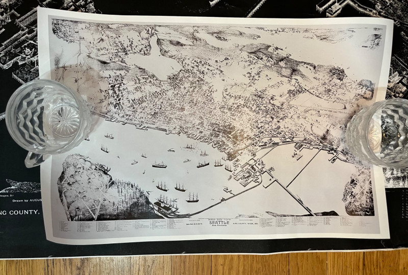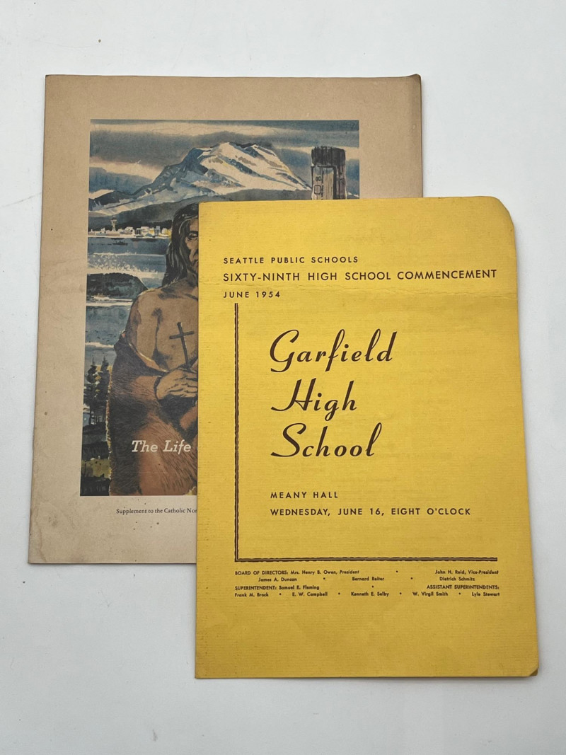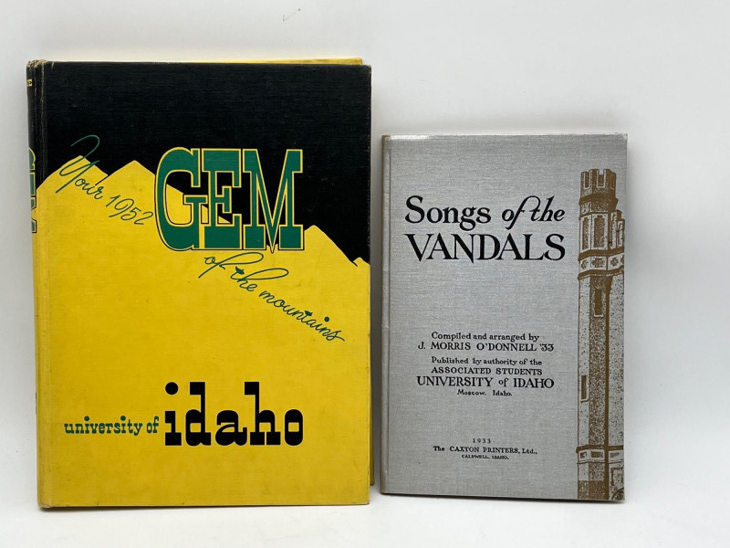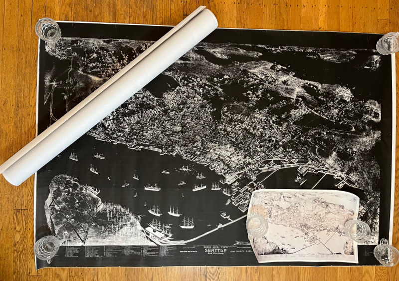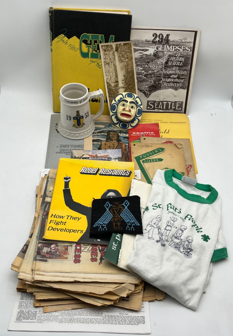 There are at least 6 copies of the large printout of the map of Seattle (rolled up) in addition to the one shown rolled out. The lot includes a 1952 copy of the University of Idaho yearbook, an antique photo of Multinoma Falls, campus directories (AKA the "Fusser's Guide") for WSU, c. 1953 and 1954), a poster advertising Eric Clapton's July 26, 1985 concert at the Seattle Coliseum, a Frango Mints tin, and much more!