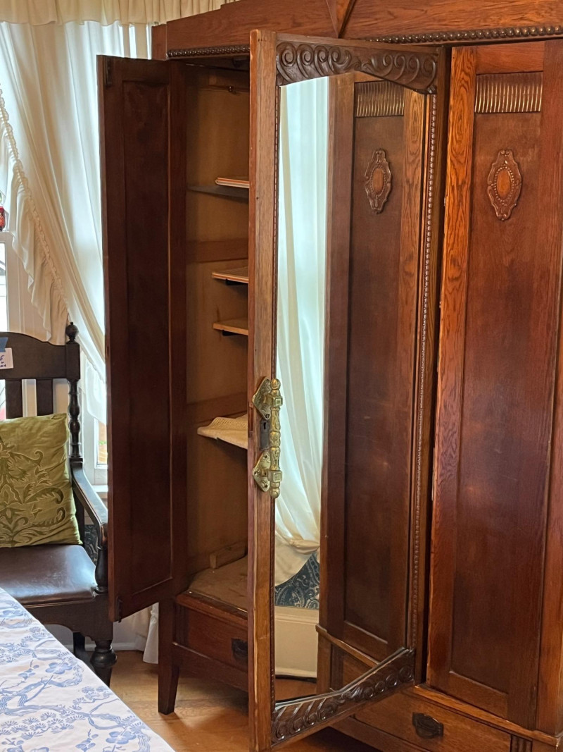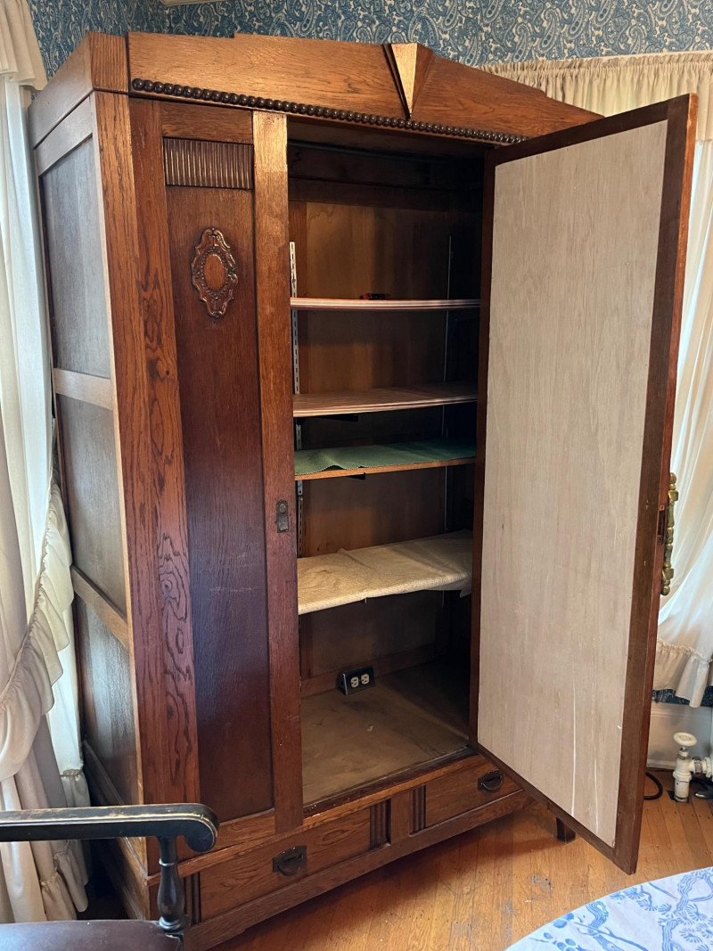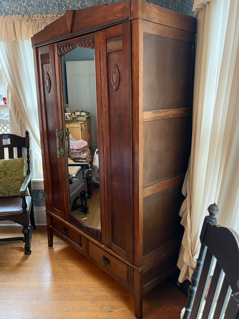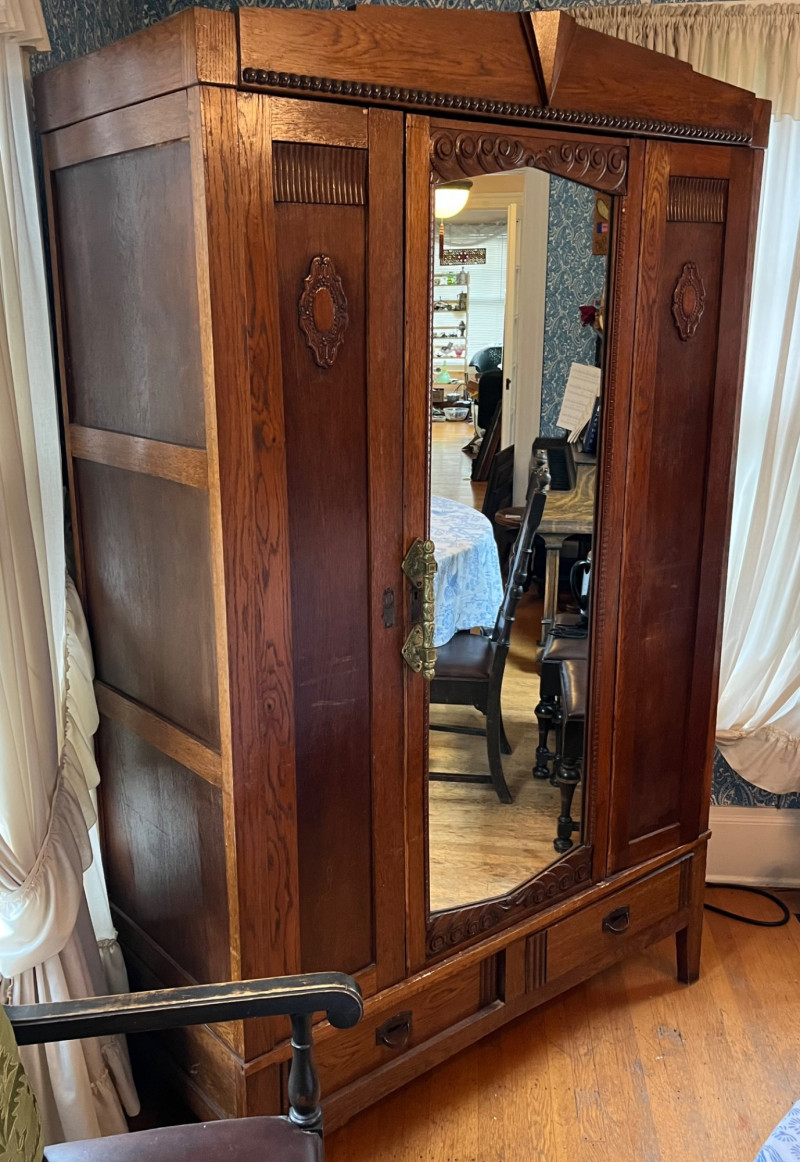 Wardrobe Cabinet Converted to Include Shelves 82" tall, 50" wide and 22" deep. Inside measures 63" tall. The mirrored door is in good condition but has a handle that does not look original to the piece. There is an outlet inside but it has not been tested. The shelves are lined with either a wrapping paper or non-slip mat that can be removed. The shelves themselves are an addition to the original piece and can be removed so that the hanging rod can be used.