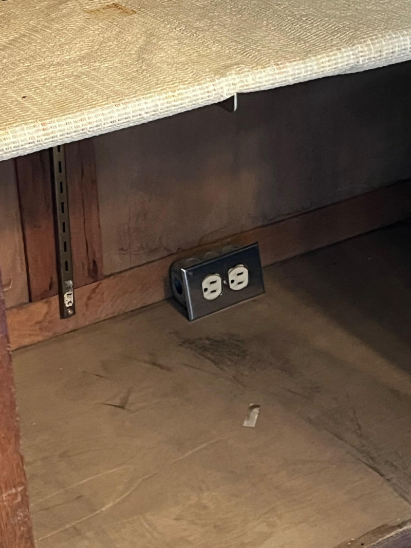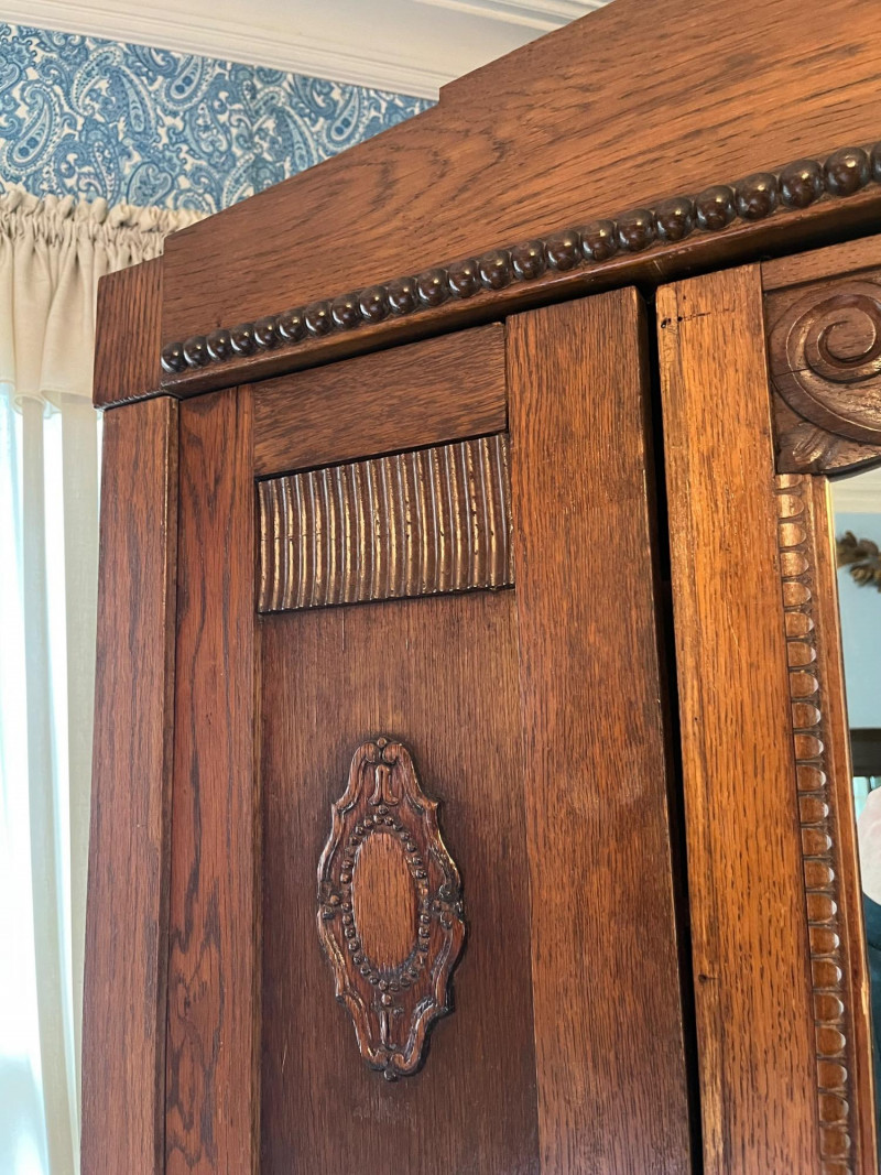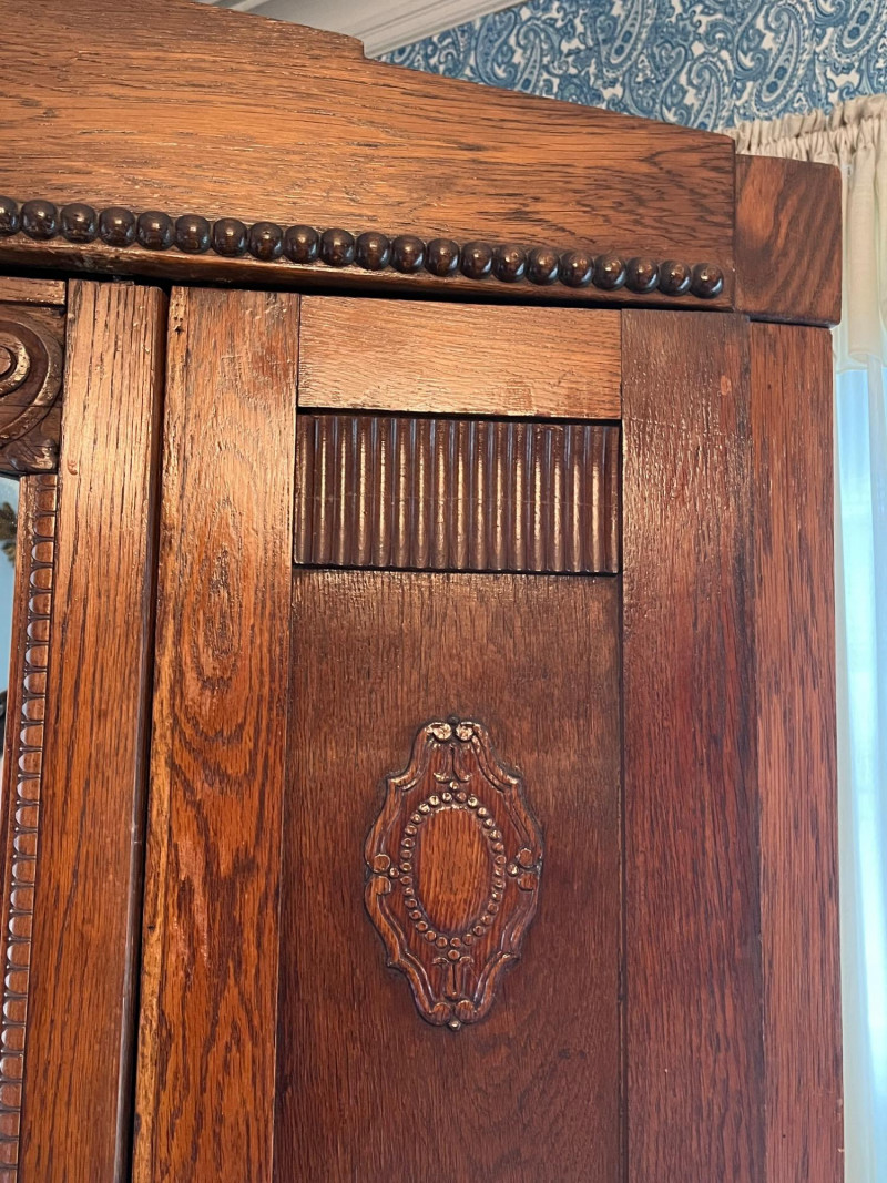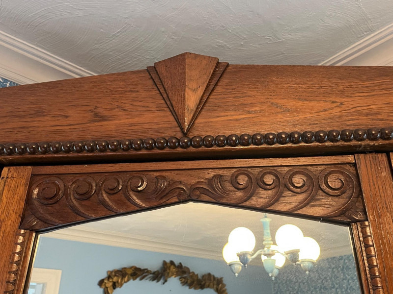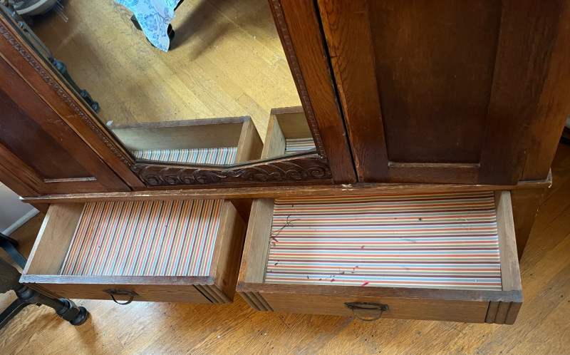 Wardrobe Cabinet Converted to Include Shelves 82" tall, 50" wide and 22" deep. Inside measures 63" tall. The mirrored door is in good condition but has a handle that does not look original to the piece. There is an outlet inside but it has not been tested. The shelves are lined with either a wrapping paper or non-slip mat that can be removed. The shelves themselves are an addition to the original piece and can be removed so that the hanging rod can be used.