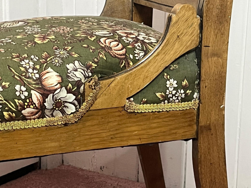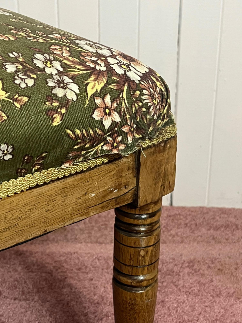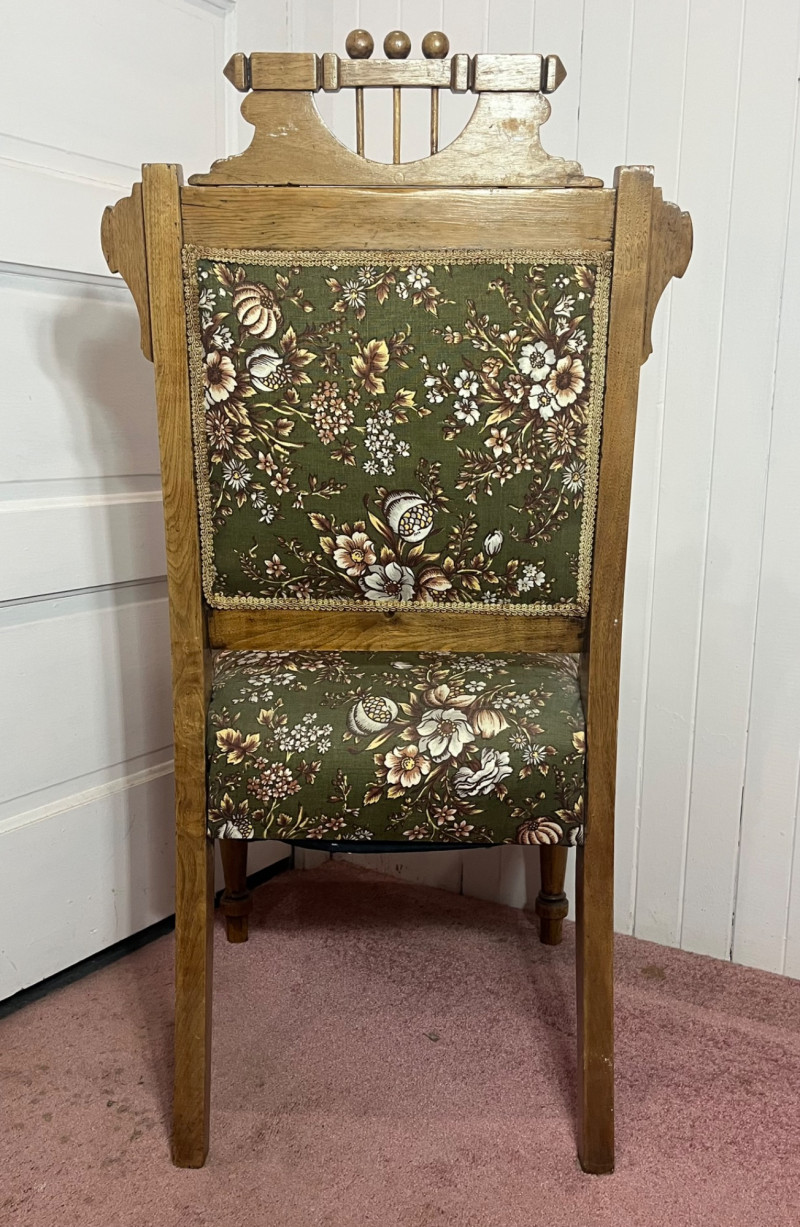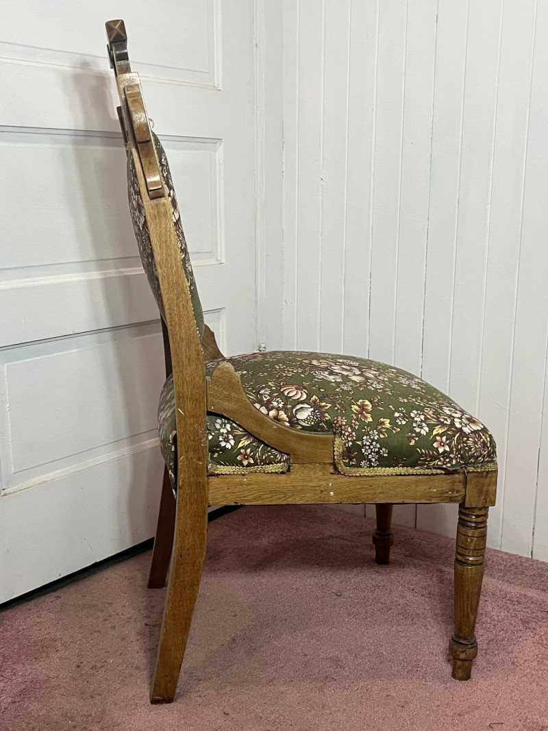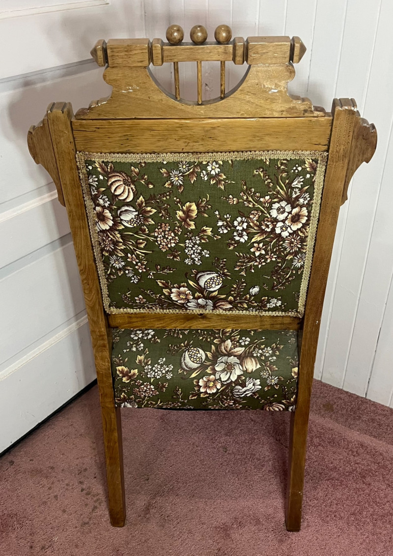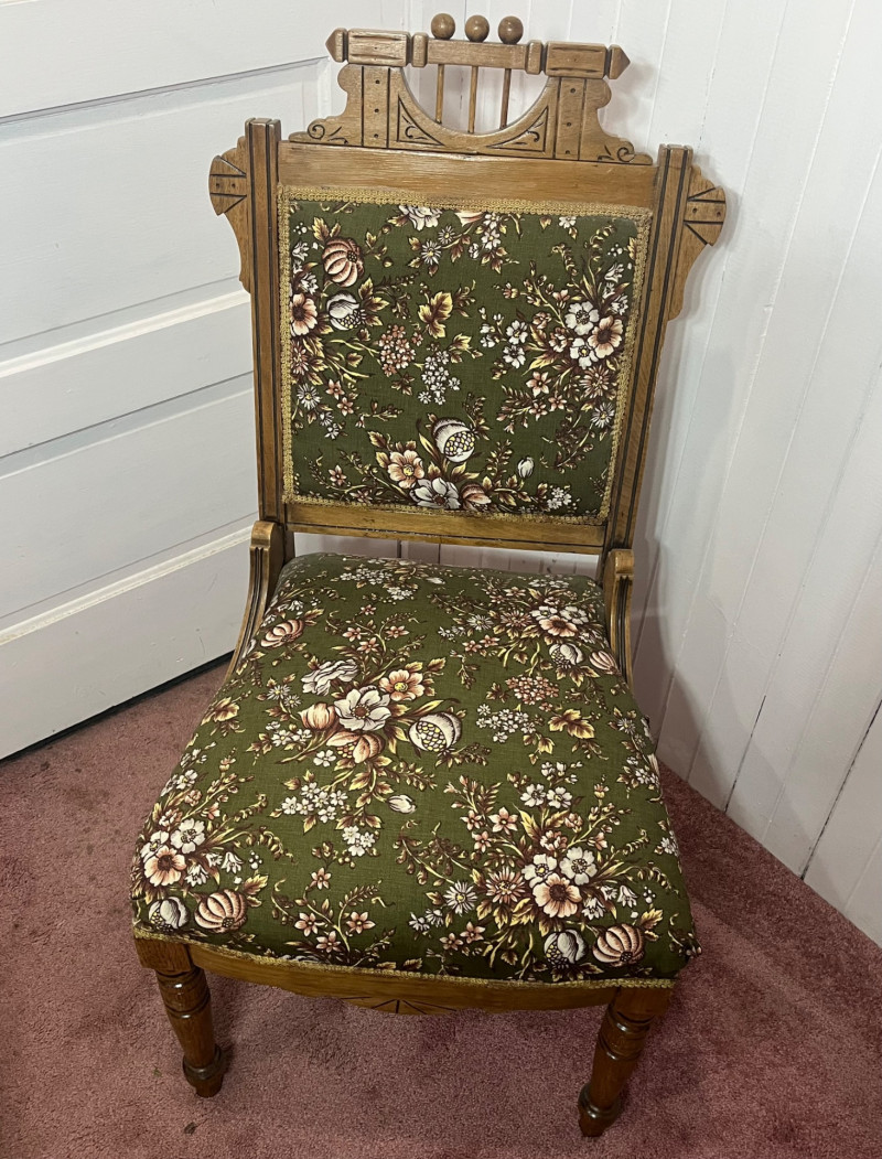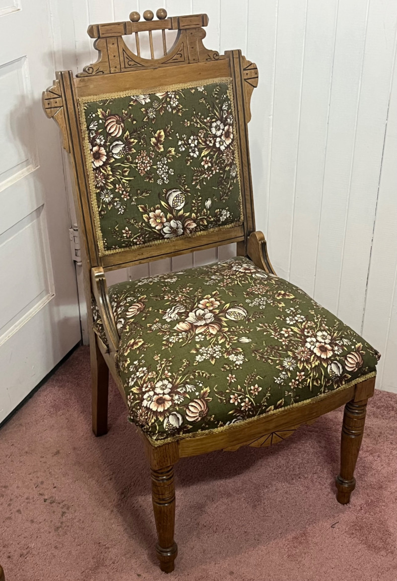 Victorian Eastlake Styled Chair with Green Floral Print Upholstery 38" tall and 19" wide The chair is in good vintage condition with minor cosmetic flaws. Please see all photos to see details and condition.