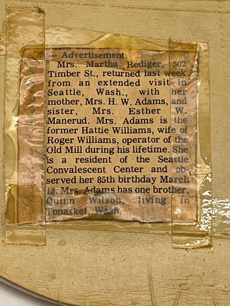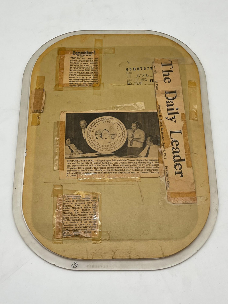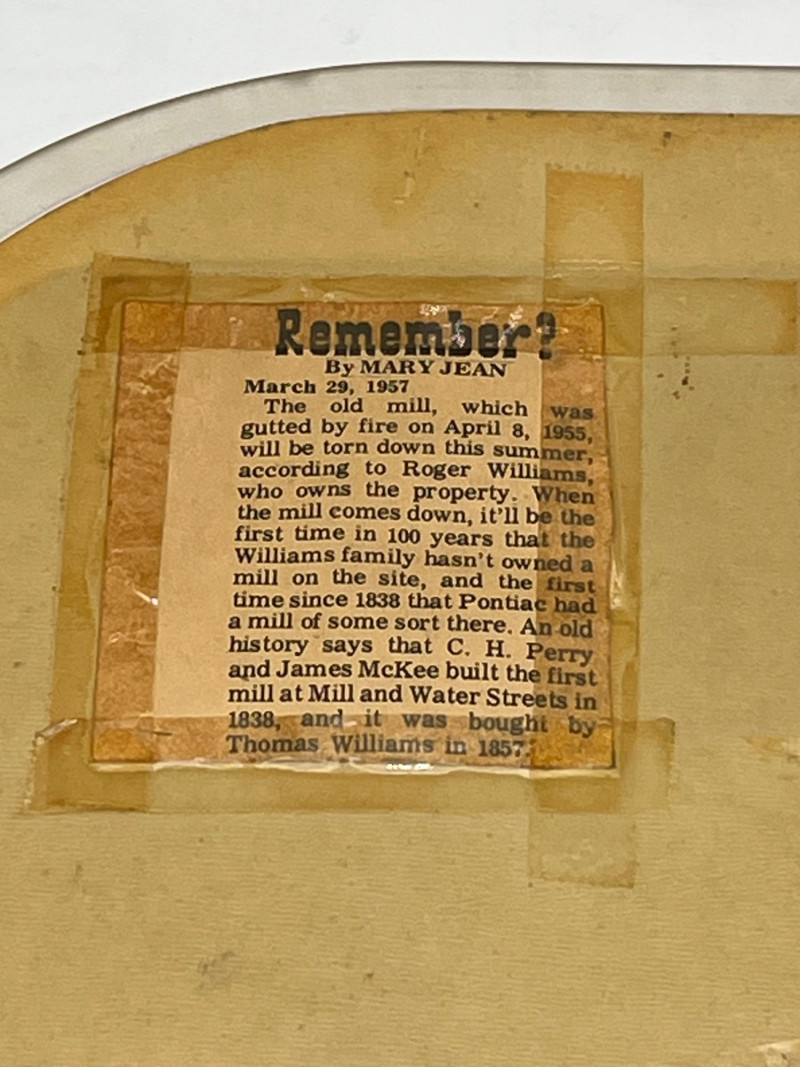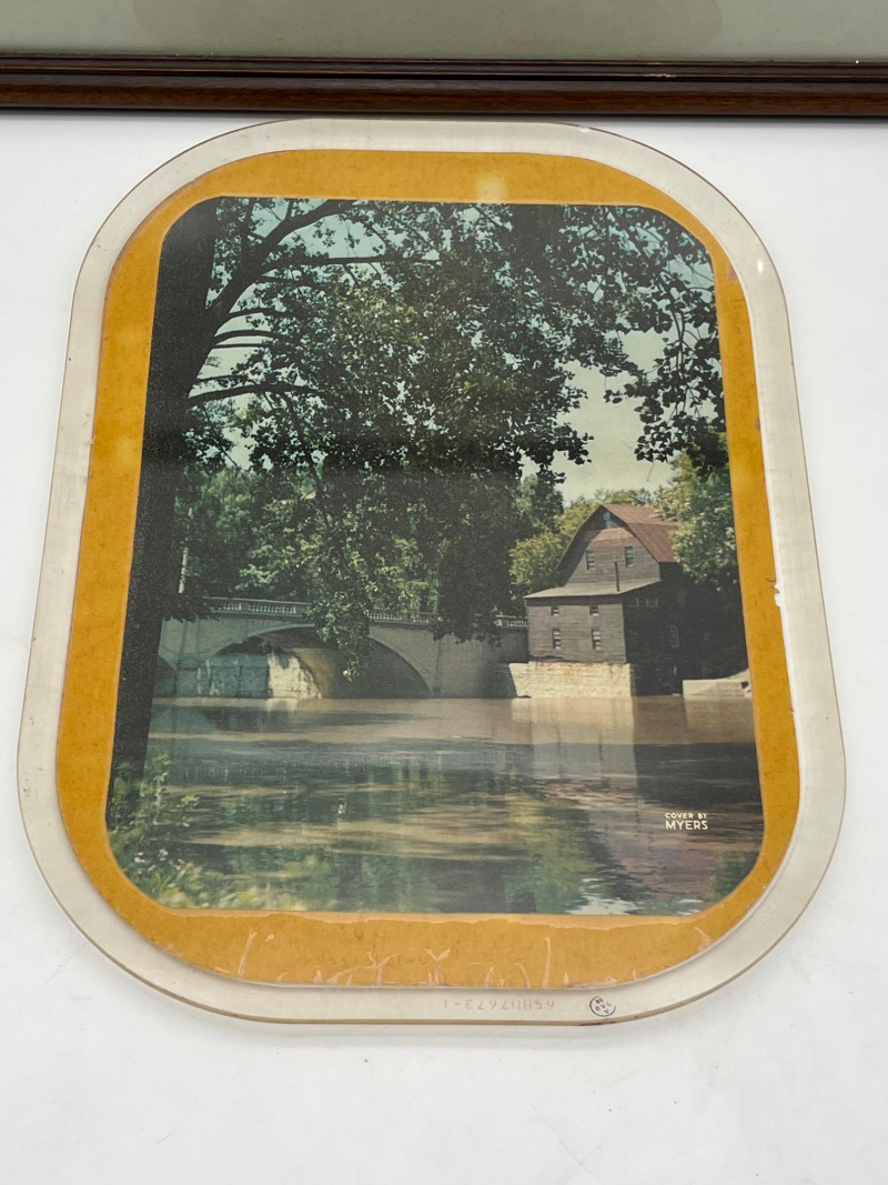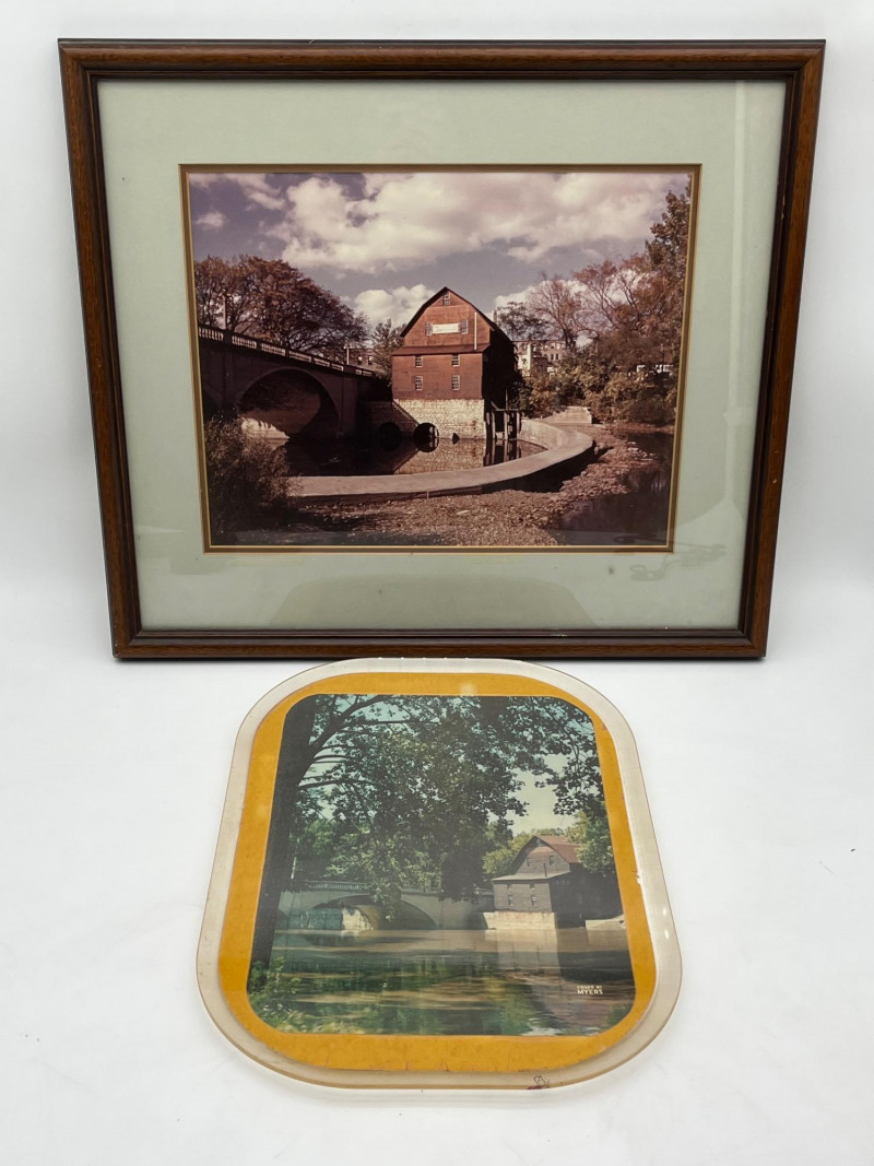 The Old Mill Framed Photograph and Print in Plastic Tray The large, framed piece measures 17 1/2" tall and 20 1/4". The smaller piece is 15 1/4" tall and 11" wide. The smaller piece has some newspaper clippings on the back explaining its significance to this family.