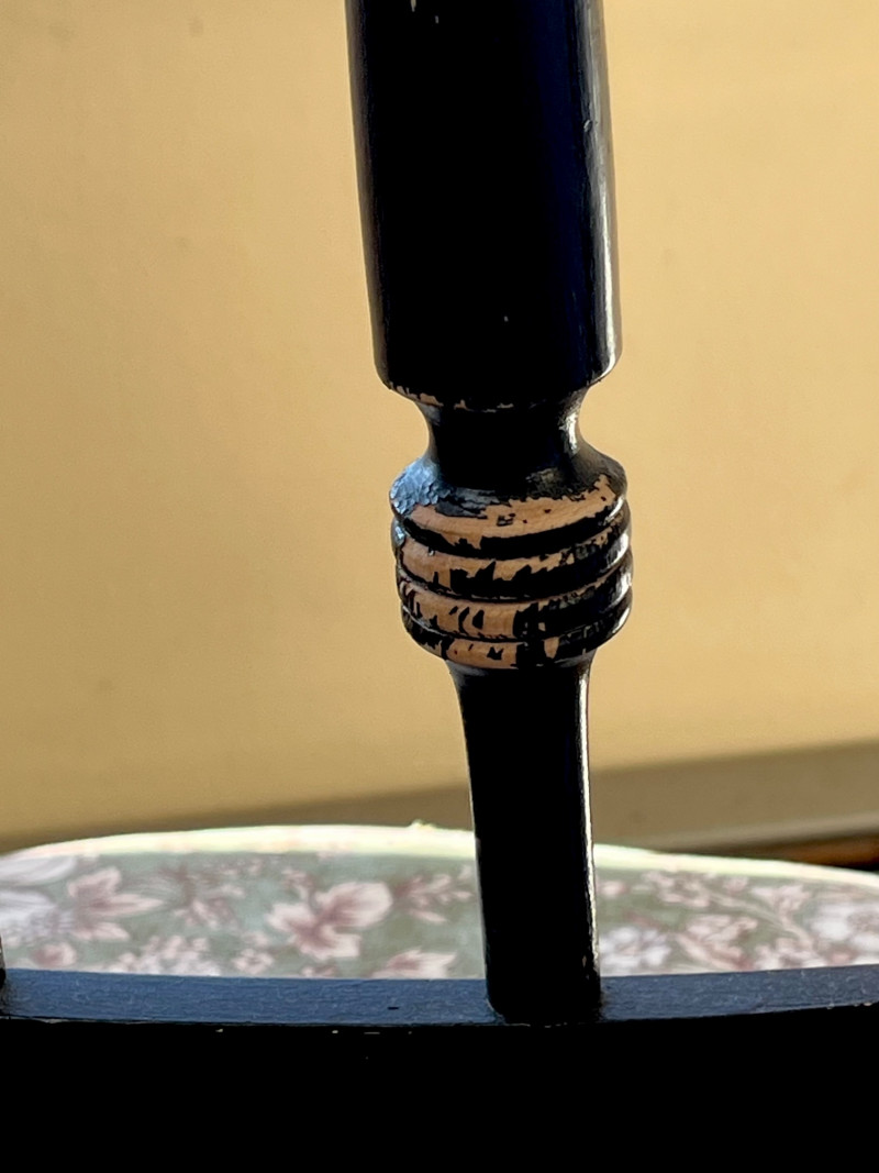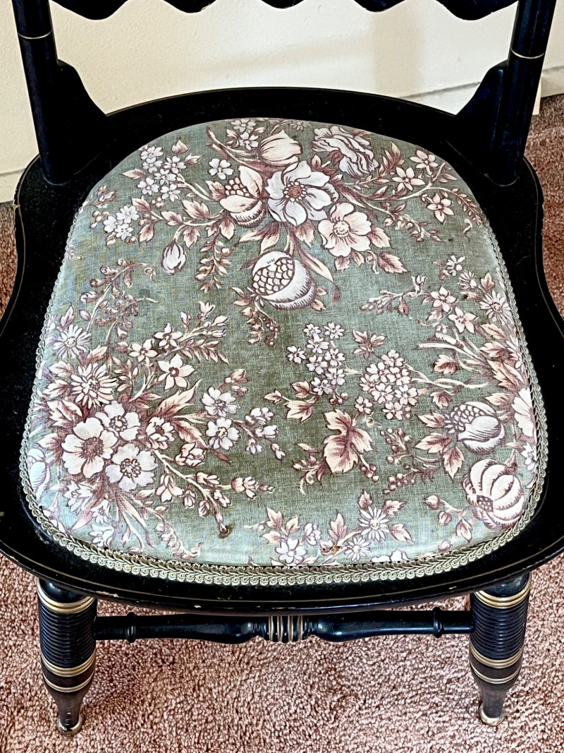 Black & Gold High Arrow Back Stenciled Wooden Hitchcock Styled Chair 43 1/2" tall at the back and 18" wide. Please see photo closeups to see details regarding condition. The upholstery does have stains and the chair does have wear to the painted finish.