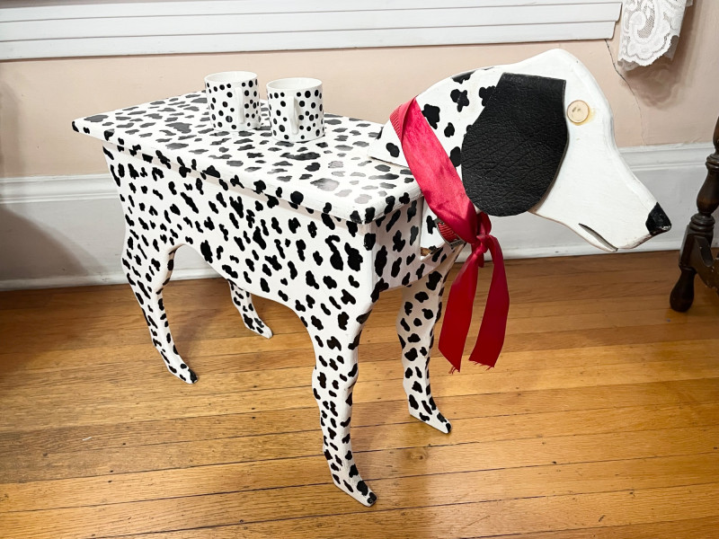 Dalmation Shaped and Painted Accent Table 21 1/2" tall to the top of the head, 38" from nose to tail, and the tabletop measures 9" x 21". This dude is missing an eye on one side and his neck is loose. Included are two small Dalmation spotted mugs to complete the look.