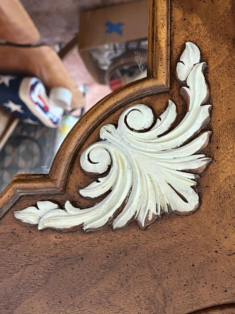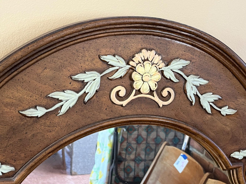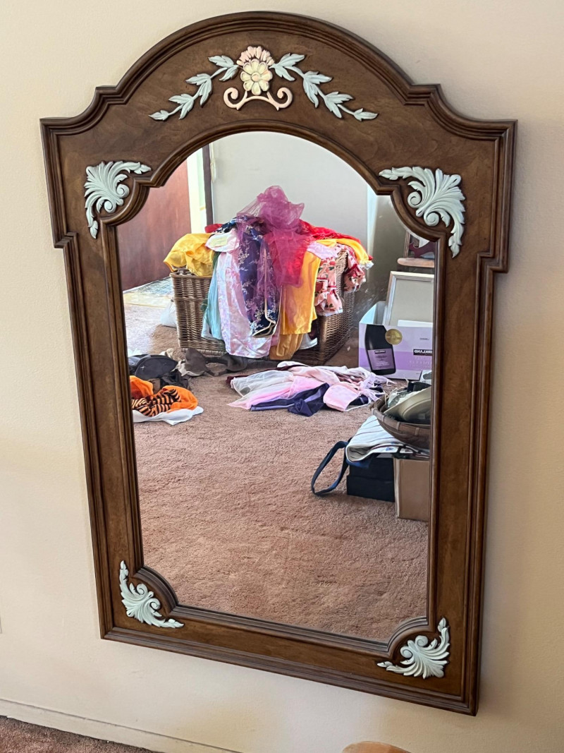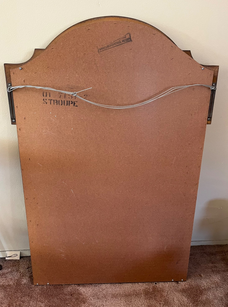 Large Wood Framed Wall or Dresser Mirror Measures 48" tall and x 32" wide. The mirror is in good condition and has a heavy-duty wire hanger as it is quite heavy.