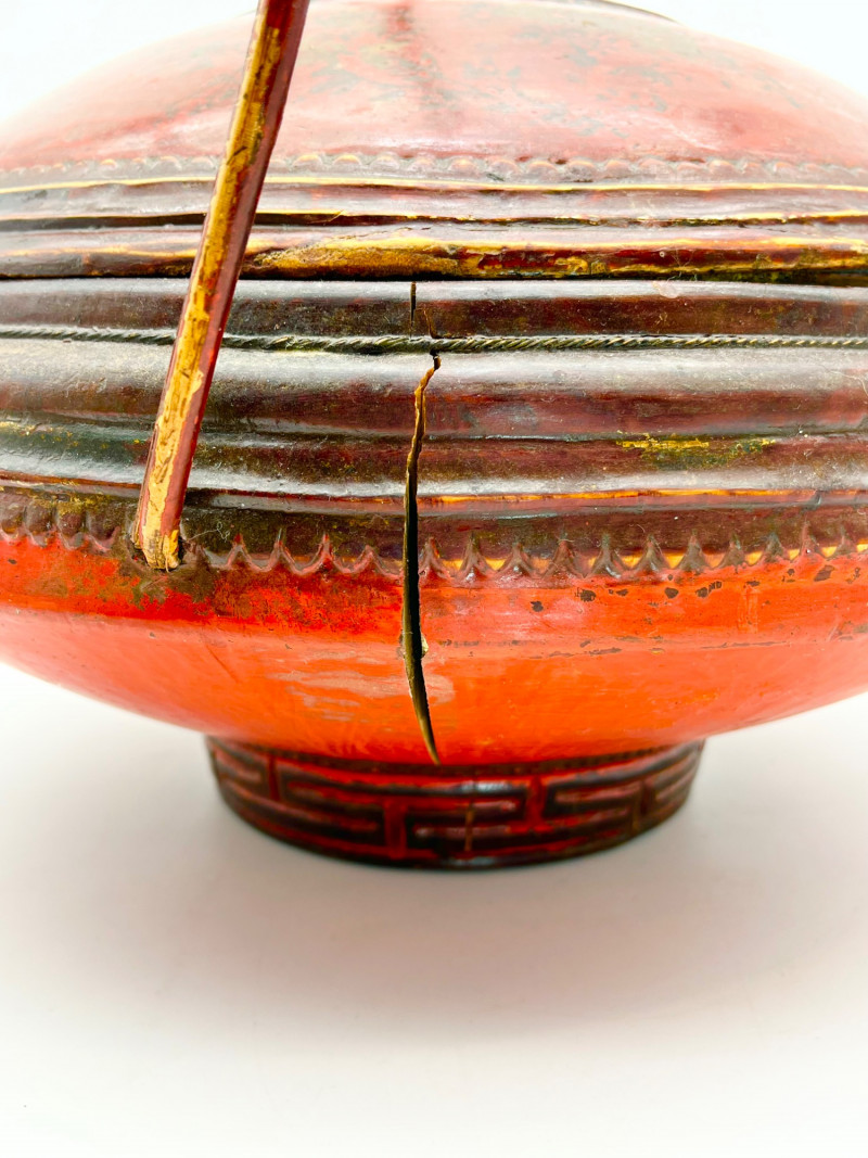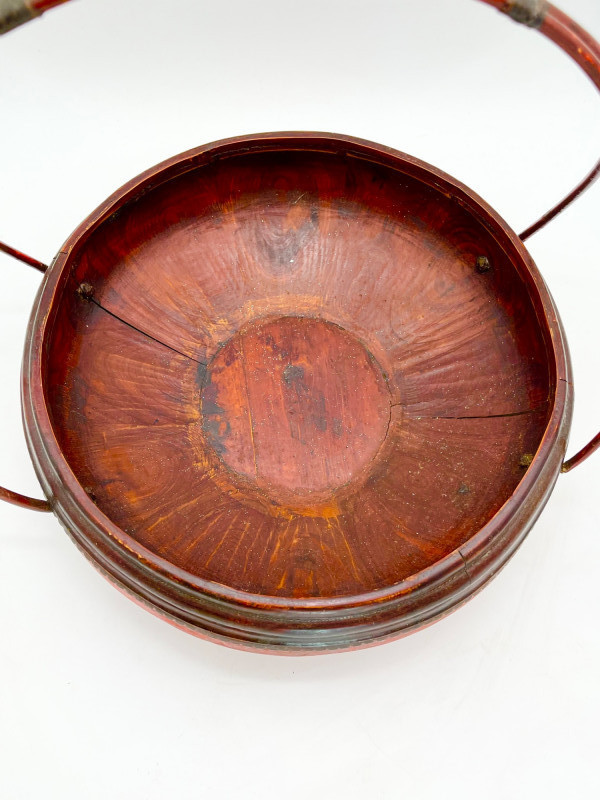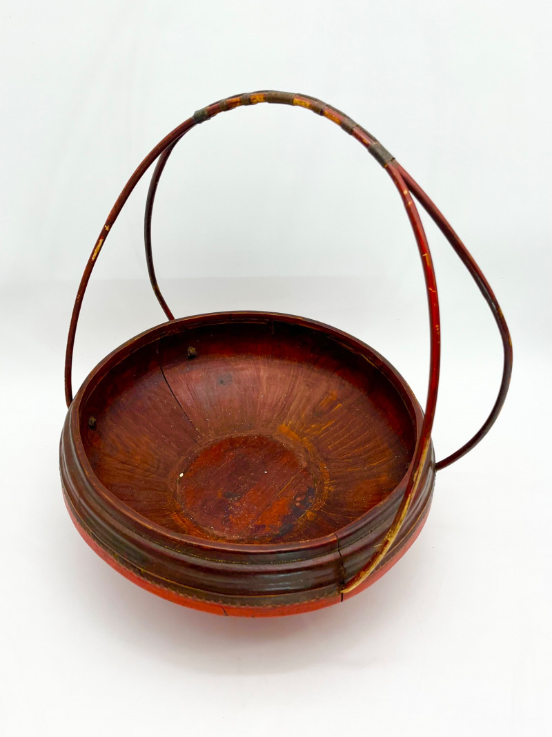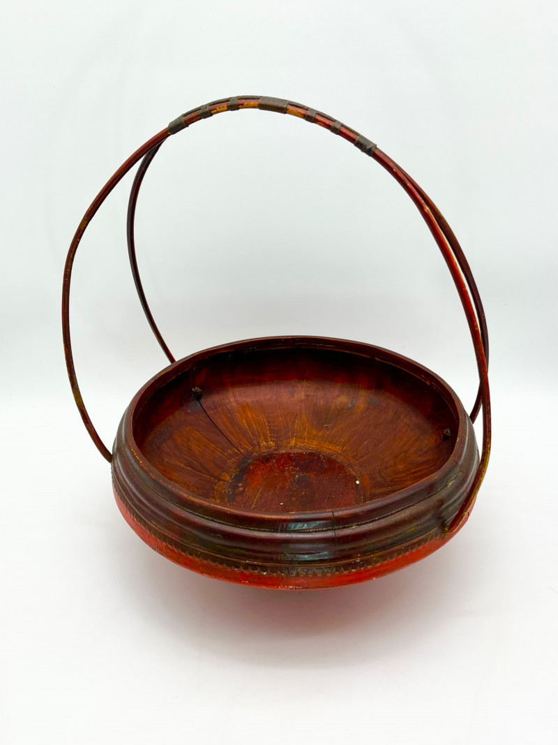Chinese Lacquered Wood Wedding Basket 16" tall to top of handle and 13" across. Note that the bottom is cracked.
