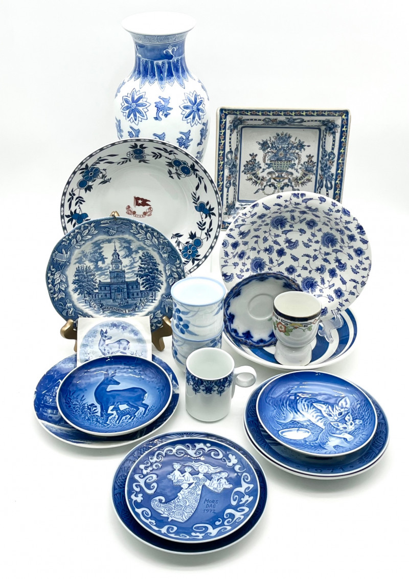 Blue & White China Lot Feat. Titanic White Star Line Reproduction Bowl This lot includes 7 royal Copenhagen decorative plates (3 Mother's Day and 4 Christmas), a collectible Independence Hall Bicentennial plate, a Chinese Imari bowl and 10" tall vase and more! All pieces are in good vintage condition with the exception of one cup that has a chip and crack which I show close up in photos.