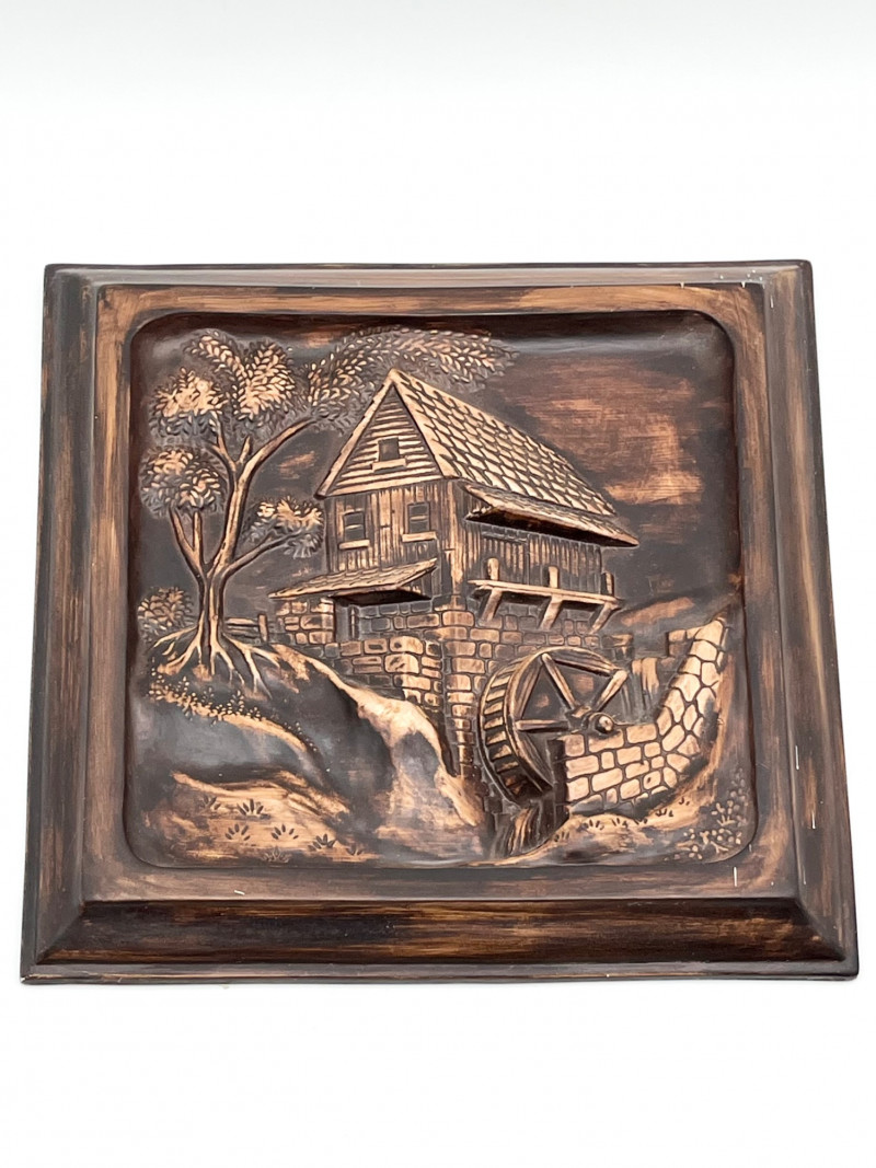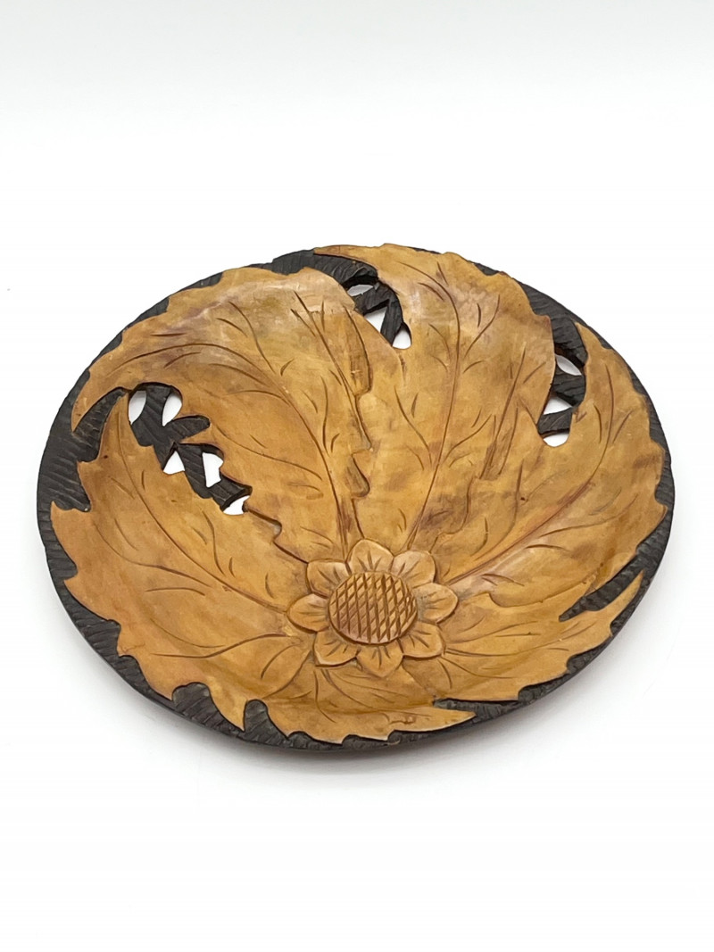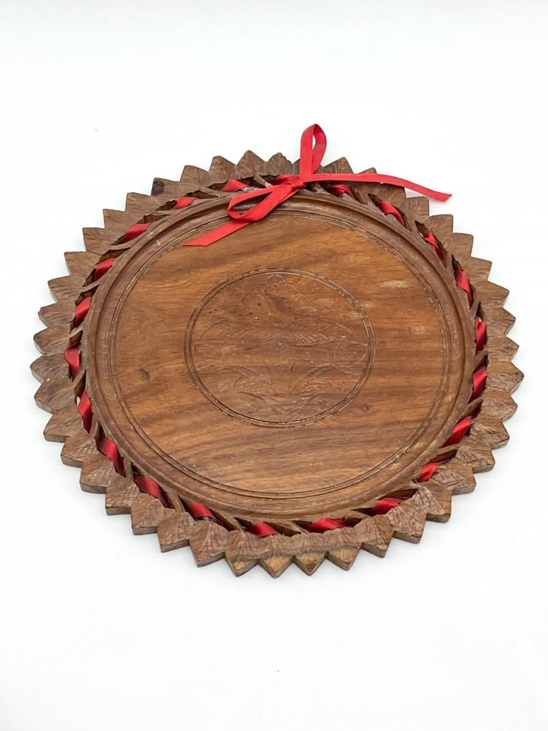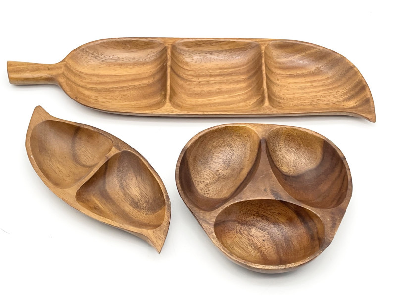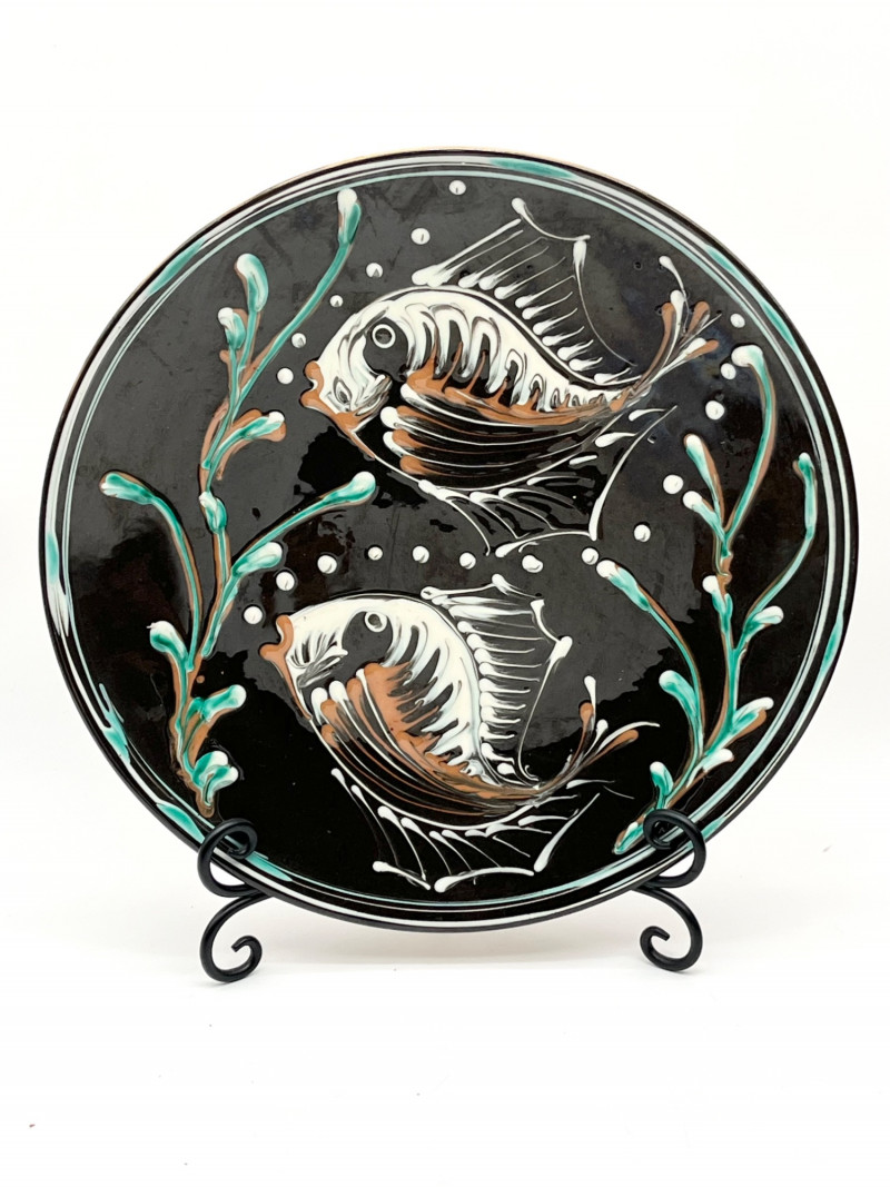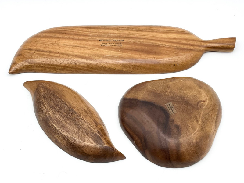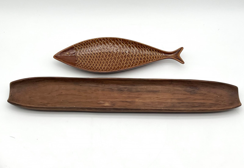 Earthtone Wood and Stoneware Lot For size perspective, the ceramic plate with fish painted is 12" across and longest (wood) tray is 20" long.