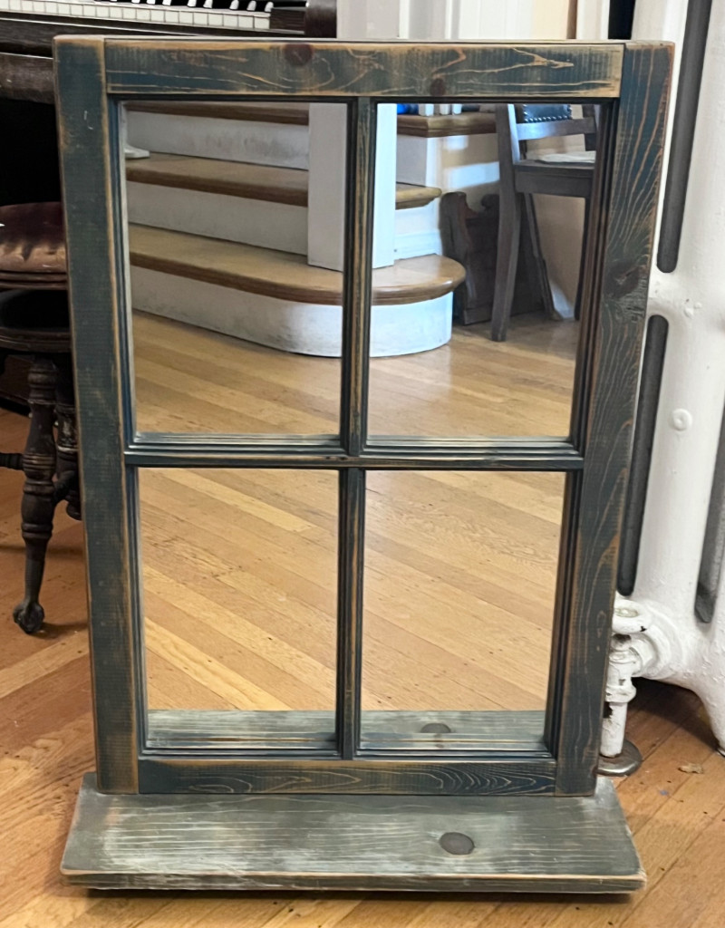 Window Framed Mirror with Shelf - 20" x 30 1/2" The shelf is about 6" deep. The frame is a weathered green.