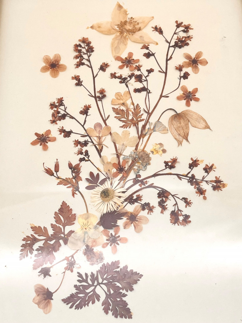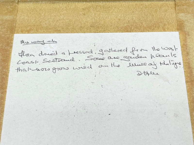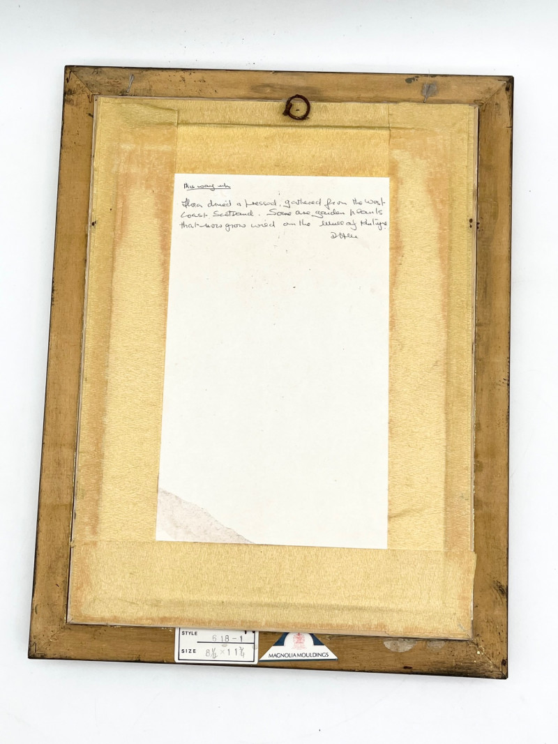 Framed Dried Flowers in Ornate Gold Frame - 11 3/4" x 15" In very good condition and includes a note on the back about where the flowers were gathered.