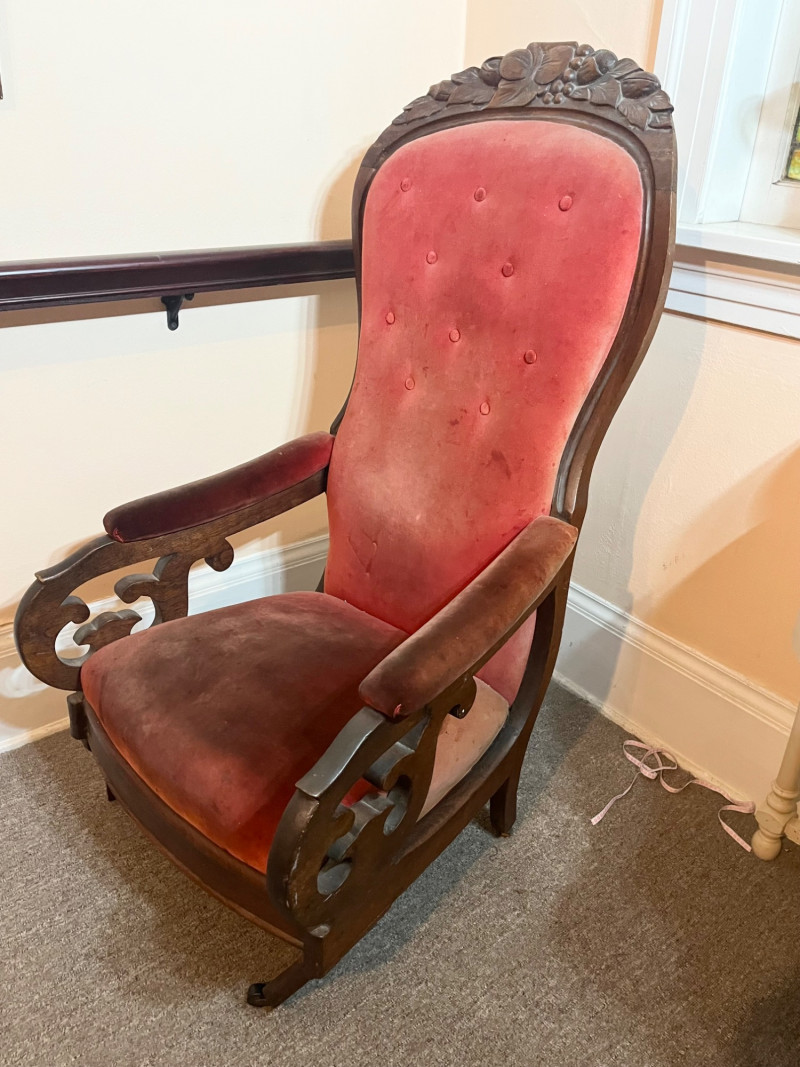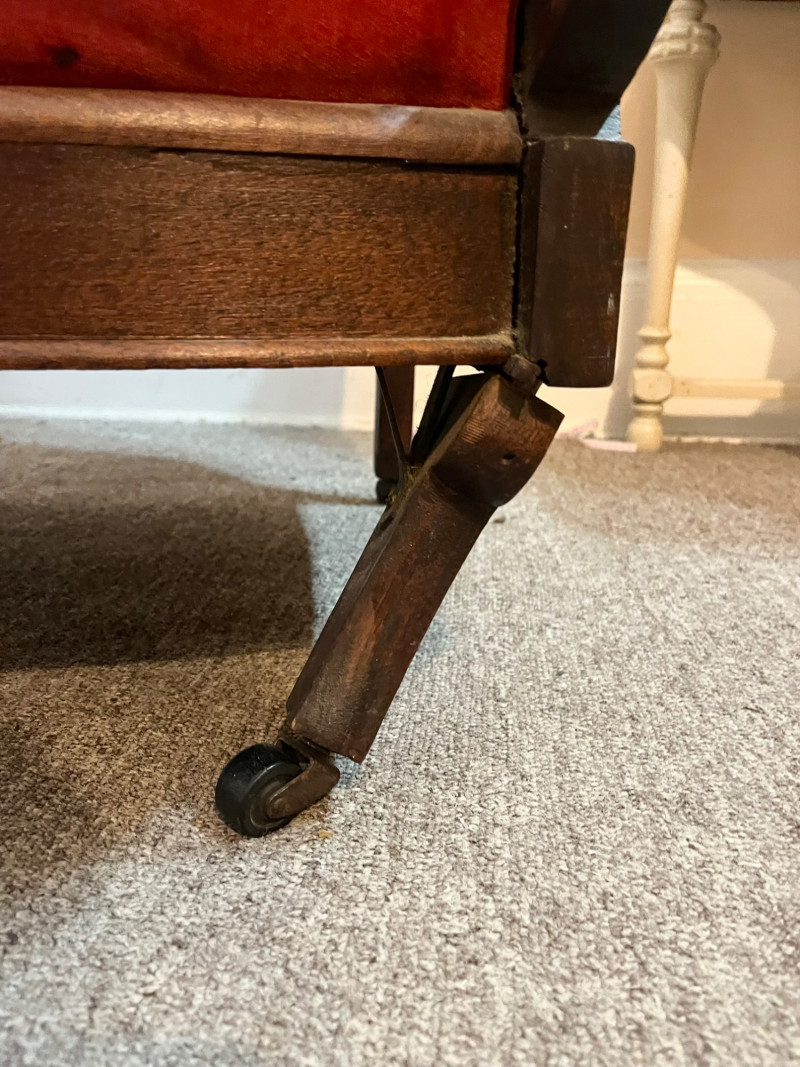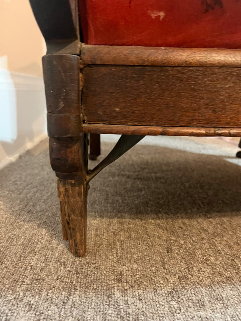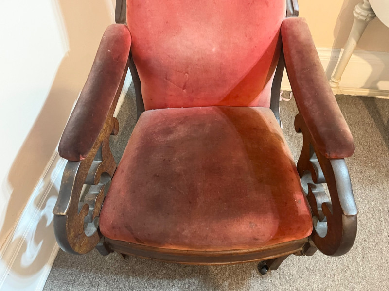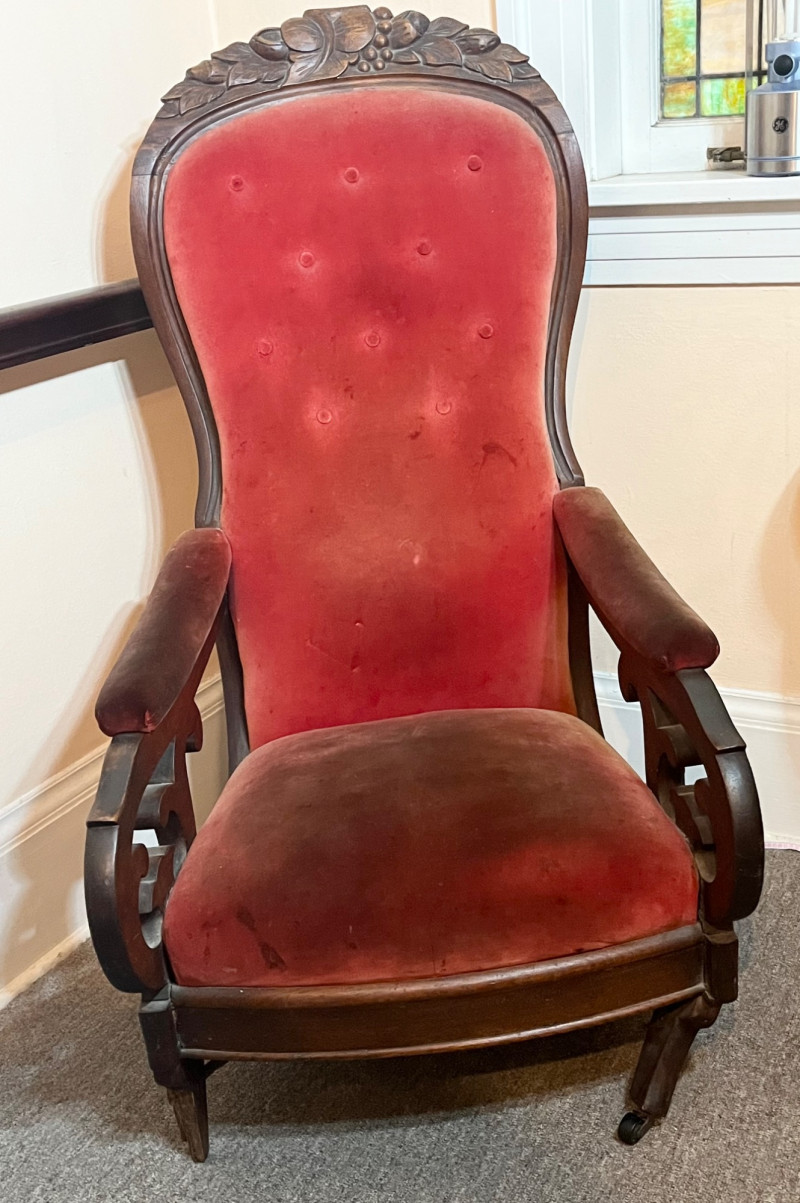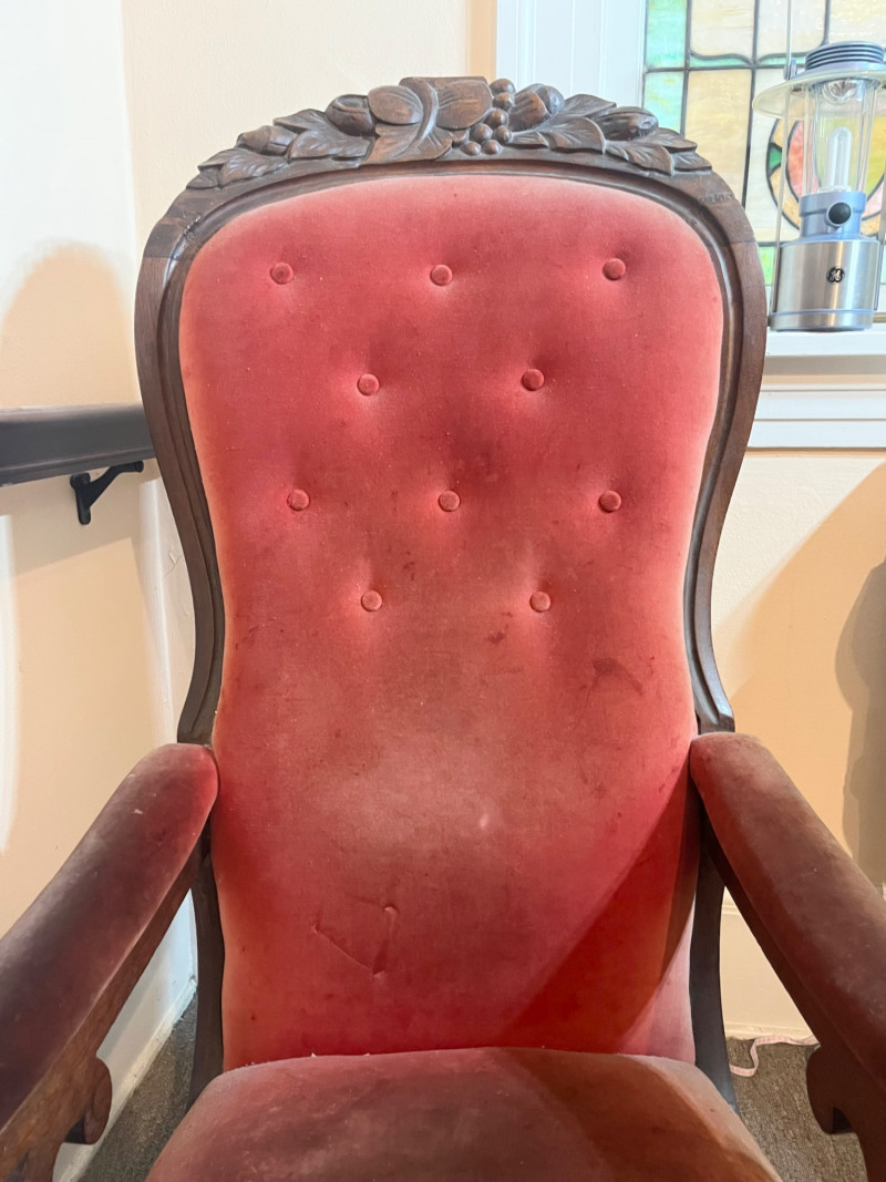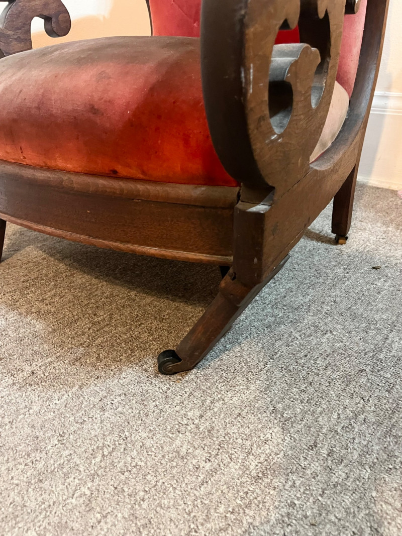 Carved Walnut Victorian Era Chair For Restoration - SEE PHOTOS The wood of the majority of the chair is in good condition but the two front legs need to be replaced. The red velvet upholstery has no tears that I see but there is extensive staining and fading on the back.