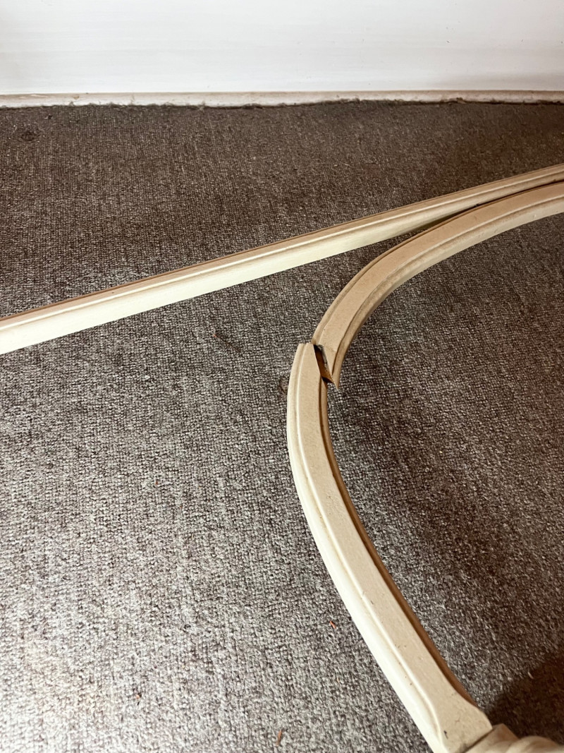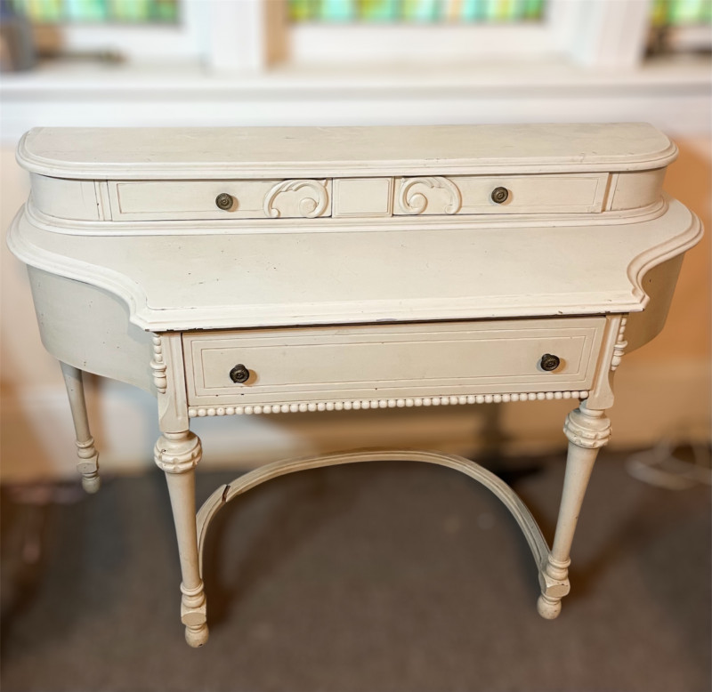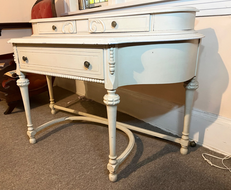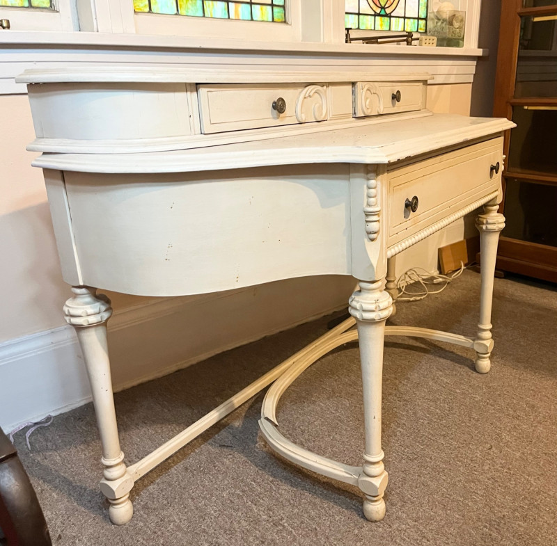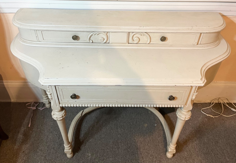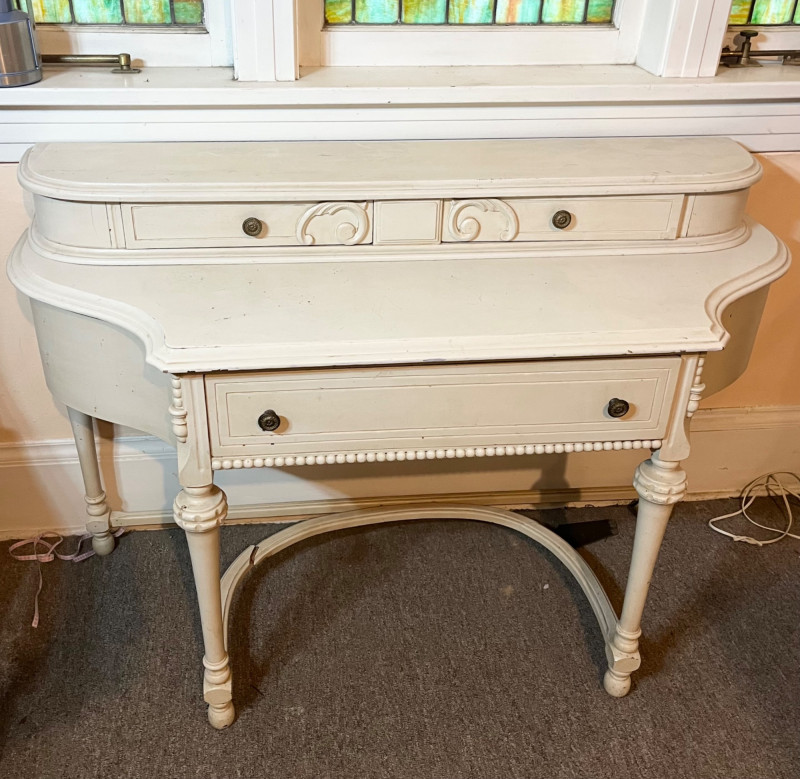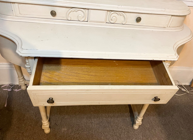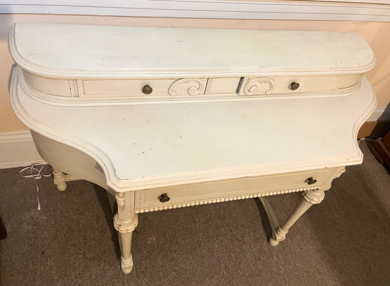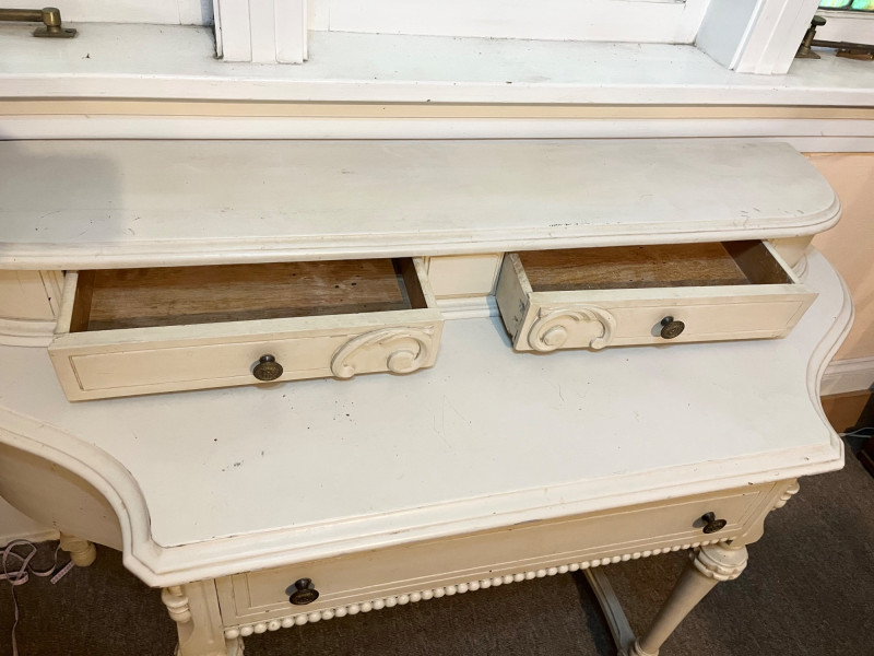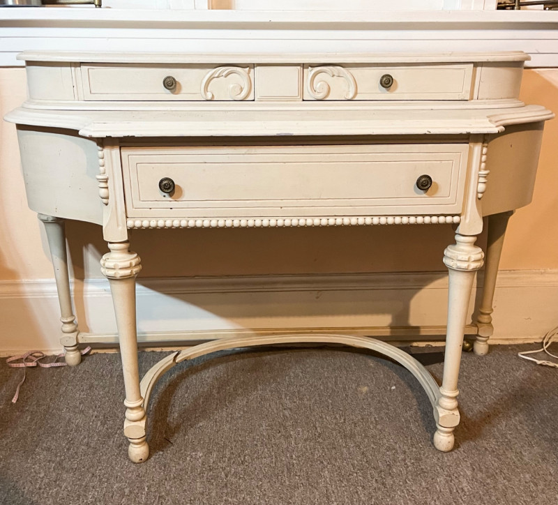 White French Provincial Styled Dressing Table - SEE ALL PHOTOS Measures 47" long, 31" tall, and 19" deep (from front to back). Note that one of the pieces at the bottom is broken. See last photo for closeups. The top two drawers are removeable from the main piece which adds to its versatility. This would make a great vanity, hall table, or even desk! The finish does have some scuffs and minor dents.