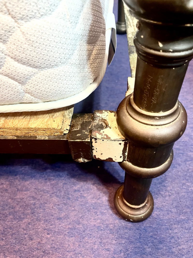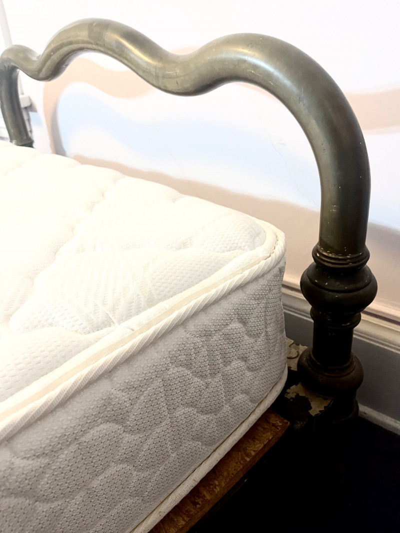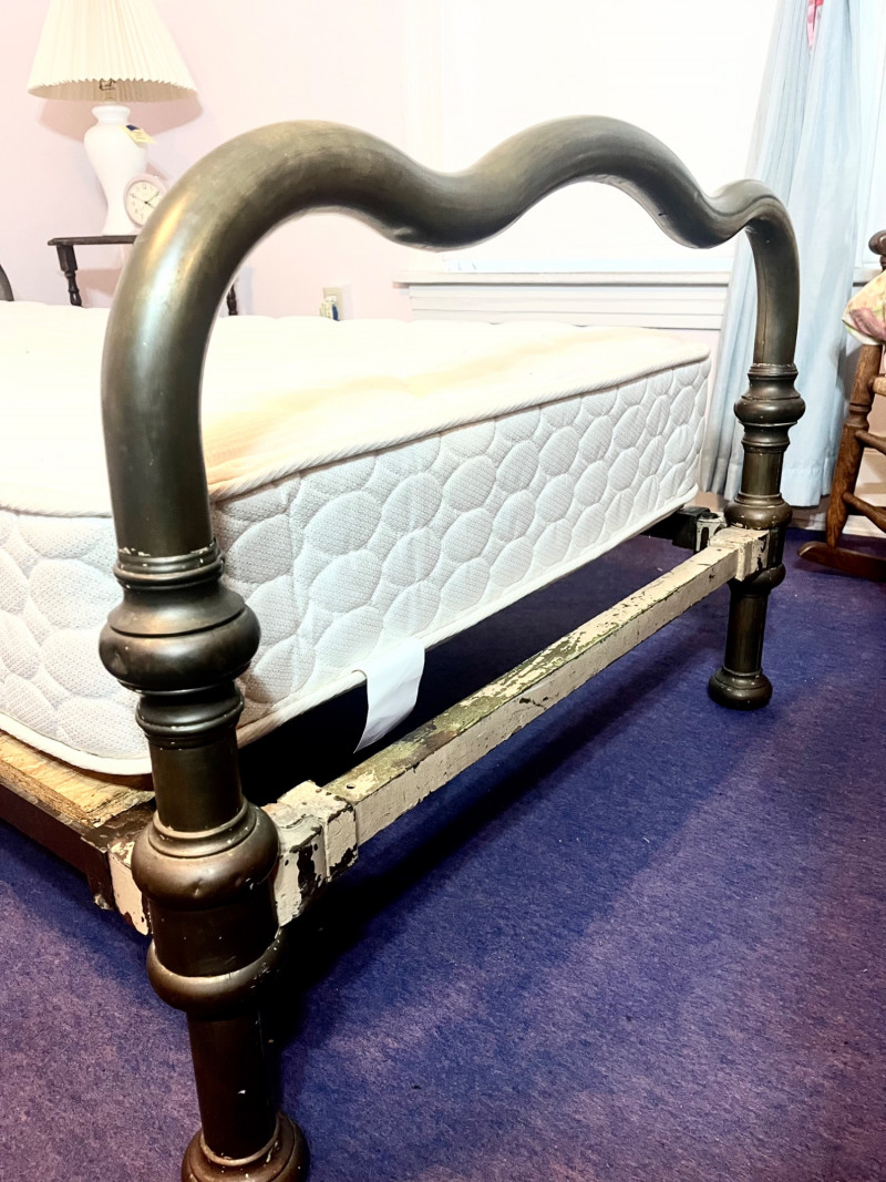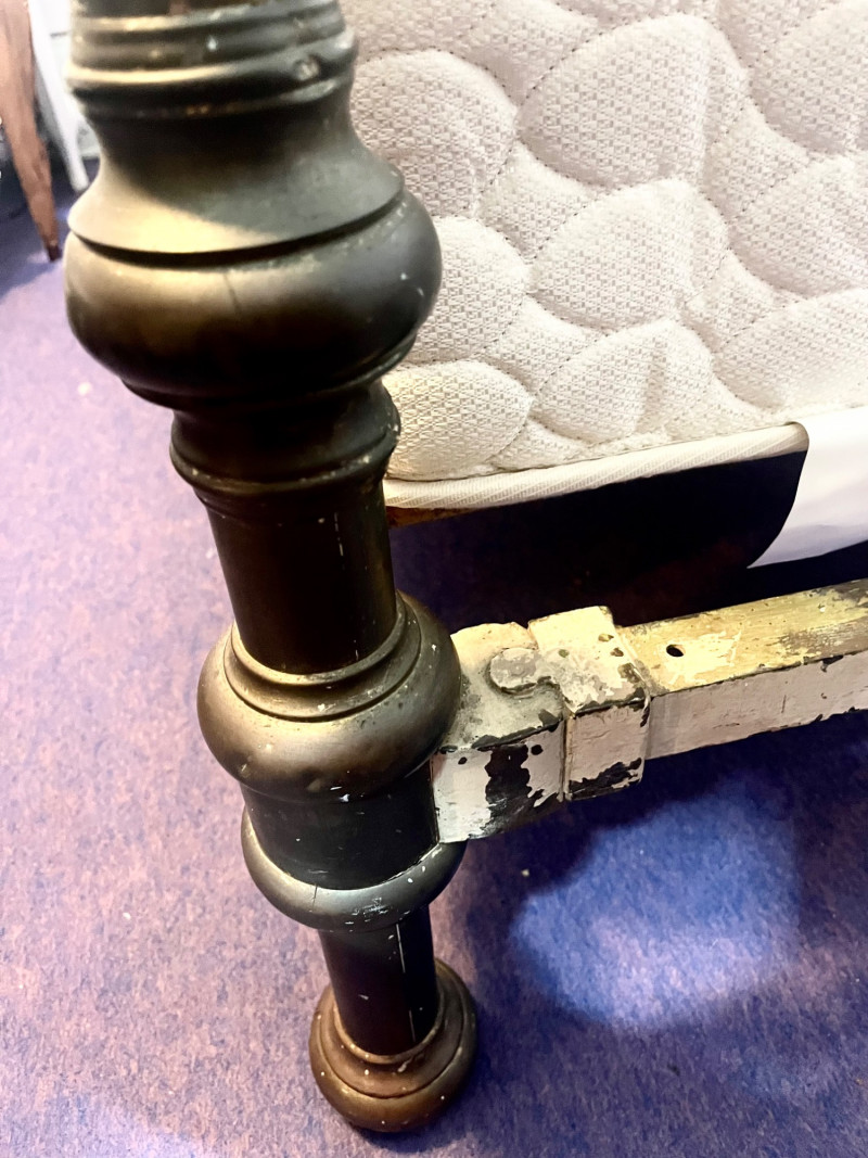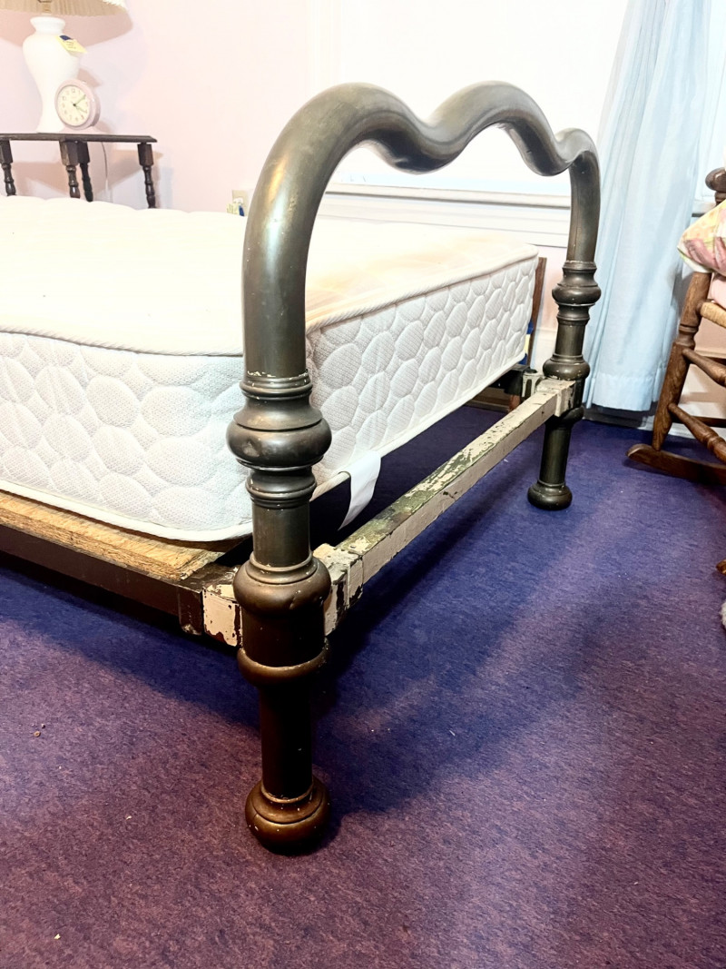Antique Brass Twin Bed Frame with (Optional) Mattress This bedframe is quite aged which is entirely what gives it its charm! It is very sturdy and heavy as this is brass and (I believe) iron. Bidder is not obligated to take mattress, but it does look to be in good condition.