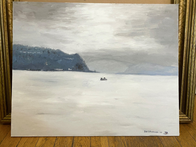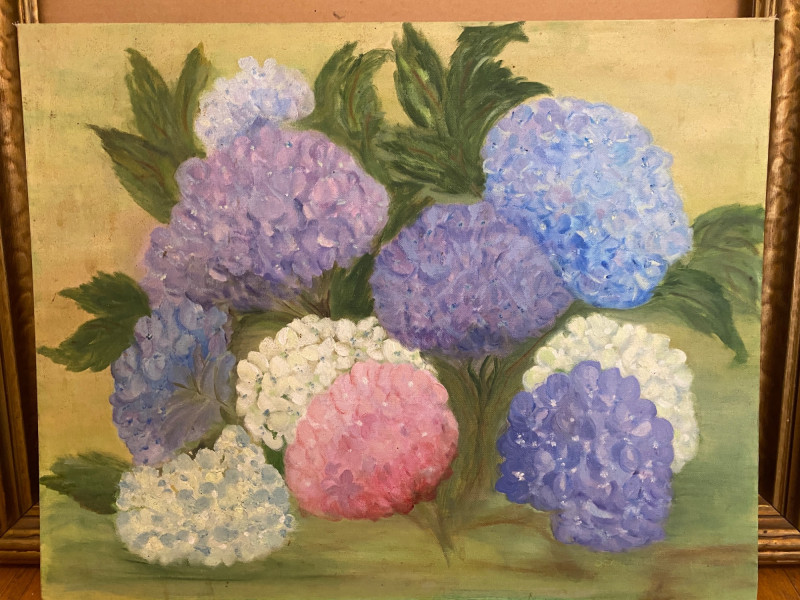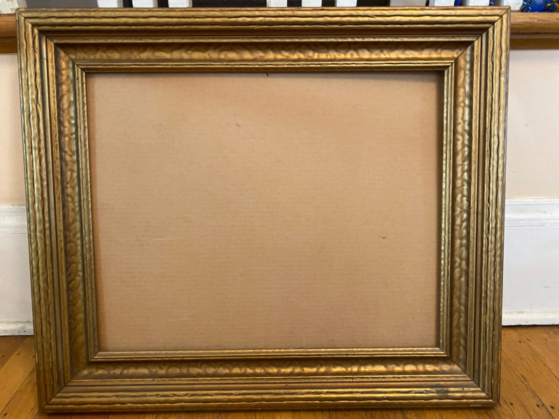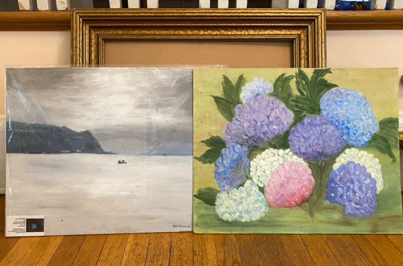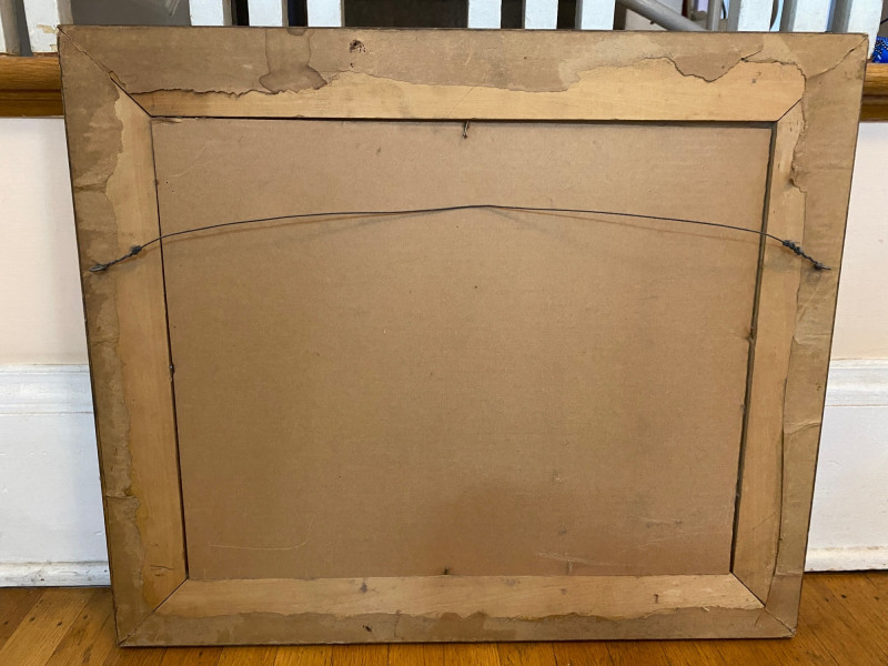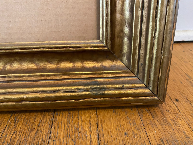 Gold Painted Wood Frame with Two Paintings Both paintings fit into this frame. The frame is in good condition with only minor blemishes. Both paintings are canvas on board. Frame is approximately 20" x 25"