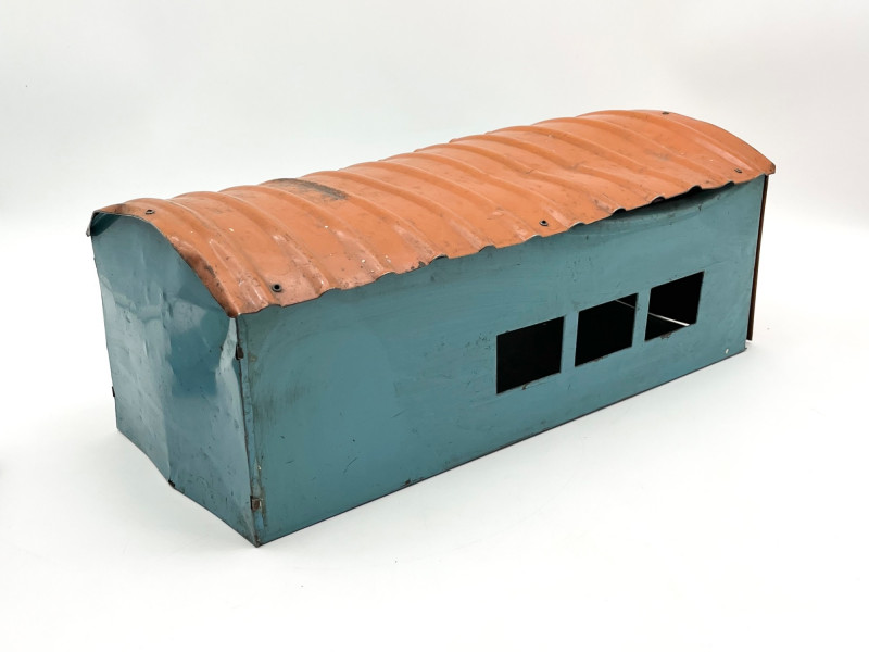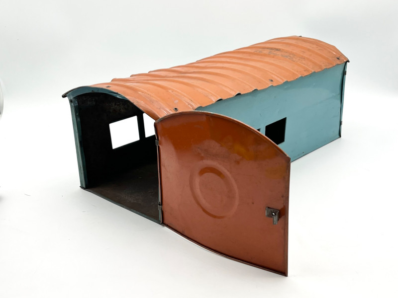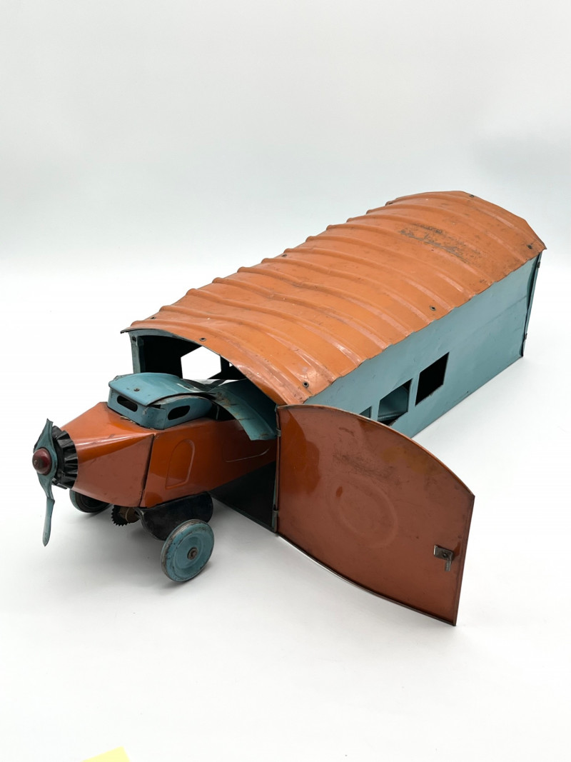 Vintage Scheible Tin Airplane with Folding Wings and Hangar Hangar is 16 1/2" long. Note that the propeller is broken.