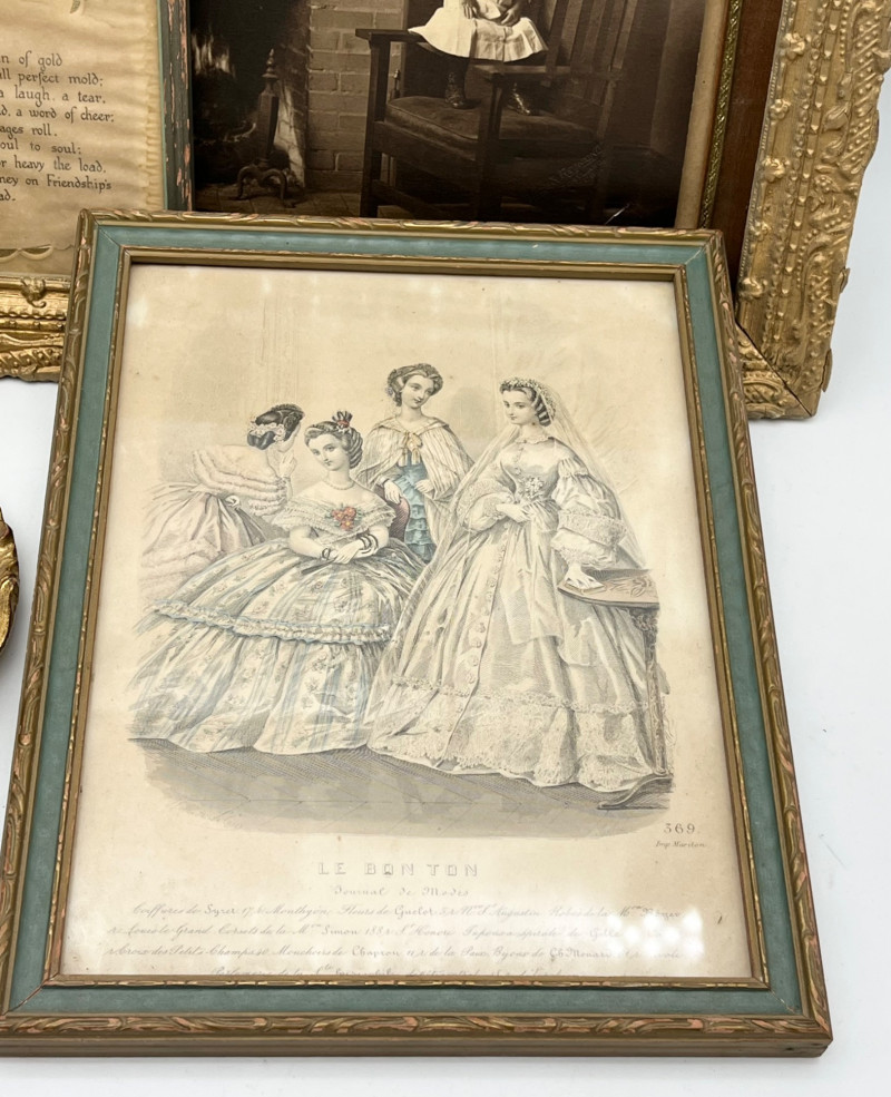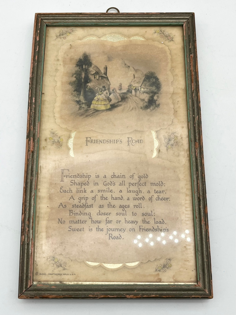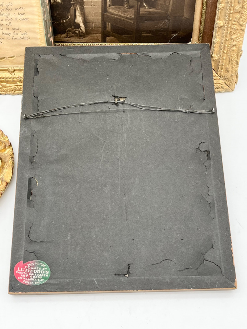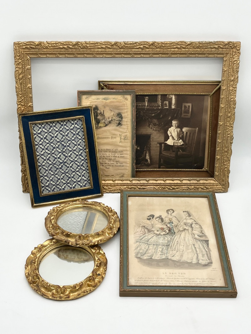 Antique Gold Tone Picture Frames and Mirrors For size perspective, the mirrors are 7" across and the "Le Bon Ton" lithograph is 9" x 12". The gold painted wood frame is aged and quite delicate and the Friendship Road Poem does show signs of aging and potential moisture damage.