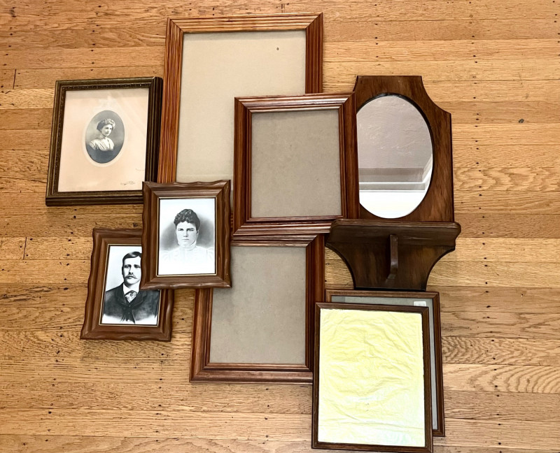 Wood Frames and Mirror with Shelf For size perspective, the largest frame is 14" x 20" The photos in these frames are genuine, antique photos!