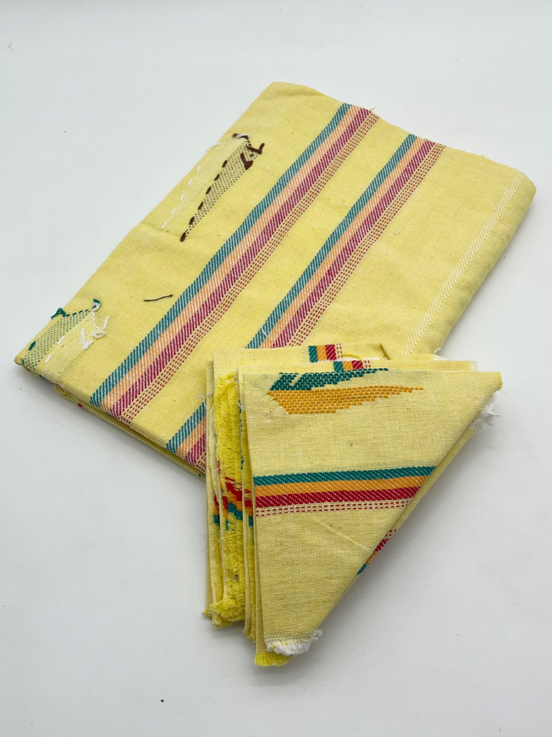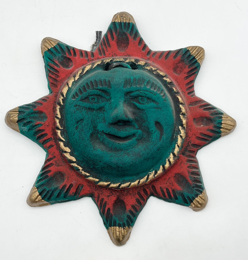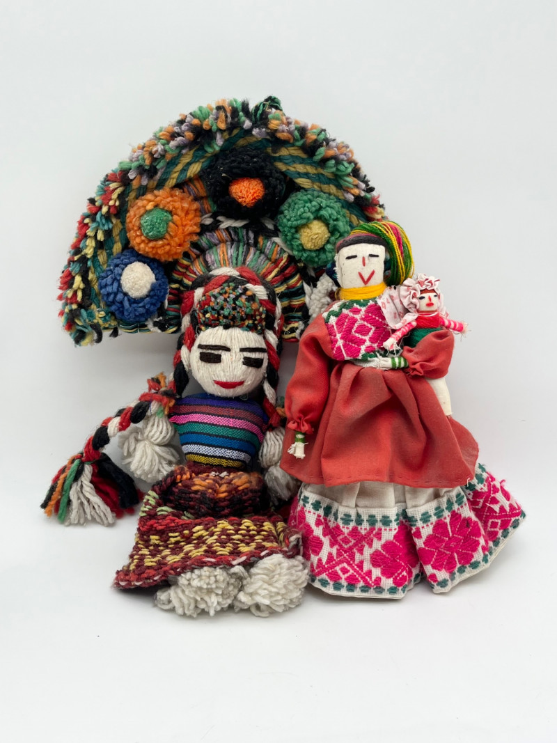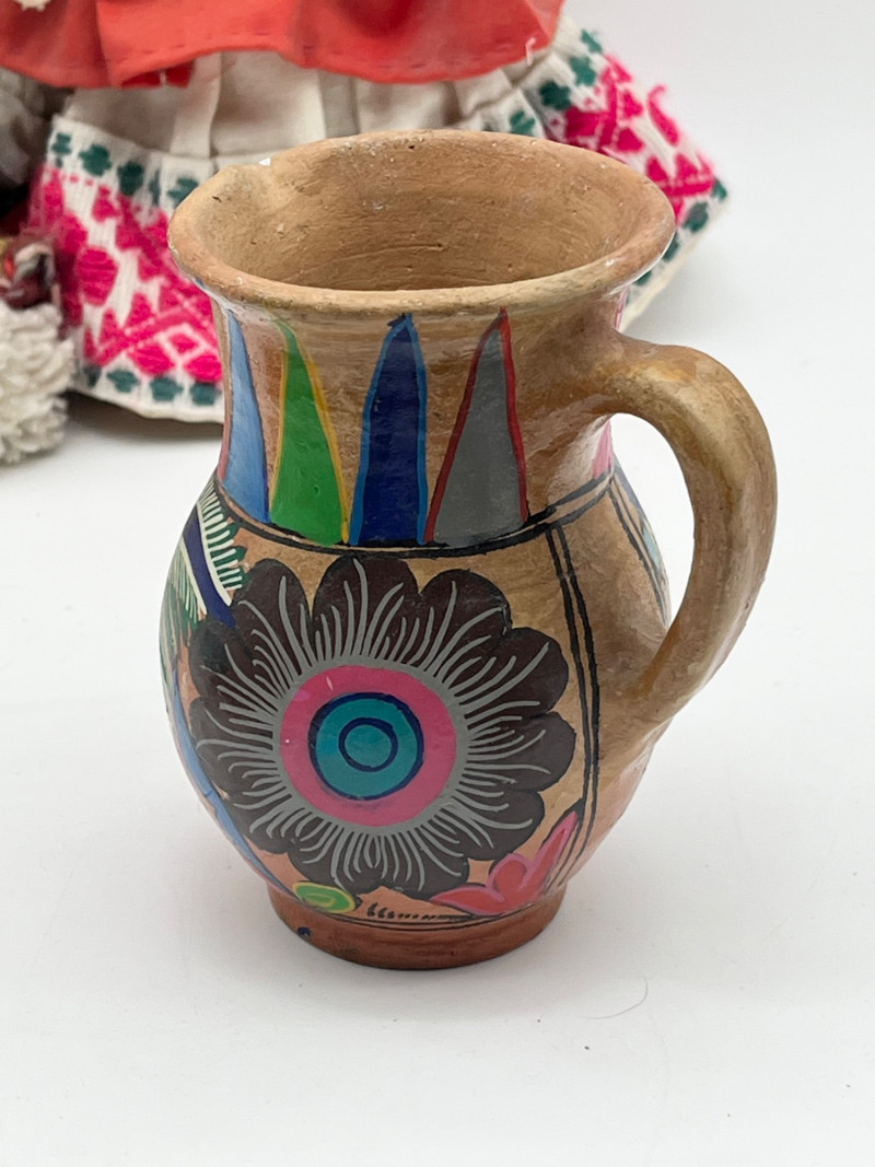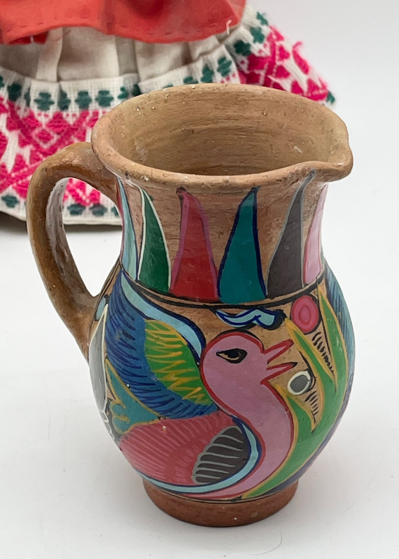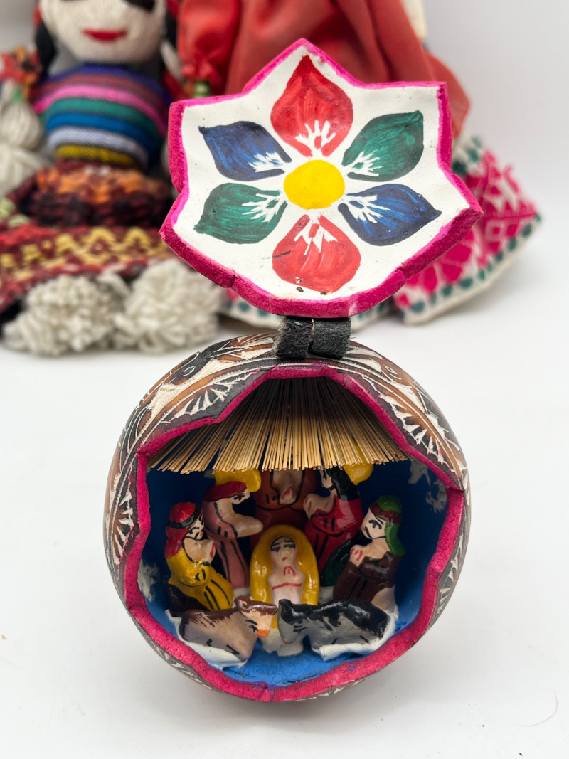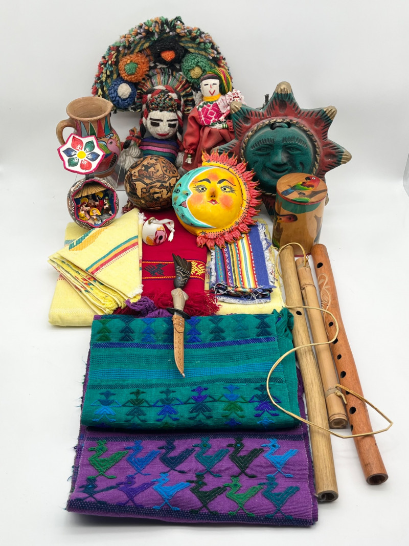 South American Souvenirs and Decor Lot This cheerful lot includes a tablecloth and napkins set, two scarves (table runners?), a hand thrown clay jug, two sun wall art pieces, folk art dolls and more!