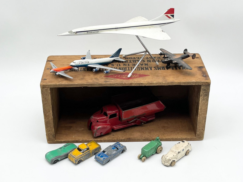 Lot # 188 - Vintage Toy Automobiles and Airplanes in Wood Ammunition Box