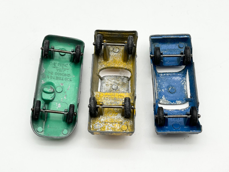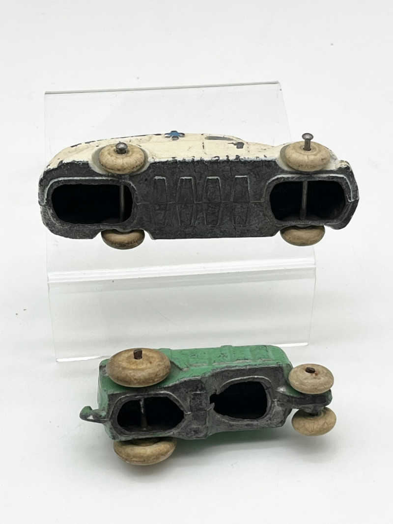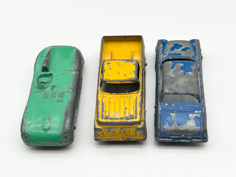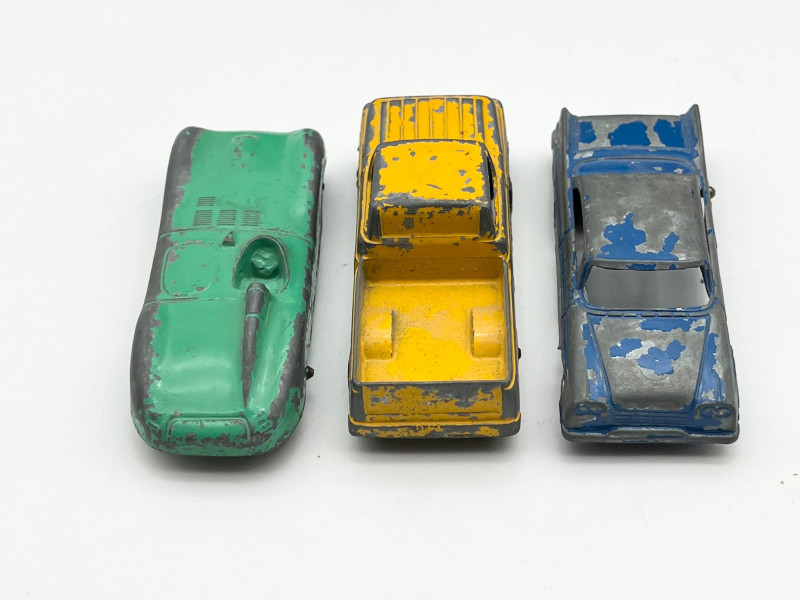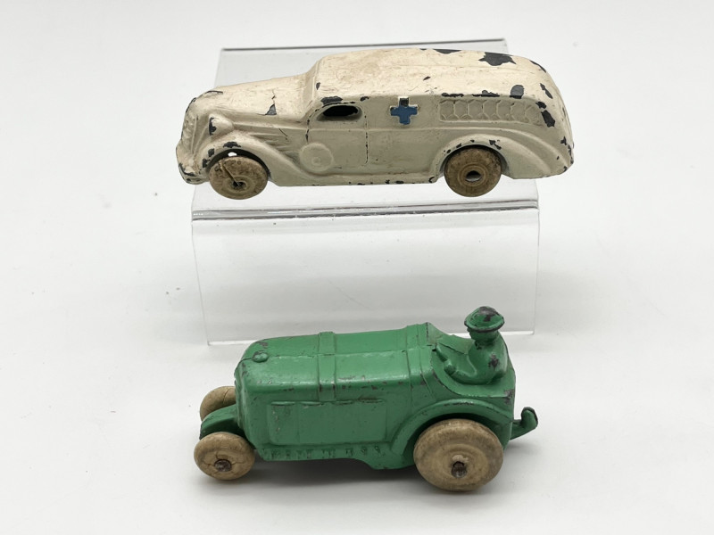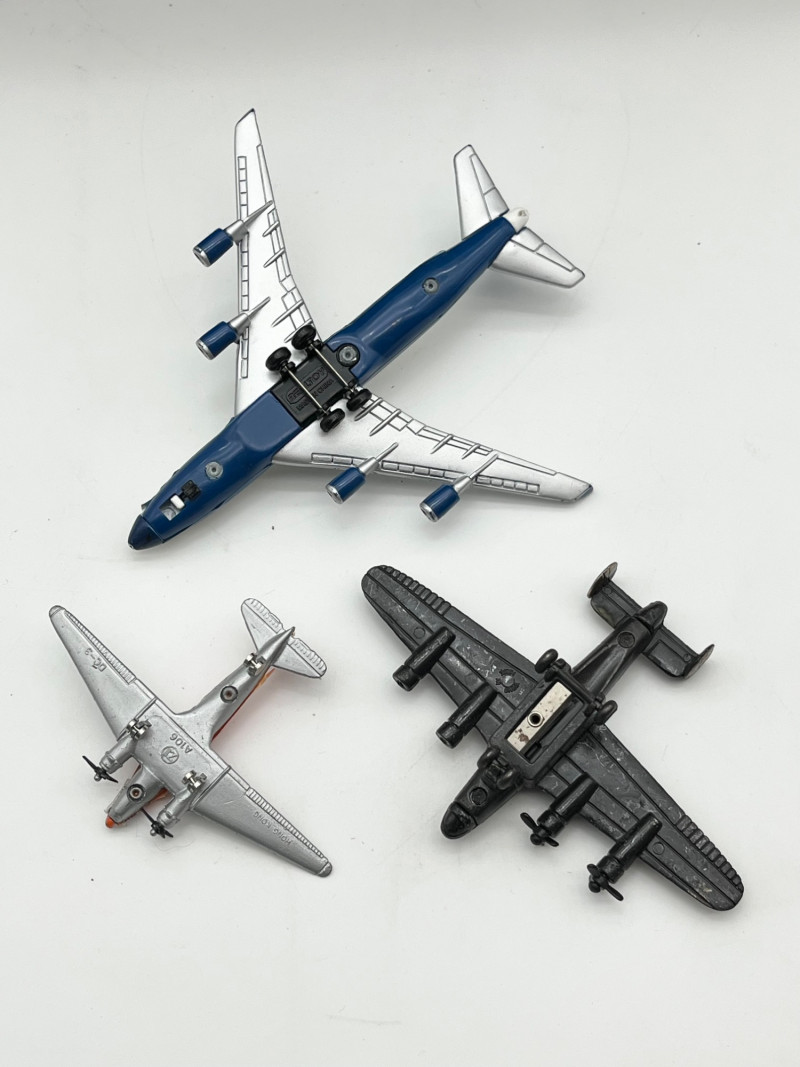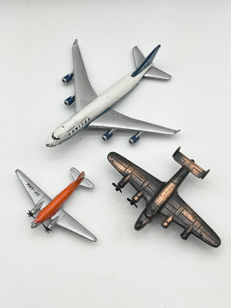 Vintage Toy Automobiles and Airplanes in Wood Box The box is 14" long in very sturdy condition. The there are both tin and cast-iron automobiles. On of the airplanes is also a pencil sharpener. See all photos for details. regarding condition