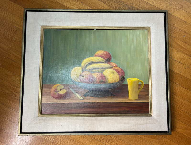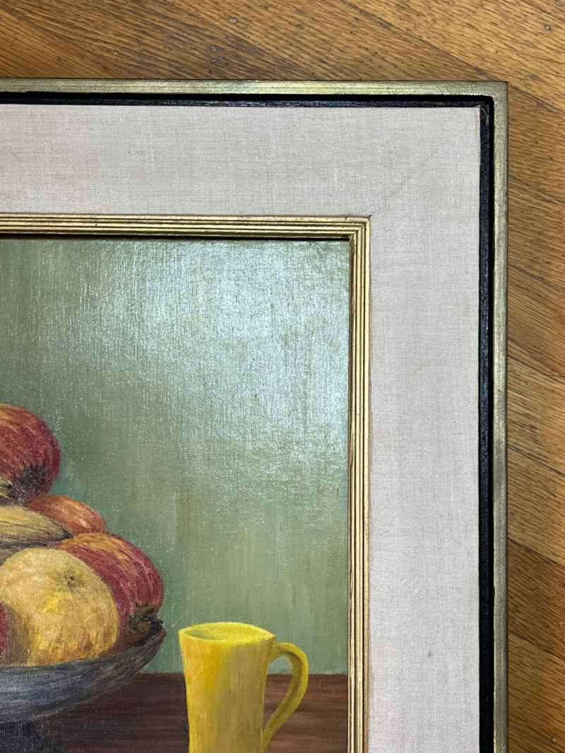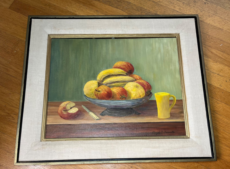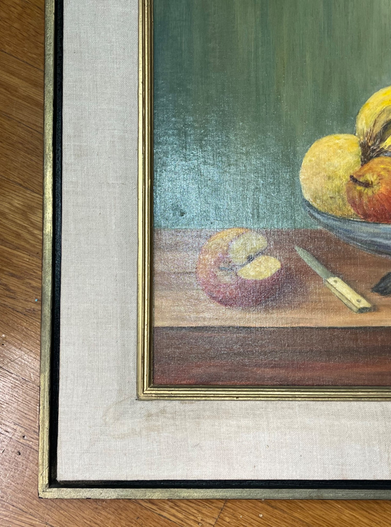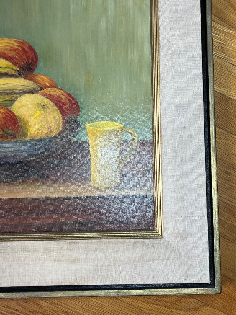 Framed Fruit Still Art Oil Painting on Canvas Board Measures 23" x 27". Frame has some light stains on the fabric trim.