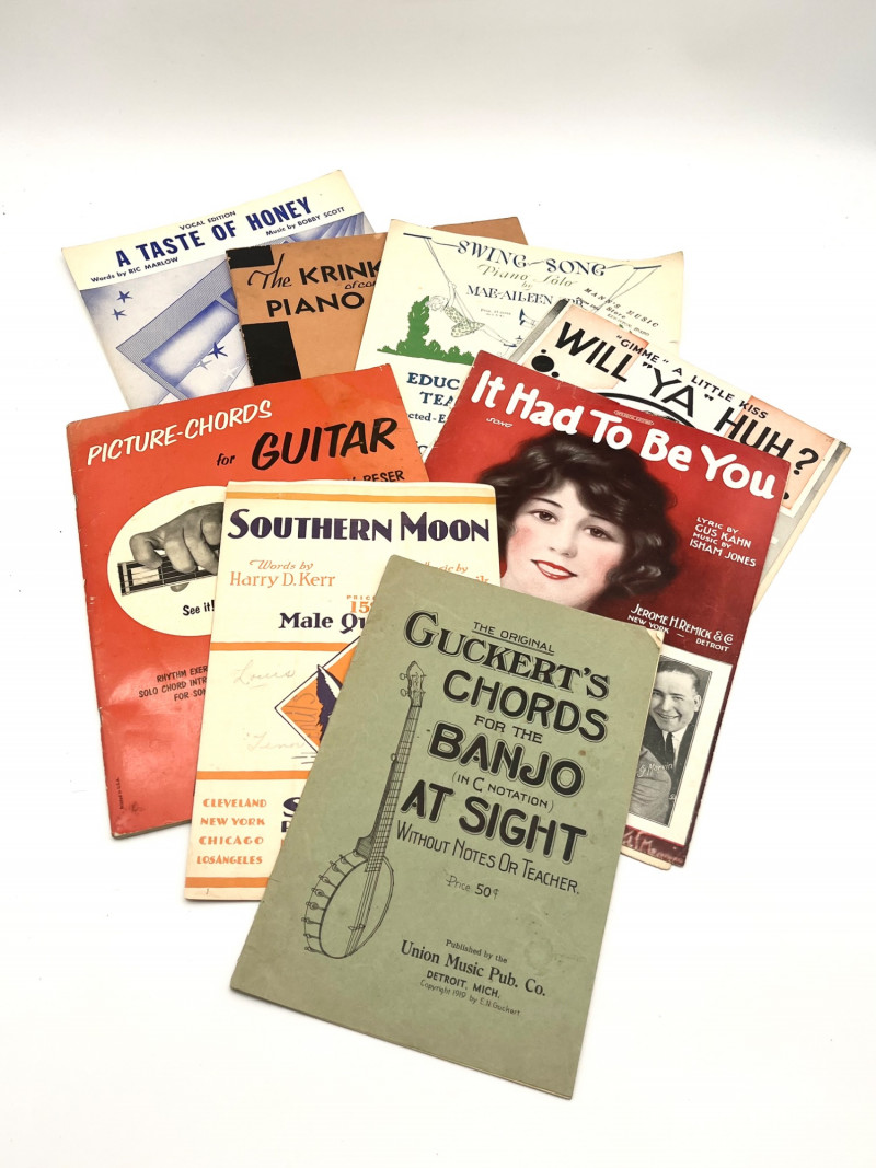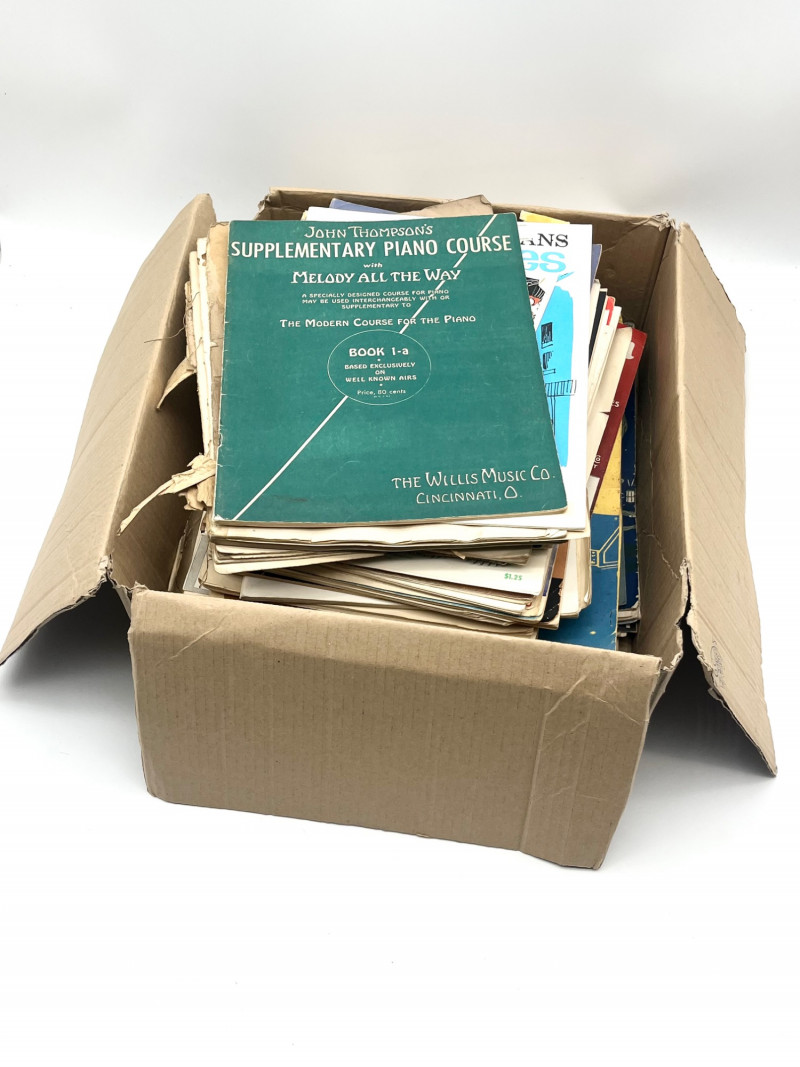 Big Box Full of Antique and Vintage Sheet Music for Multiple Instruments In this box I found music for both piano, accordion, banjo, and ukulele. All the books are in condition that is consistent with age.