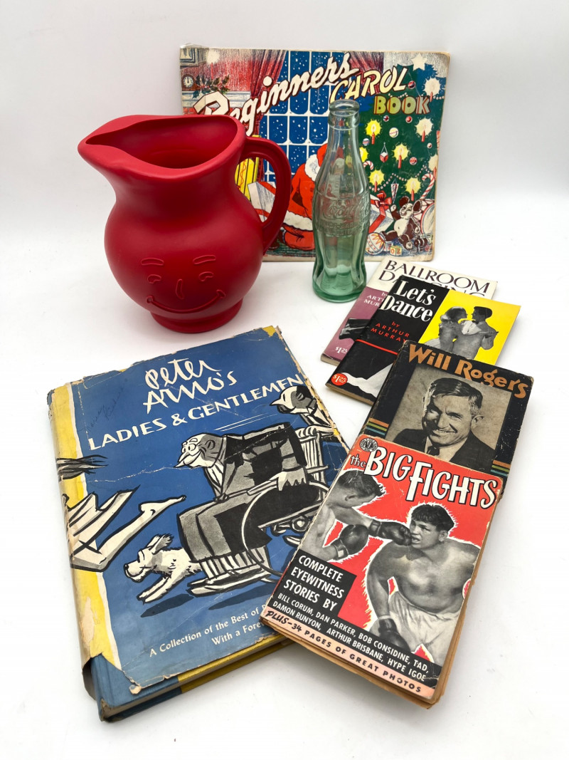 American Pop Culture Nostalgia Feat. Peter Armo's Ladies & Gentlemen Featuring a book of cartoons from the artist Peter Armo who coined the term, "Back to the old drawing board", this lot has a handful of pop culture goodies from the mid-20th century. Also included is a book about Will Rogers, a Christmas Carols music book, a vintage Coca-Cola bottle and a plastic Kool-Aid Man pitcher. Oh yeah!!