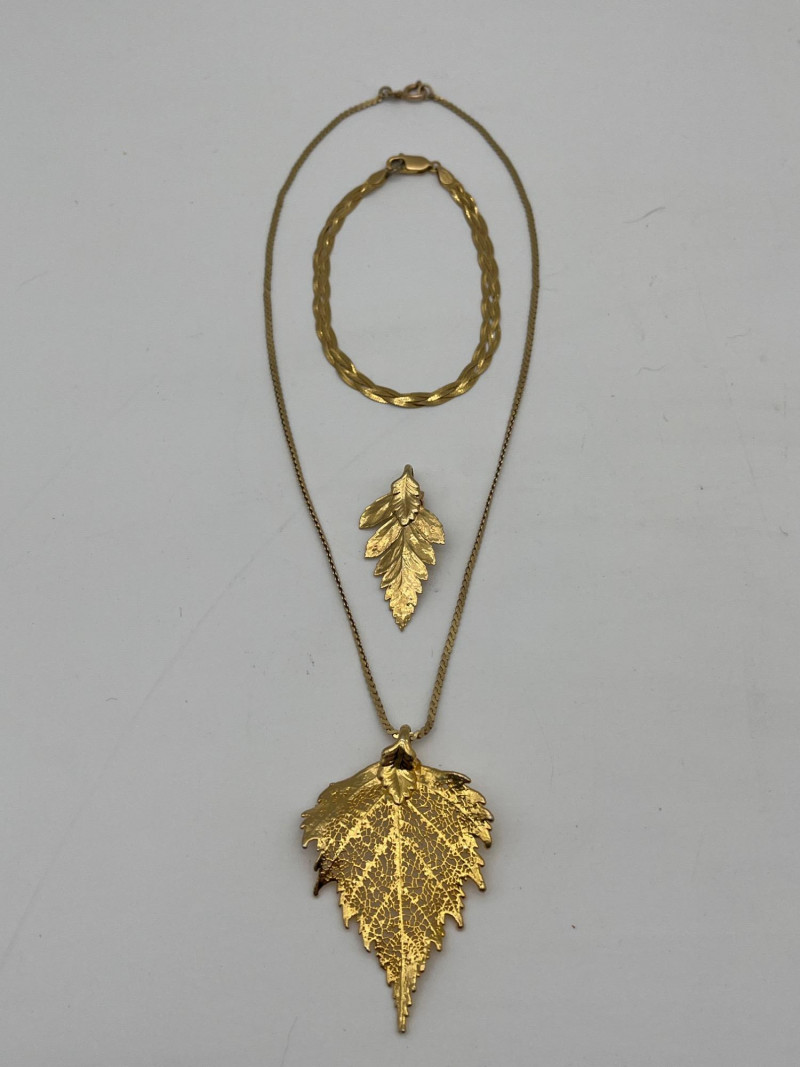Lot # 4 - 14k Gold Braided Chain Bracelet Gold Dipped Leaf Pendants & Necklace