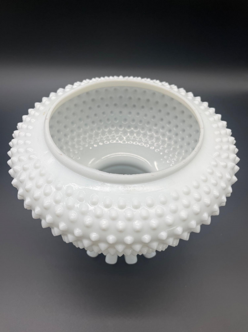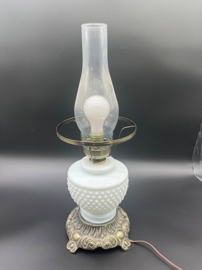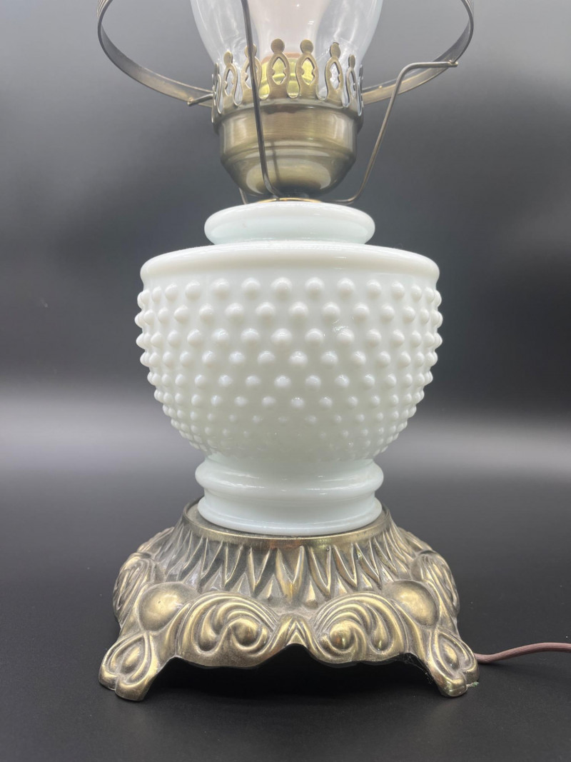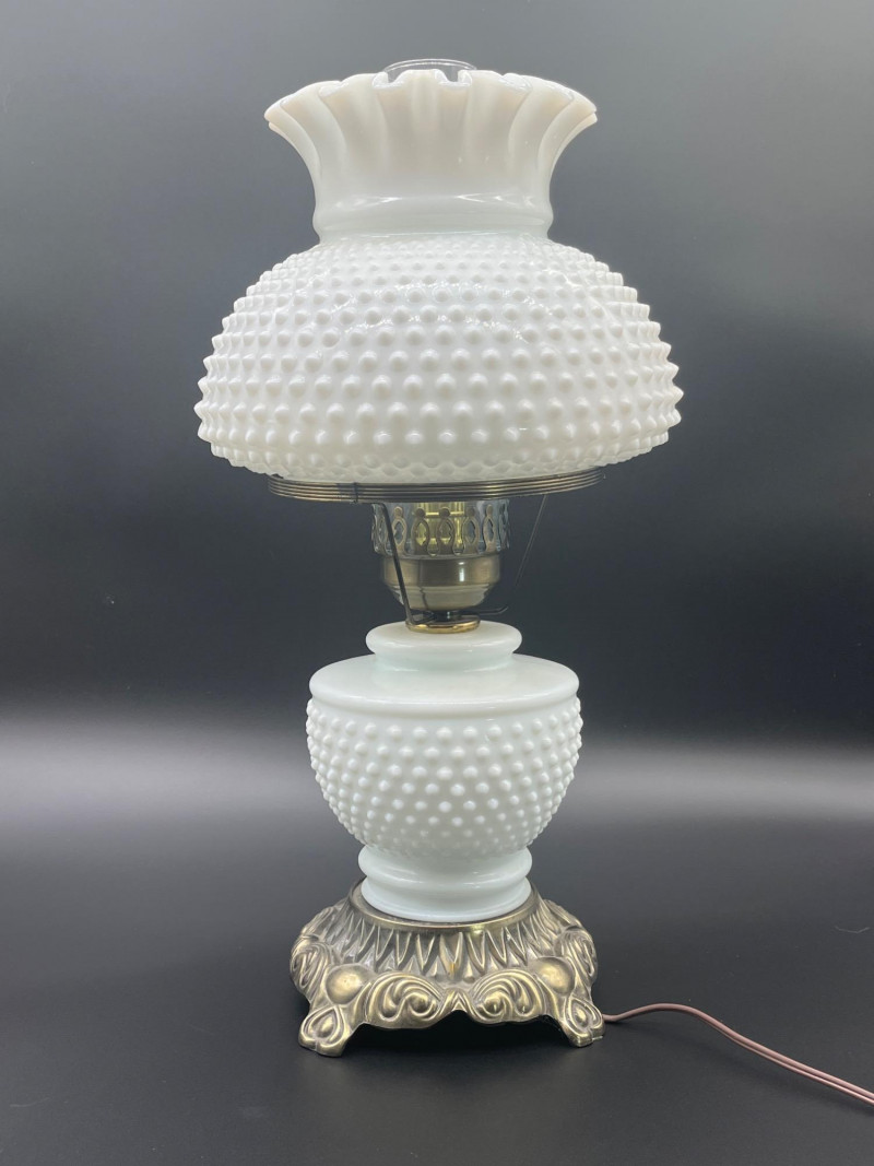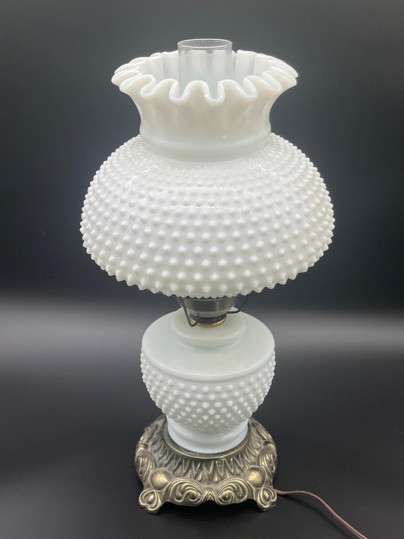 Vintage Milk Glass Hobnail Hurricane Lamp With Ruffled Top These lamps evoke the nostalgia of a time long gone when electricity in homes was the exception, not the rule. Despite having been manufactured in the mid-twentieth century, this lamp is reminiscent of old-fashioned oil lamps of a bygone era. The top milk glass shade fits perfectly into the support ring and is in excellent condition from what I can see. The lamp overall measures 30" tall. Lamp has been tested and is working order.