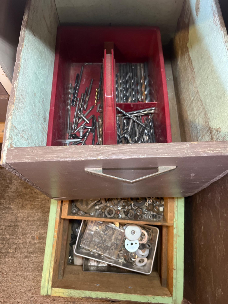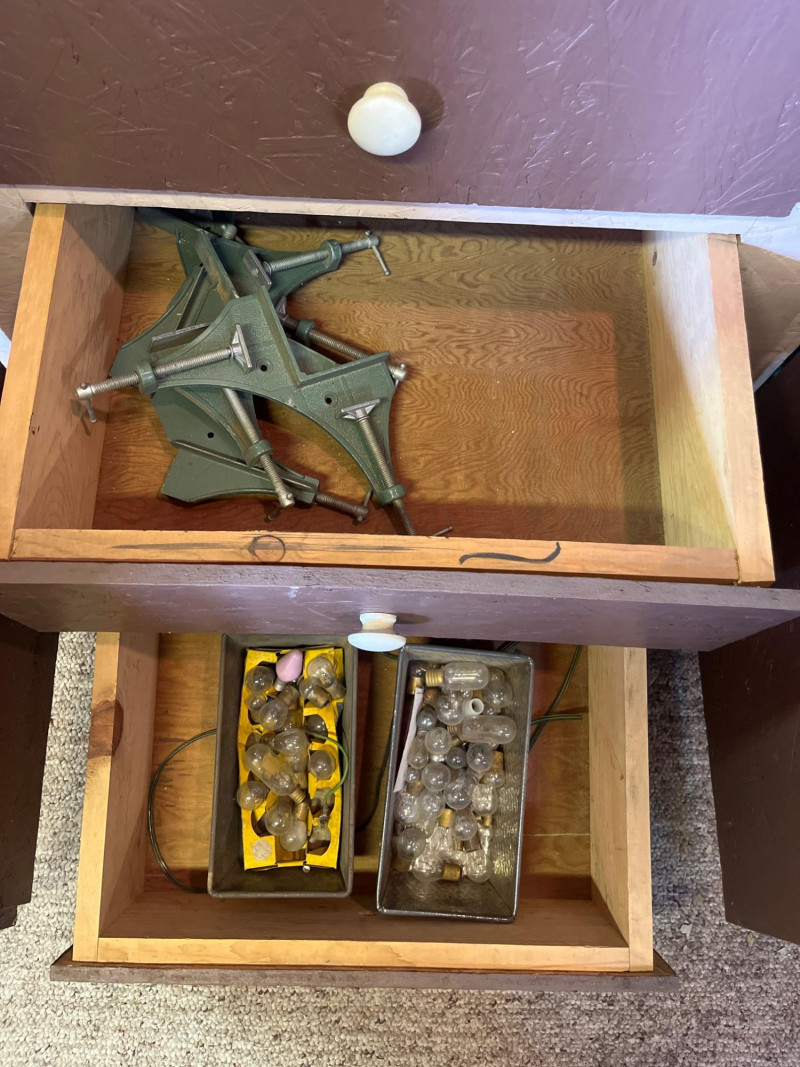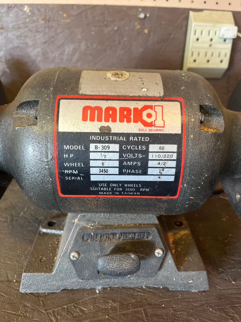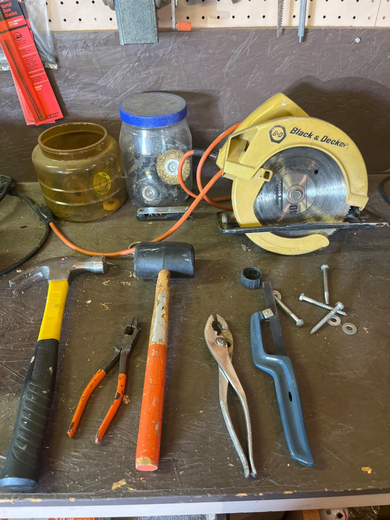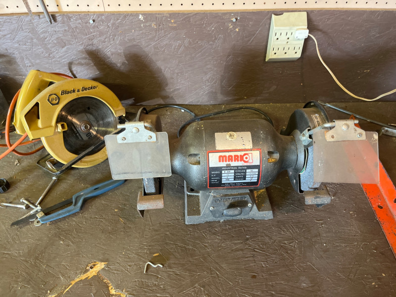 Garage Cabinet Cleanout #2 This lot includes everything shown in photos and features a 3" circular saw, Mark 1 bench grinder, a craftsman 16" scroll saw, many hammers, rulers and squares, tile cutter, drill bits and even some great rustic vintage tools. There's really too much to list here! Come prepared to pack up heavy tools. Electric tools have not been tested.