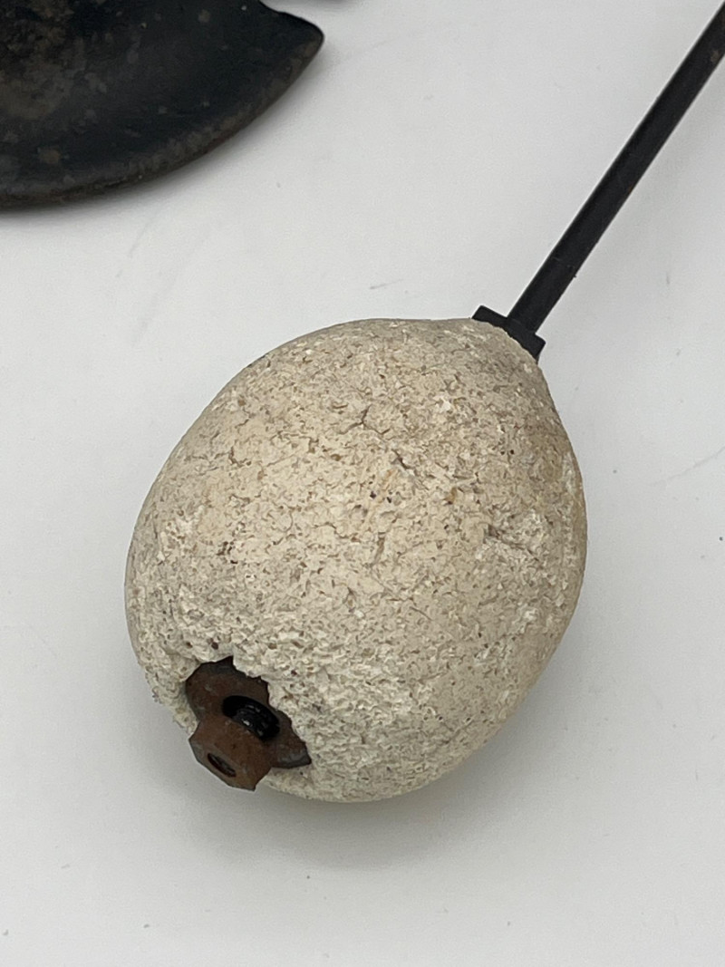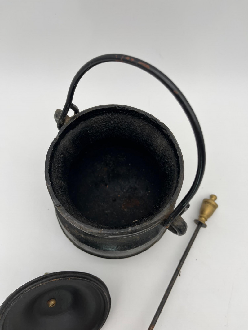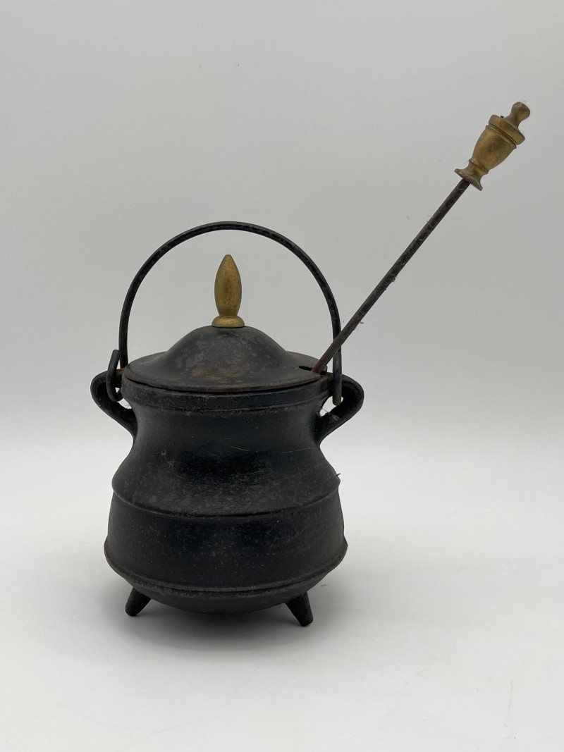 Cast Iron Smudge Pot Fire Starter Cauldron with Lid and Pumice Wand This is a vintage fireplace accessory used to ignite fires with little kindling or paper, cleaner and simpler than the ‘old way’. The three-legged pot would be partly filled with kerosene or other fuel. The pumice wand would be used to soak up the fuel, then lit with a match and placed under wood in the fireplace or in a wood-heated stove, the pumice able to hold a flame for longer than other materials. This pot stands only about 10" high with the handle.