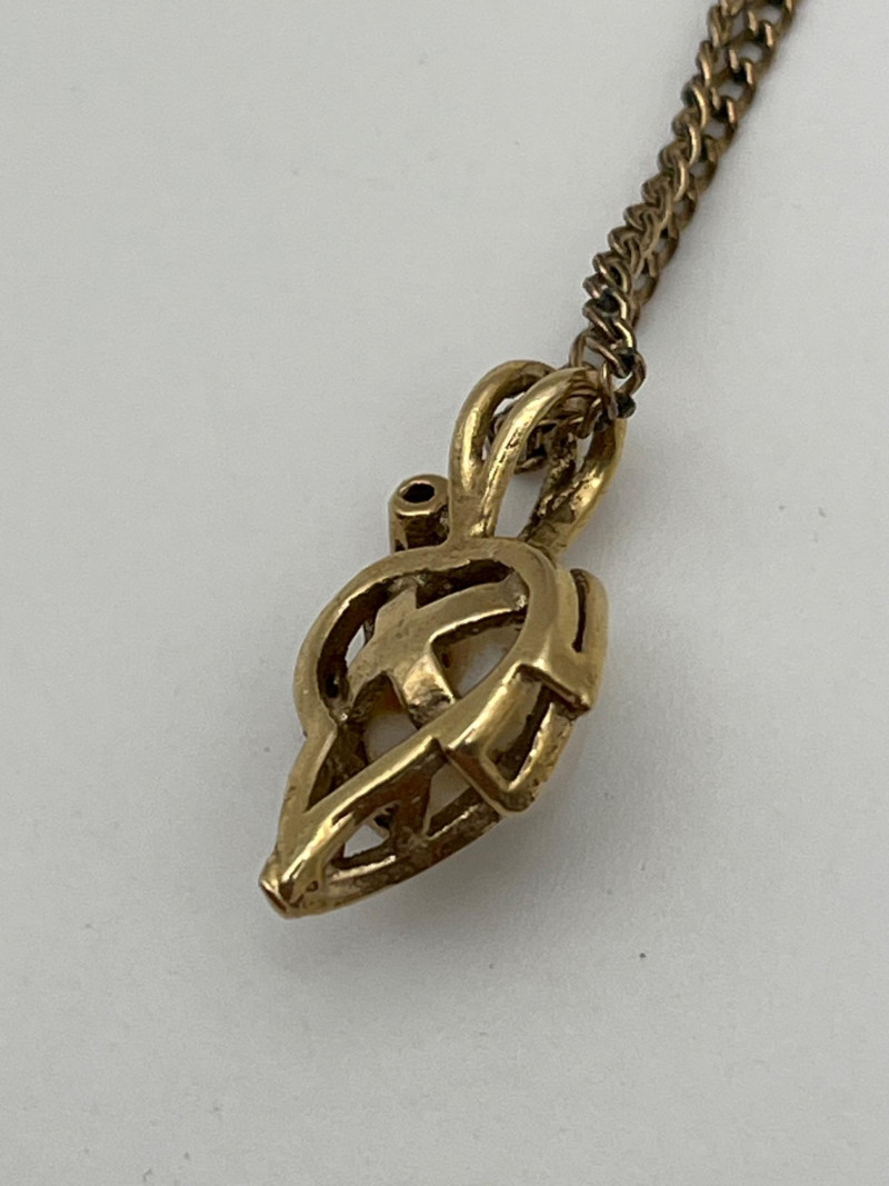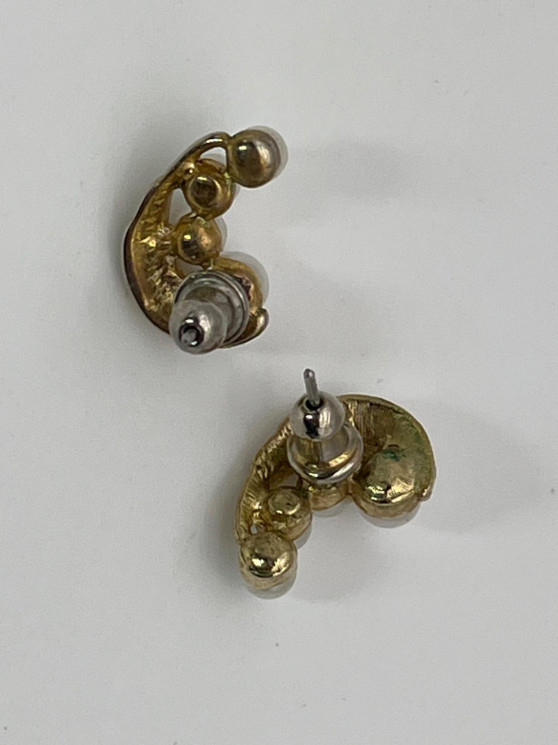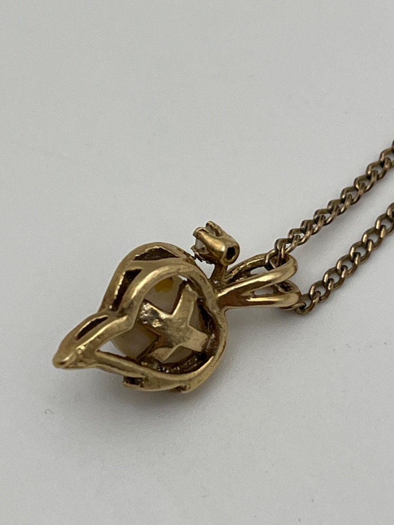 Mid-Century Pearl Pendant with Matching Earrings Unfortunately, I do not see a material or band stamp on either the earrings or the pendant. The pendant is 5/8" long