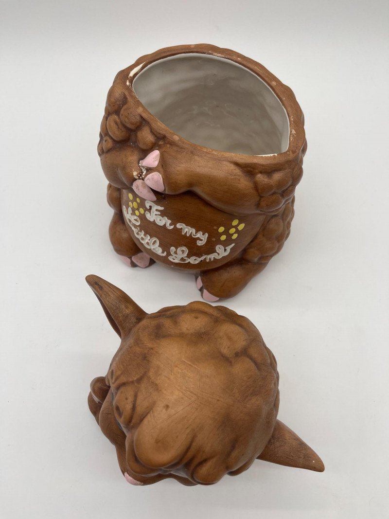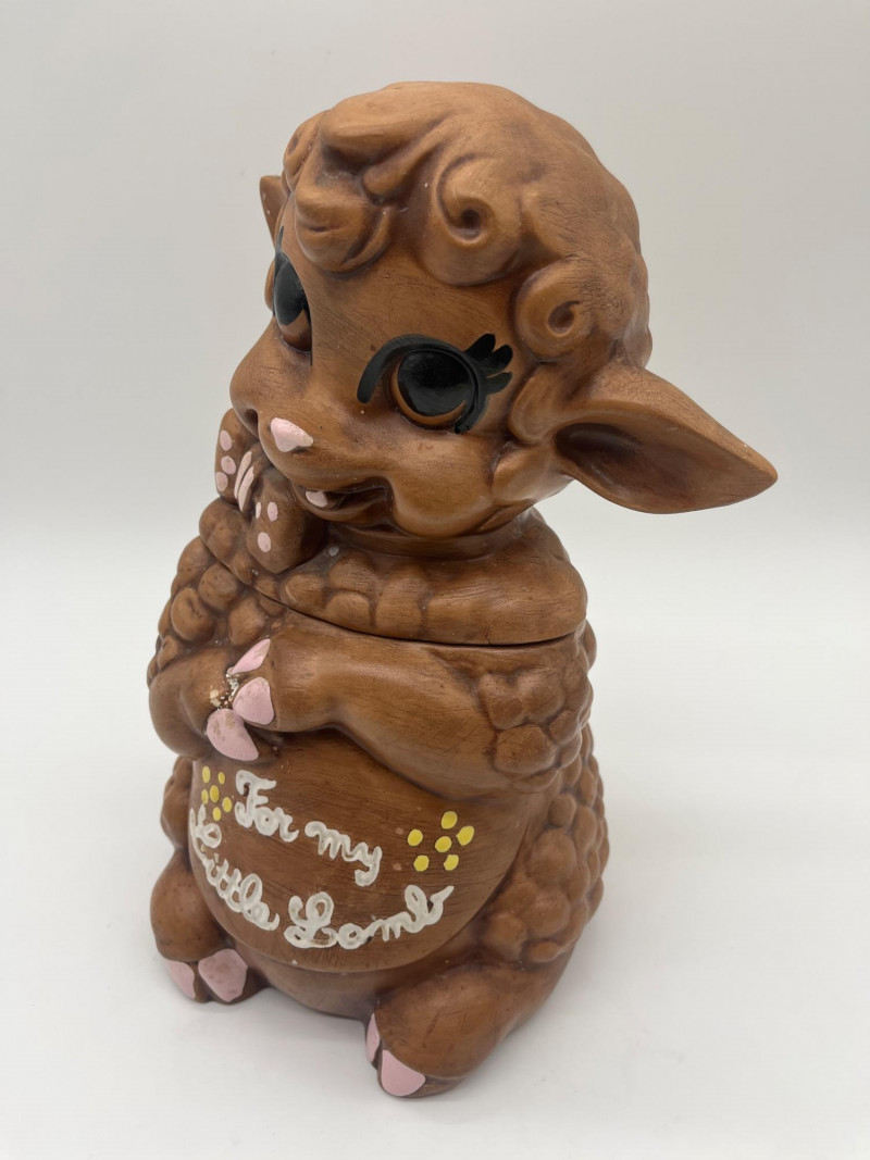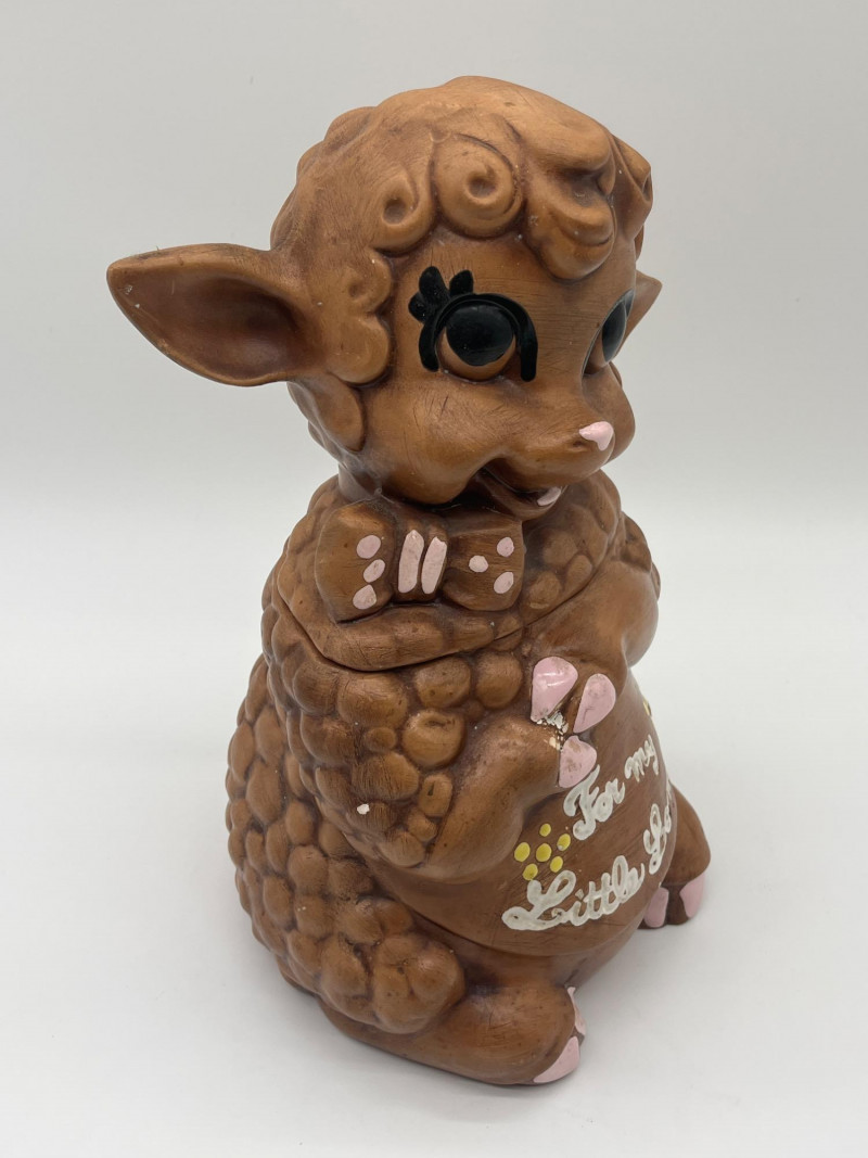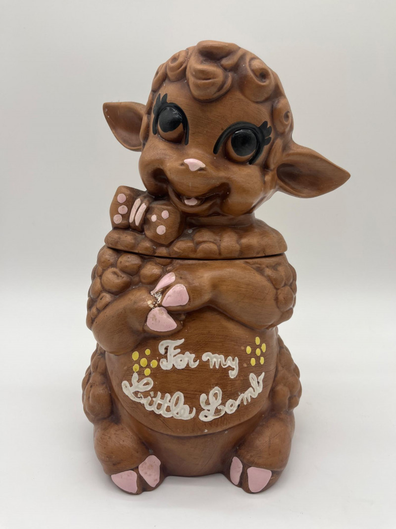 Hand Painted 1960's Lamb Cookie Jar Painted in pink on its belly it reads: "For my Little Lamb" Stands 12” tall.