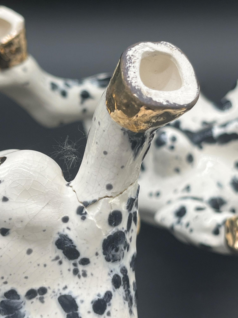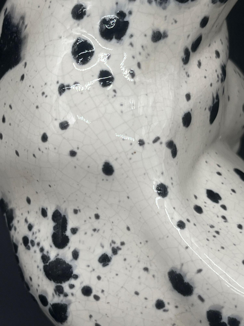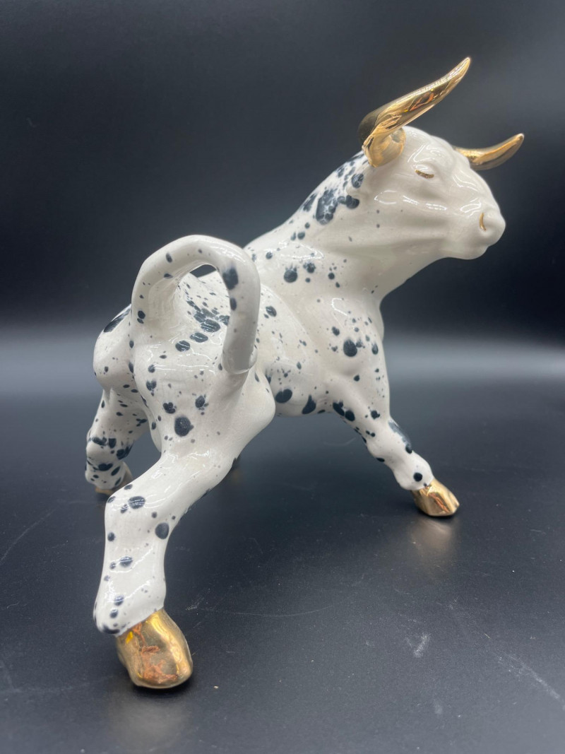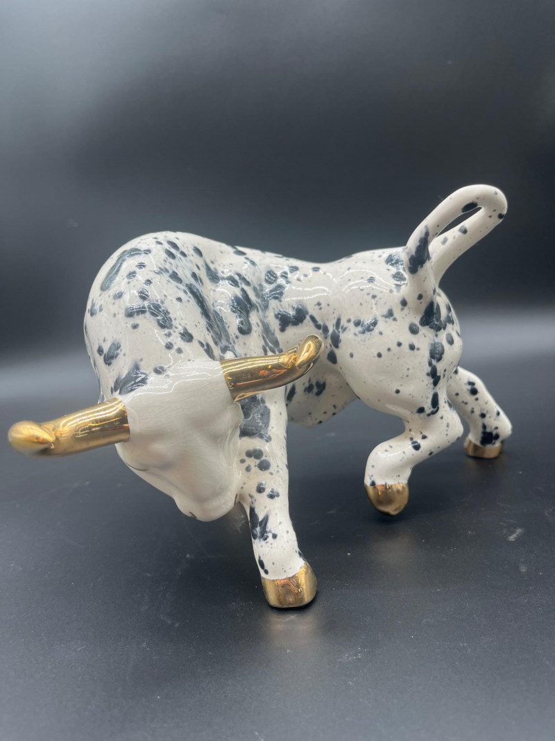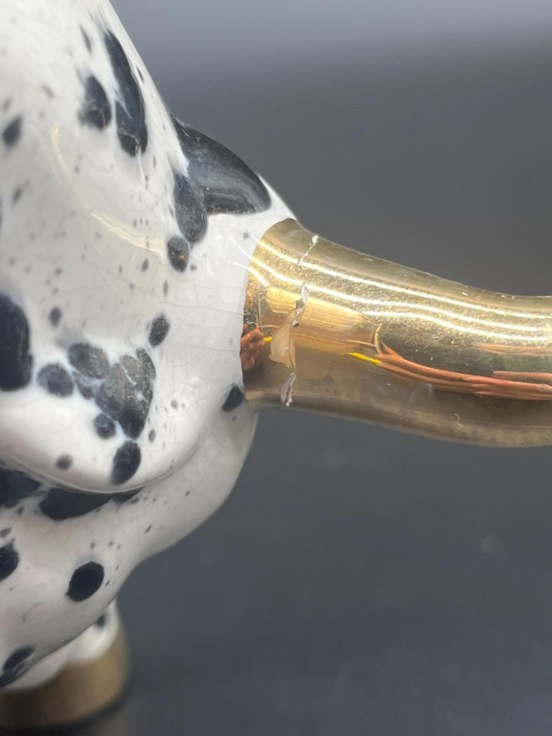 Ceramic Hand Painted Mid-Century Longhorn Bulls These have a unique mottled design popular in 1960's motif. These stand at about 7" tall and 10" long making them more of a coffee table conversation piece than just another knick-knack on your shelf. They do have a few repairs that I show close up in photos: one is to a horn and the other to a leg. There is some crazing present as well. See photos for details.