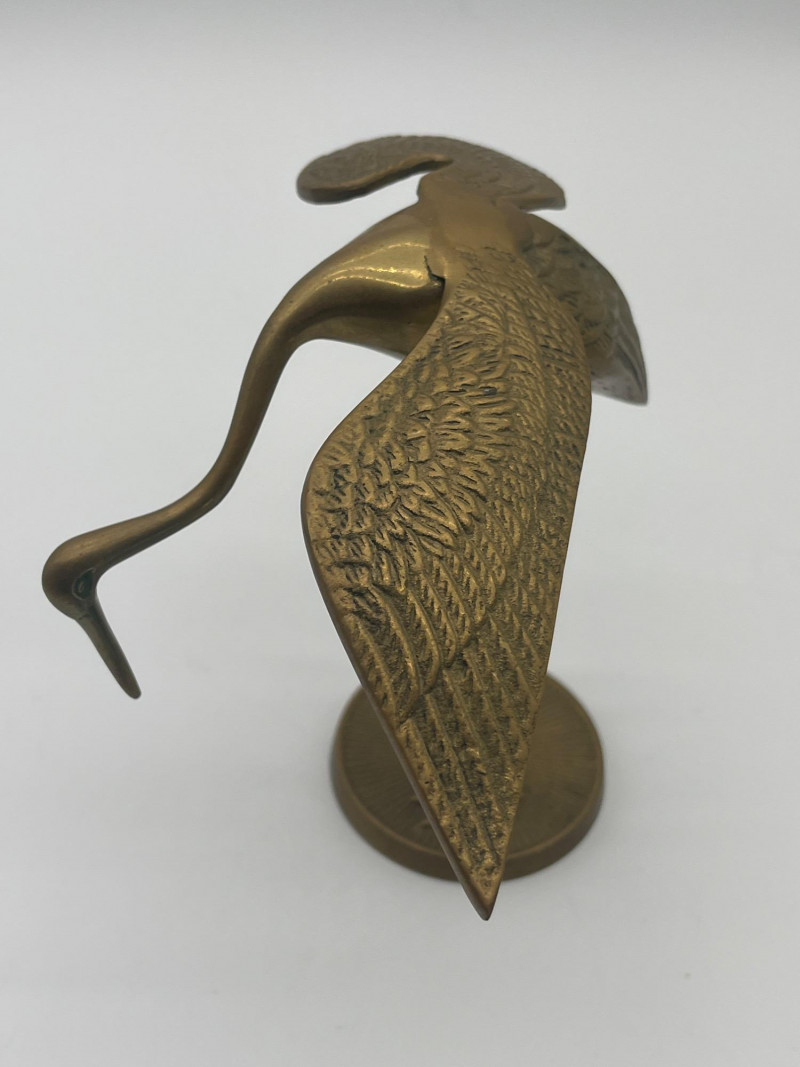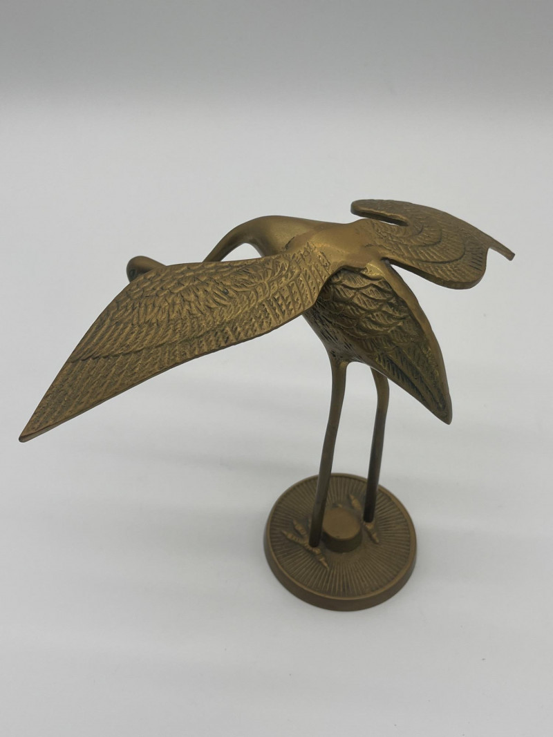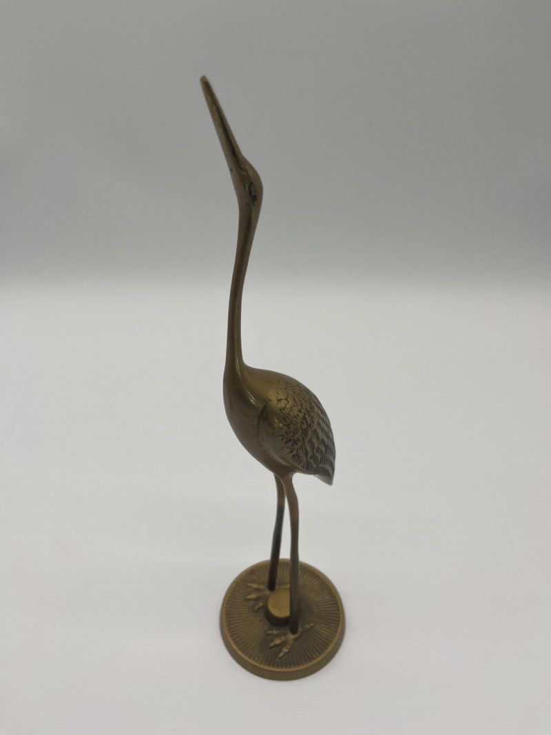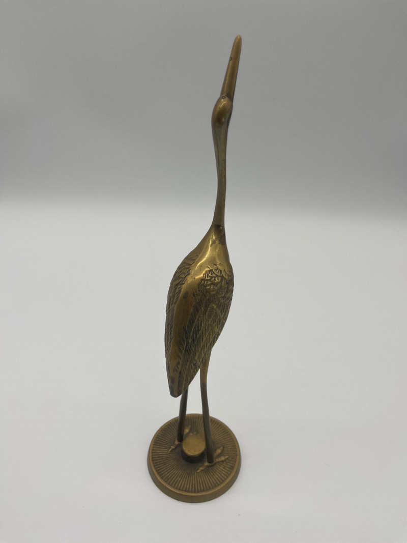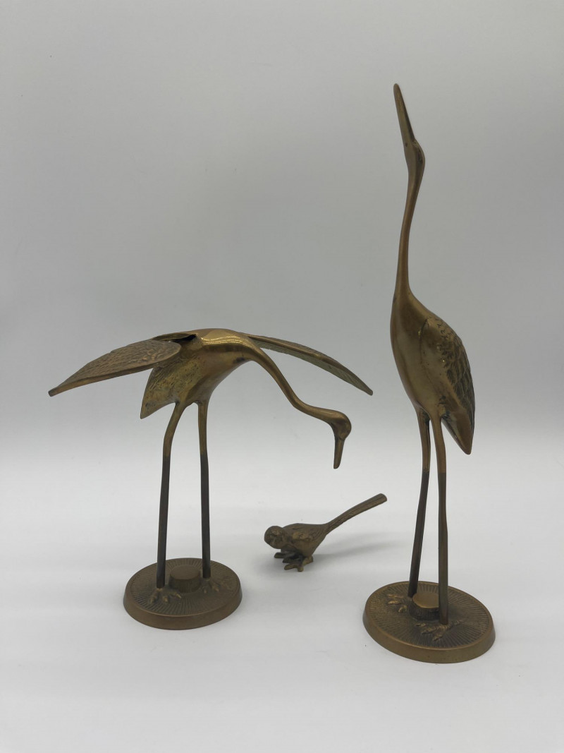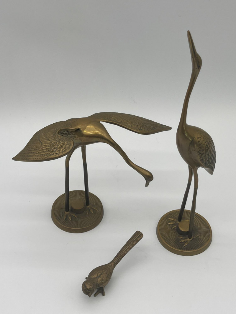Ornate Brass Cranes and Little Chickadee The tallest of the cranes is 12" tall and both have quite a bit of weight to them. The bases are heavy enough so that they don't feel too top heavy. The little birdy doesn't match the set but he's cute and is of the same nice quality. All three pieces have a nice patina giving them that rustic look.