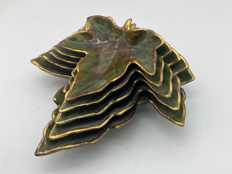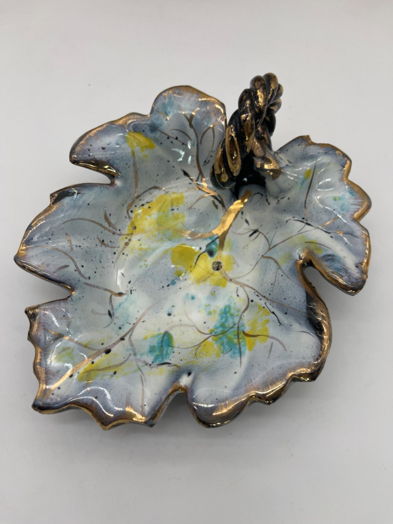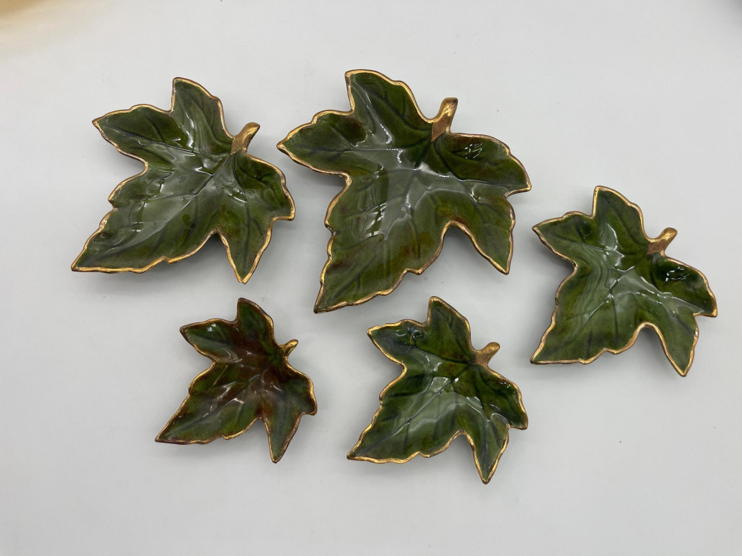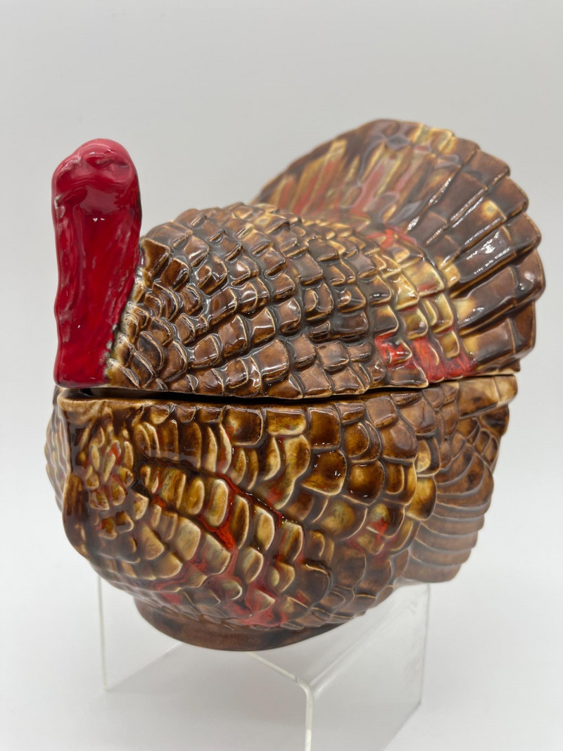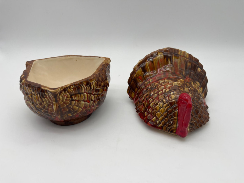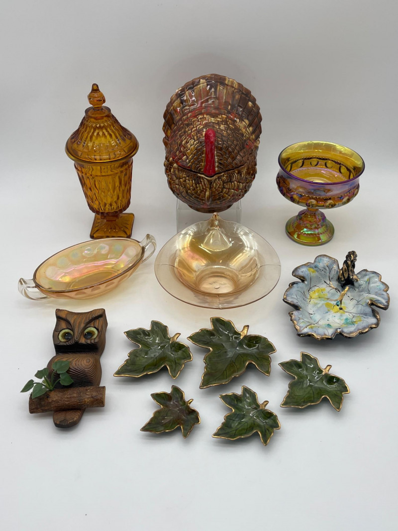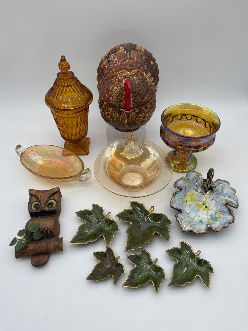 Rustic Fall Vibes Vintage Knick Knacks Lot These are all pretty small pieces. For perspective, the turkey is 6 3/4" tall and the amber apothecary jar is about 9" tall. The tiny leaf dishes do have some minor flaws, mostly on their back side. The turkey and larger leaf dishes are hand painted.