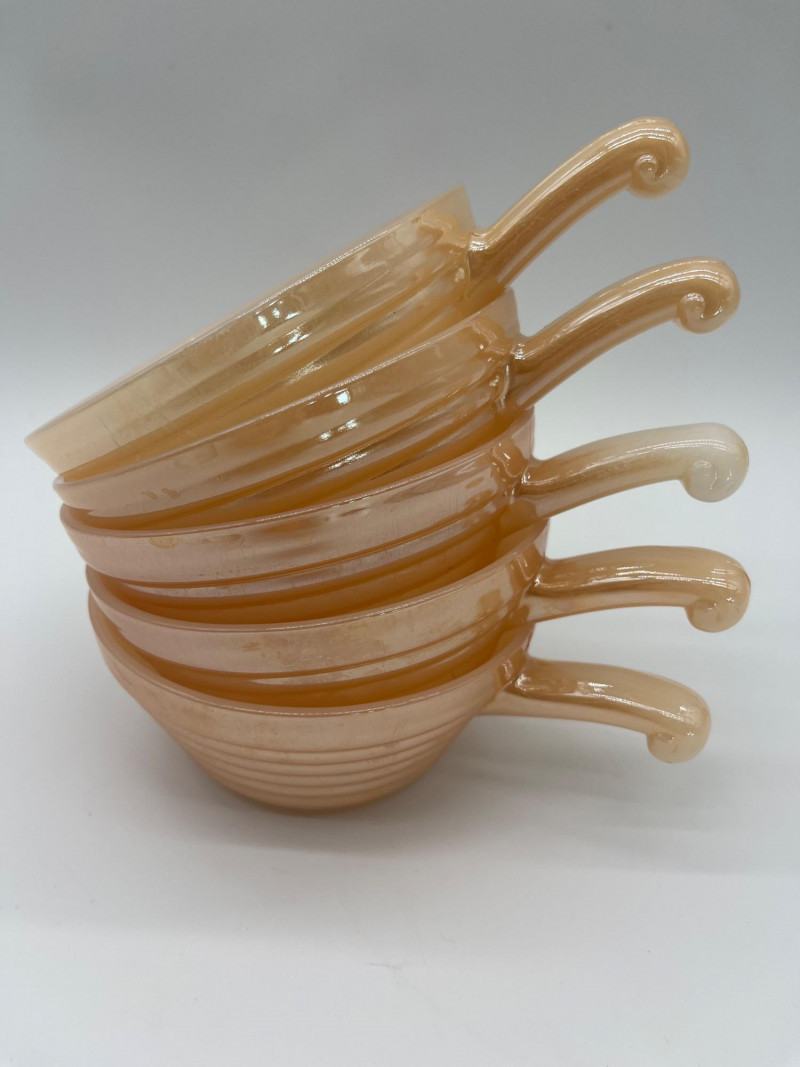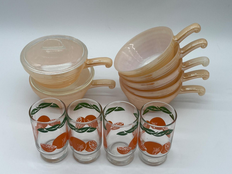 Vintage Anchor Hocking Juice Glasses and Fire King Peach Luster Bowls In the mid-to-late 1940's, American kitchens became much brighter and more cheerful spaces in the home. Anchor Hocking lead the way in bringing color to the drab, utilitarian kitchens of old. Their Fire King Peach Luster items remain incredibly popular to this day! This lot includes 7 Fire King Peach Luster soup bowls, two of them with lids (one of those lids does have a crack on the underside). Additionally, this lot includes four clear glass juice glasses with oranges on them. Bowls are 5" wide, not including their handle and 2 1/4" tall. The juice glasses are 4" tall.
