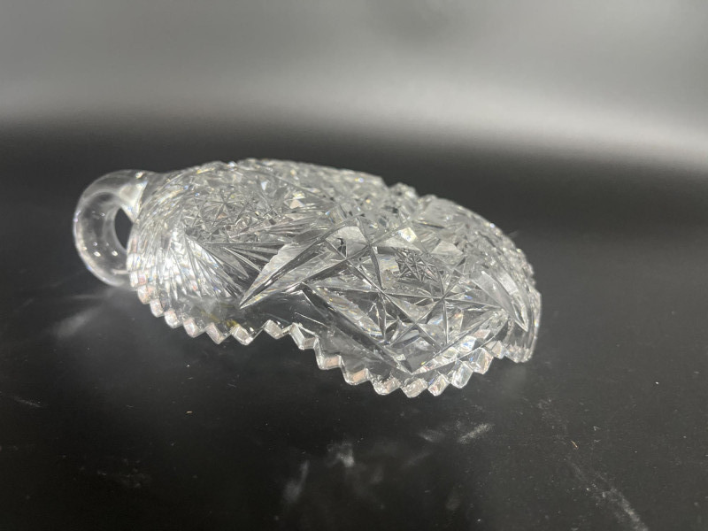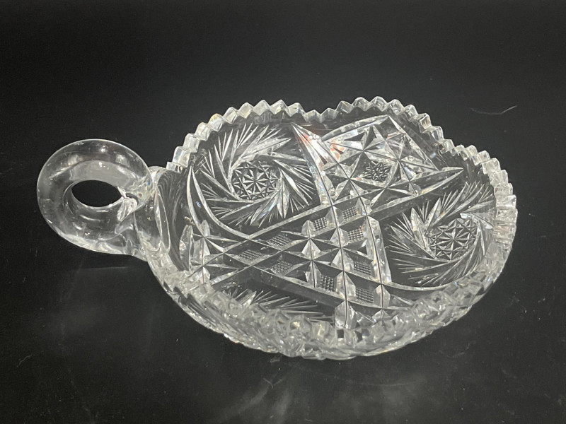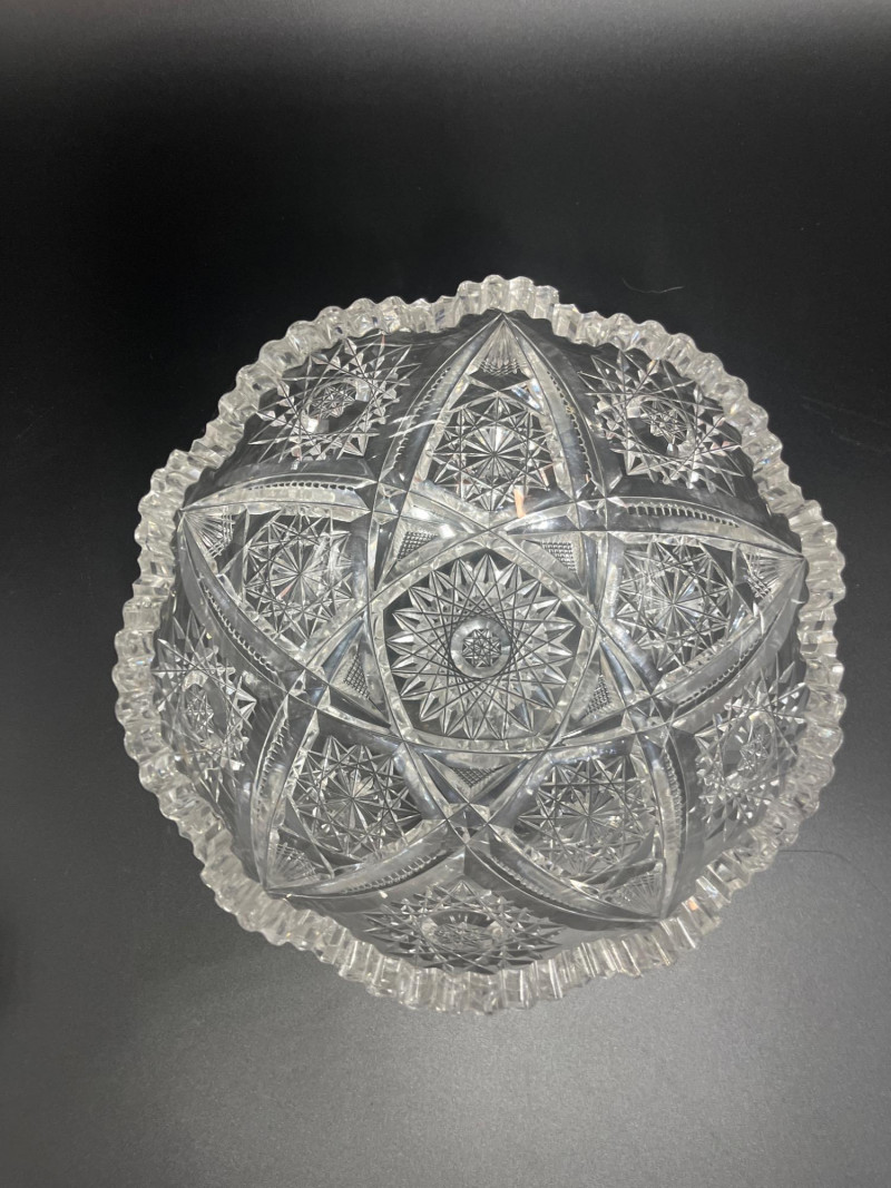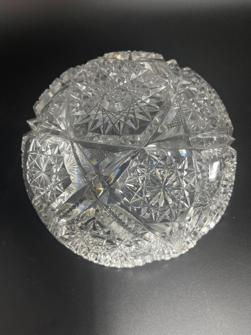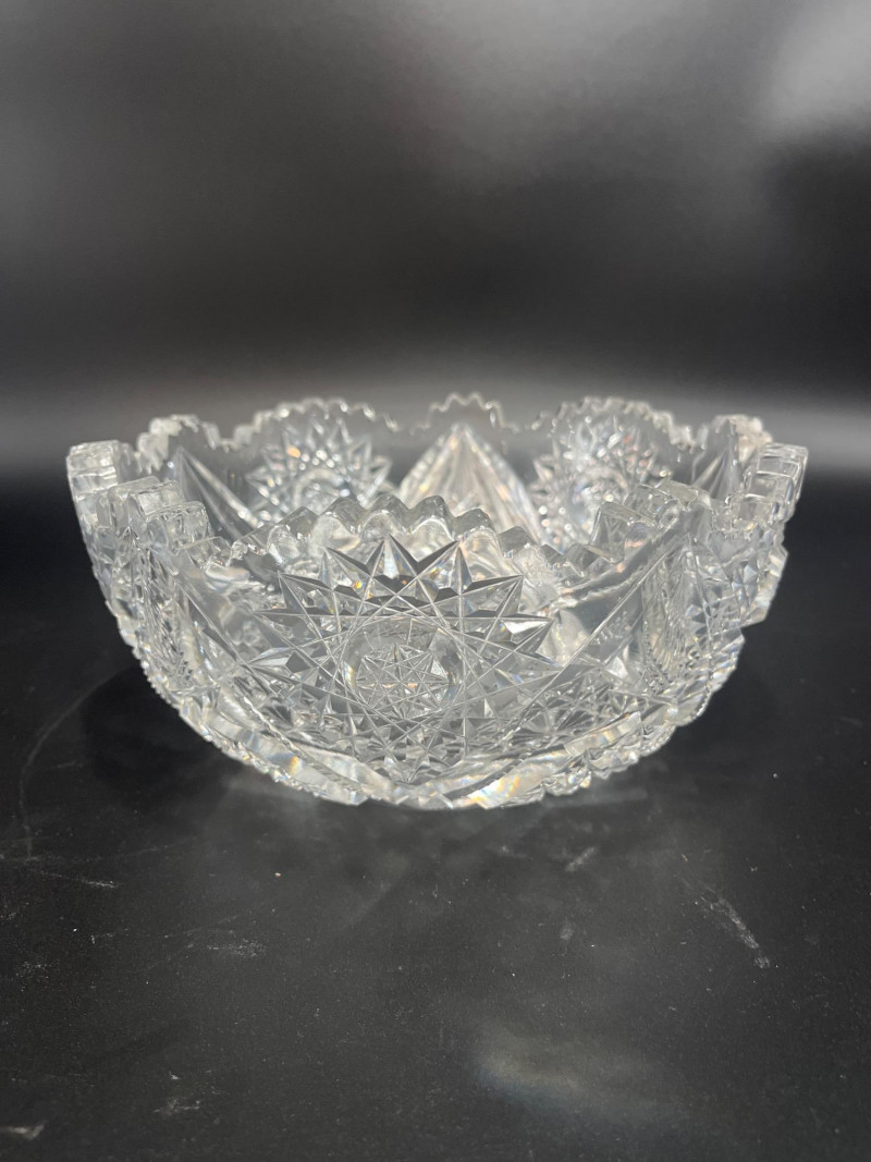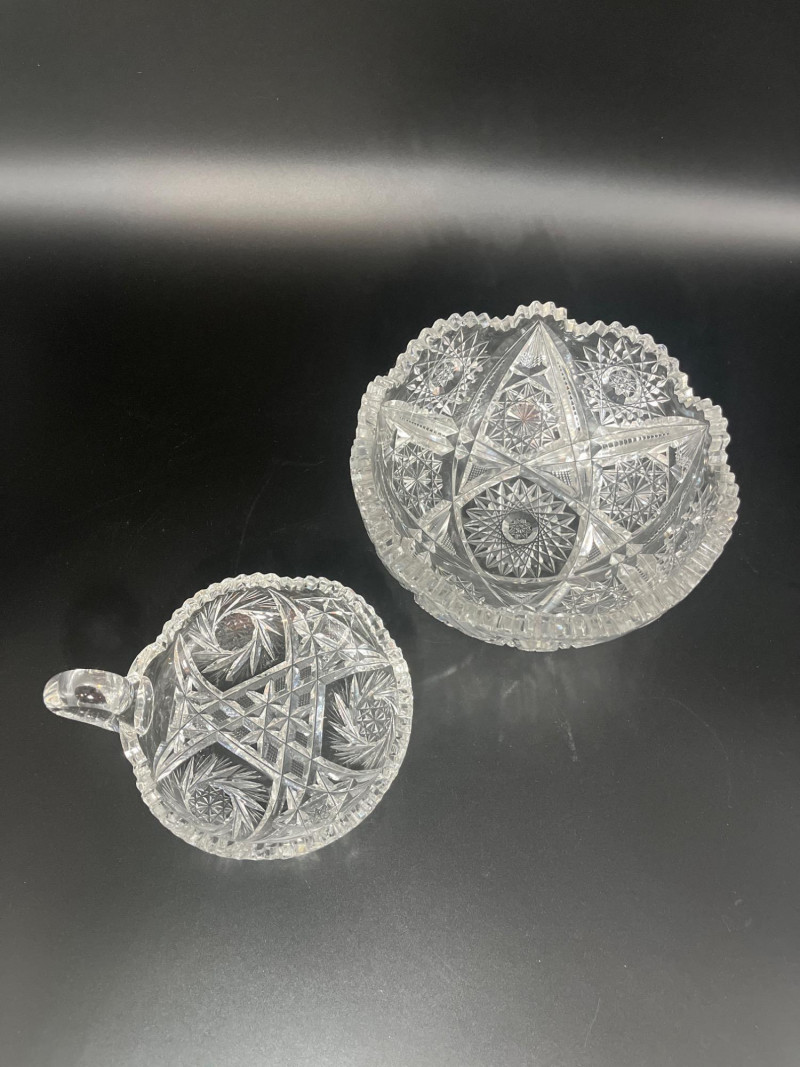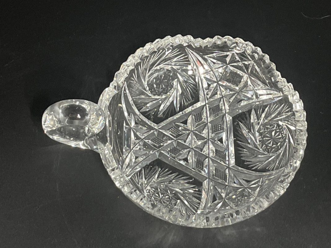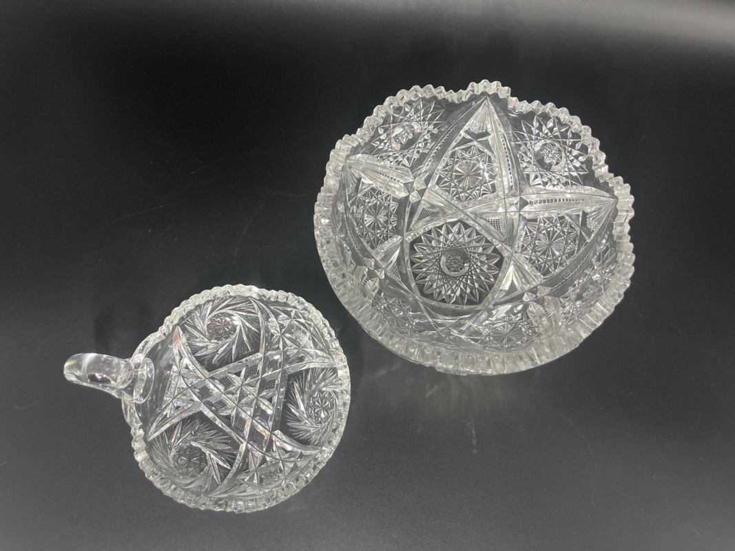 American Brilliant Period Cut Glass Bowls The large bowl is 8" across and 3 3/4" tall and the small bowl is 6" across (not including handle). These both have some scratches on the bottom but very little other wear or damage. I do not see a makers mark on either of these pieces but they are of lovely quality in the depth of their cuts and their weight.