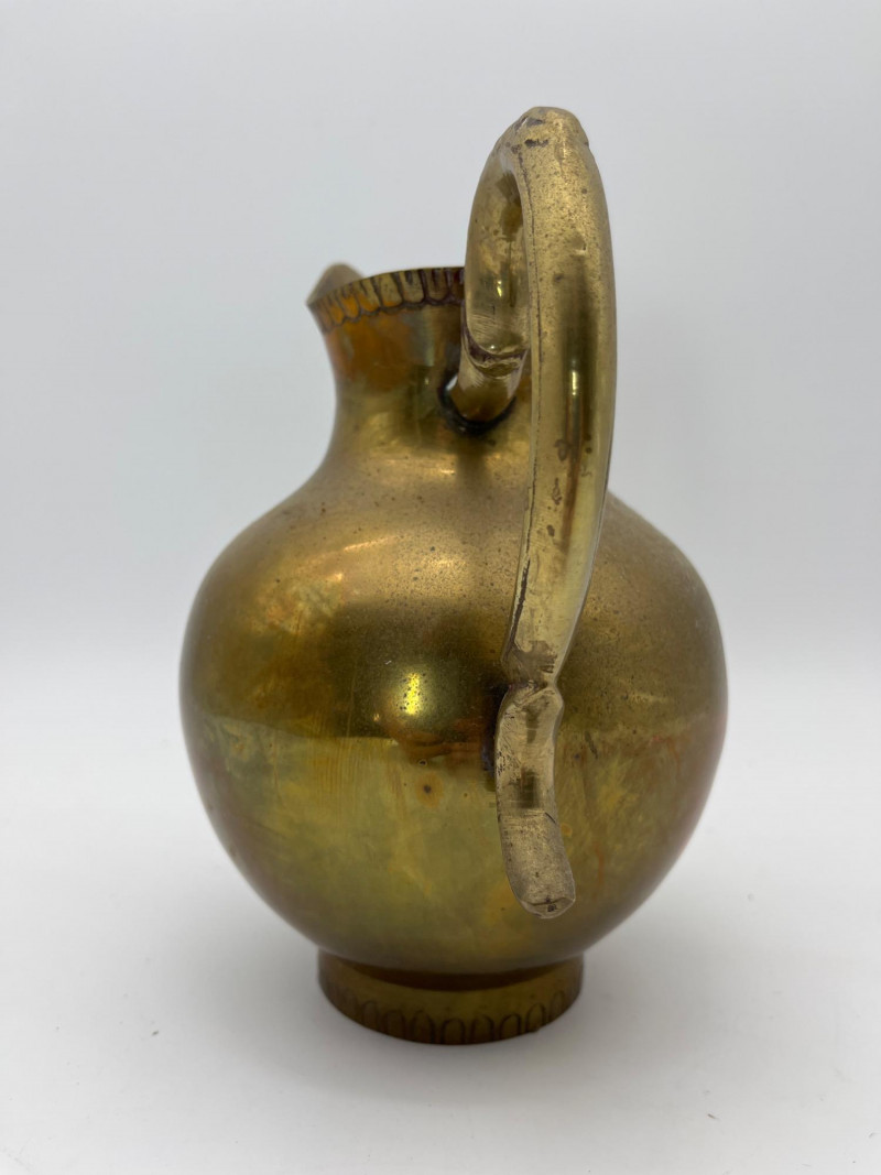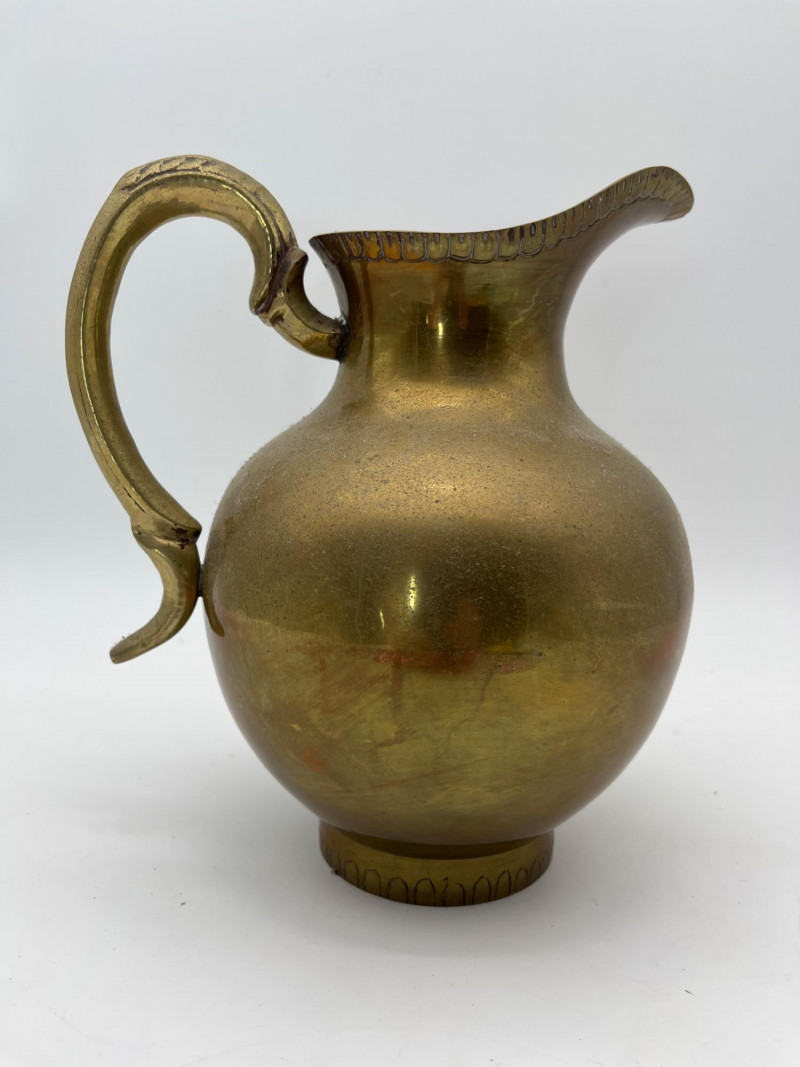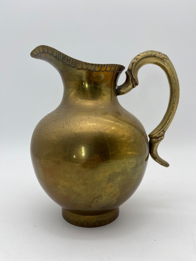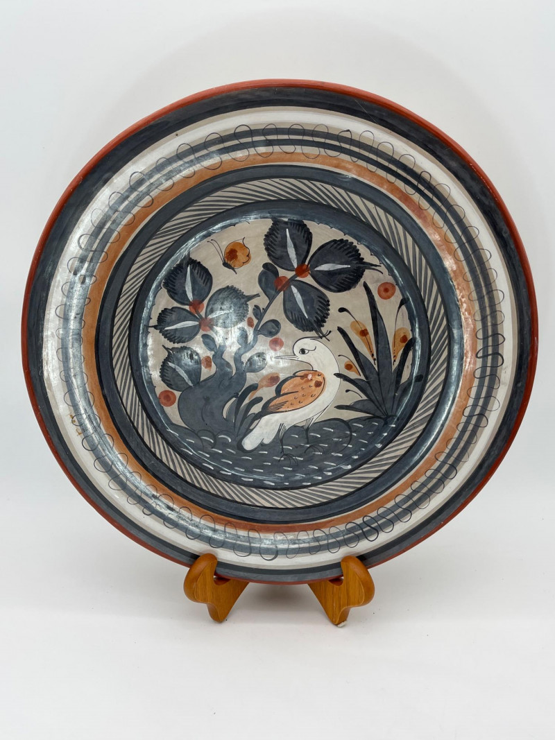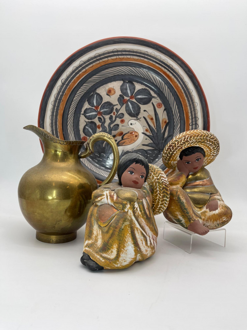 Mexican Pottery Platter, Figurines, and Brass Pitcher Lot This lot includes: