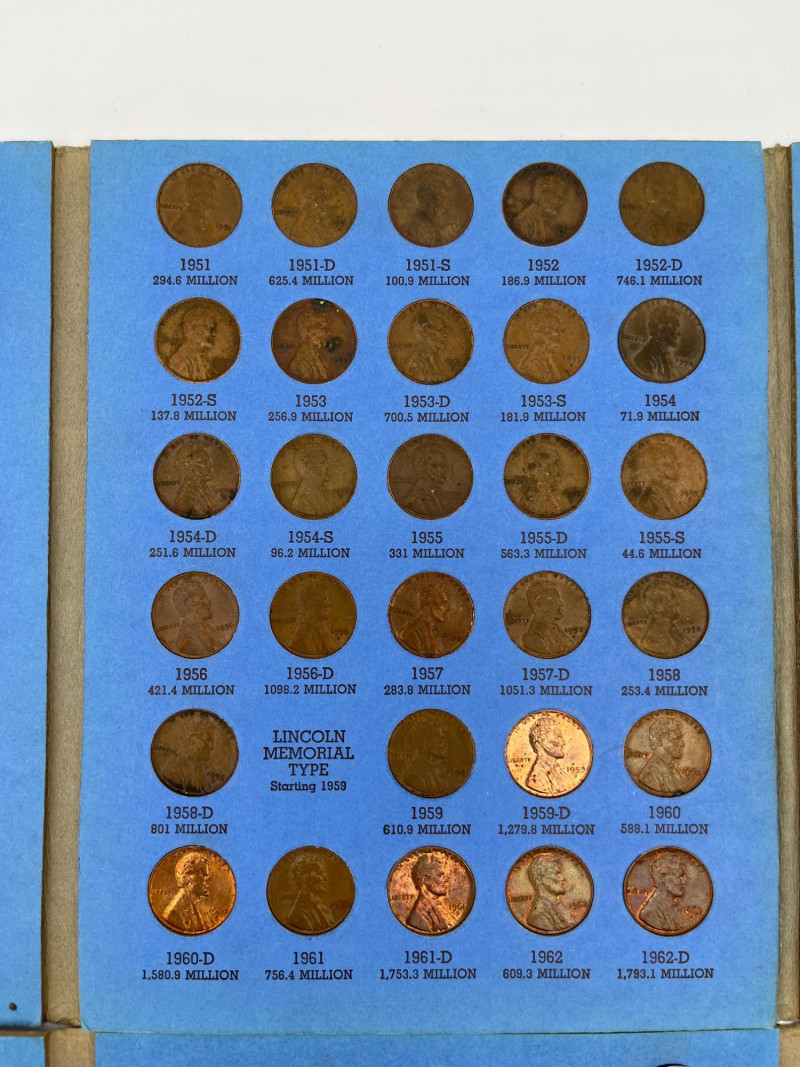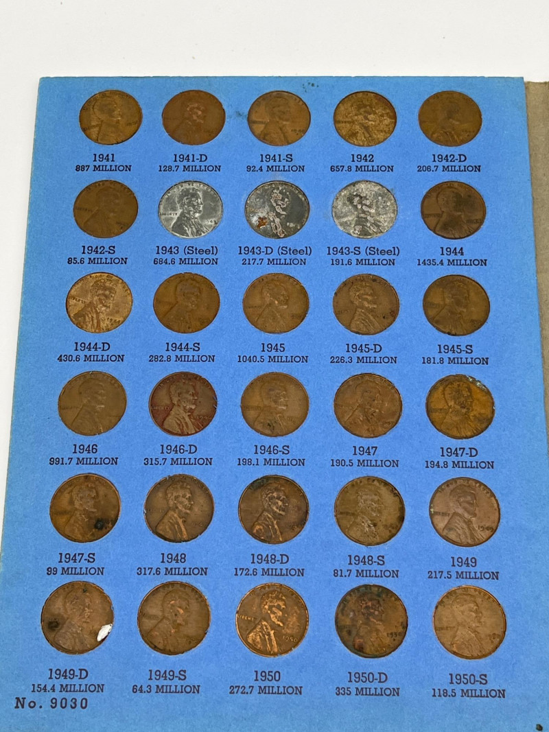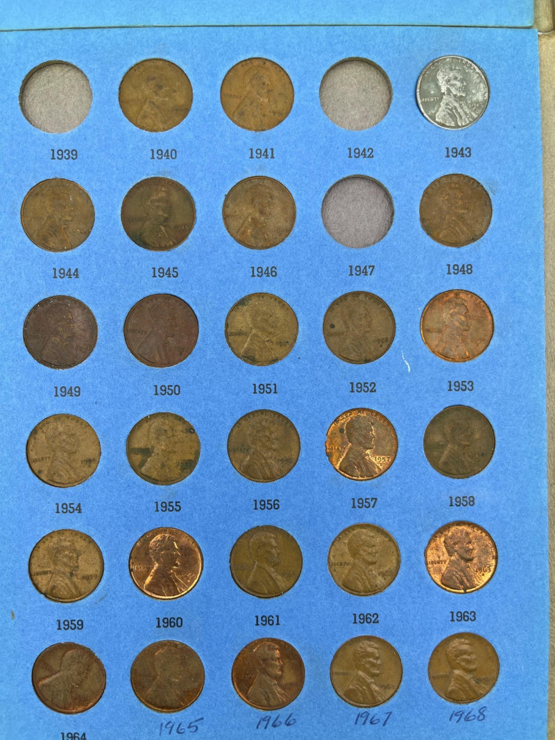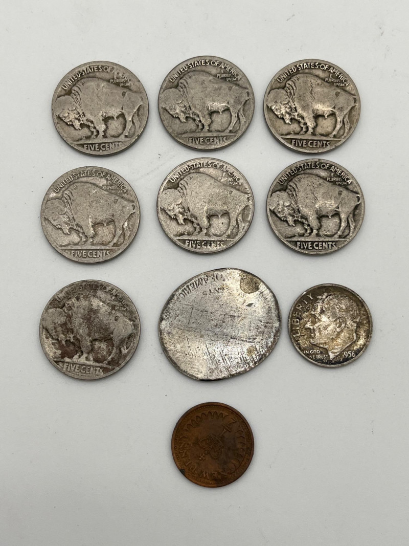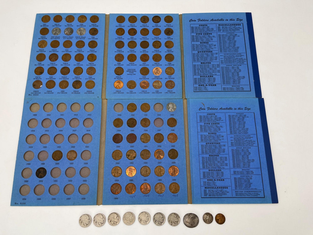 Coin Collection Featuring Lincoln Head Pennies and Indian Head Nickels Pennies are all in the collectors booklet slots although the collection is incomplete. The Indian Head / Buffalo Nickels are all pretty worn and none are in good enough condition to be able to make out the year. Once nickel is right off the train track. One silver dime. This is a modest collection but one that might be fun to add to your collection or help a new collector get their start!