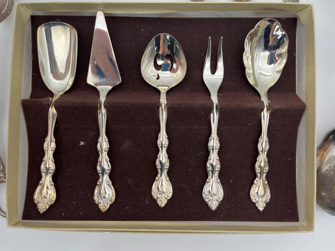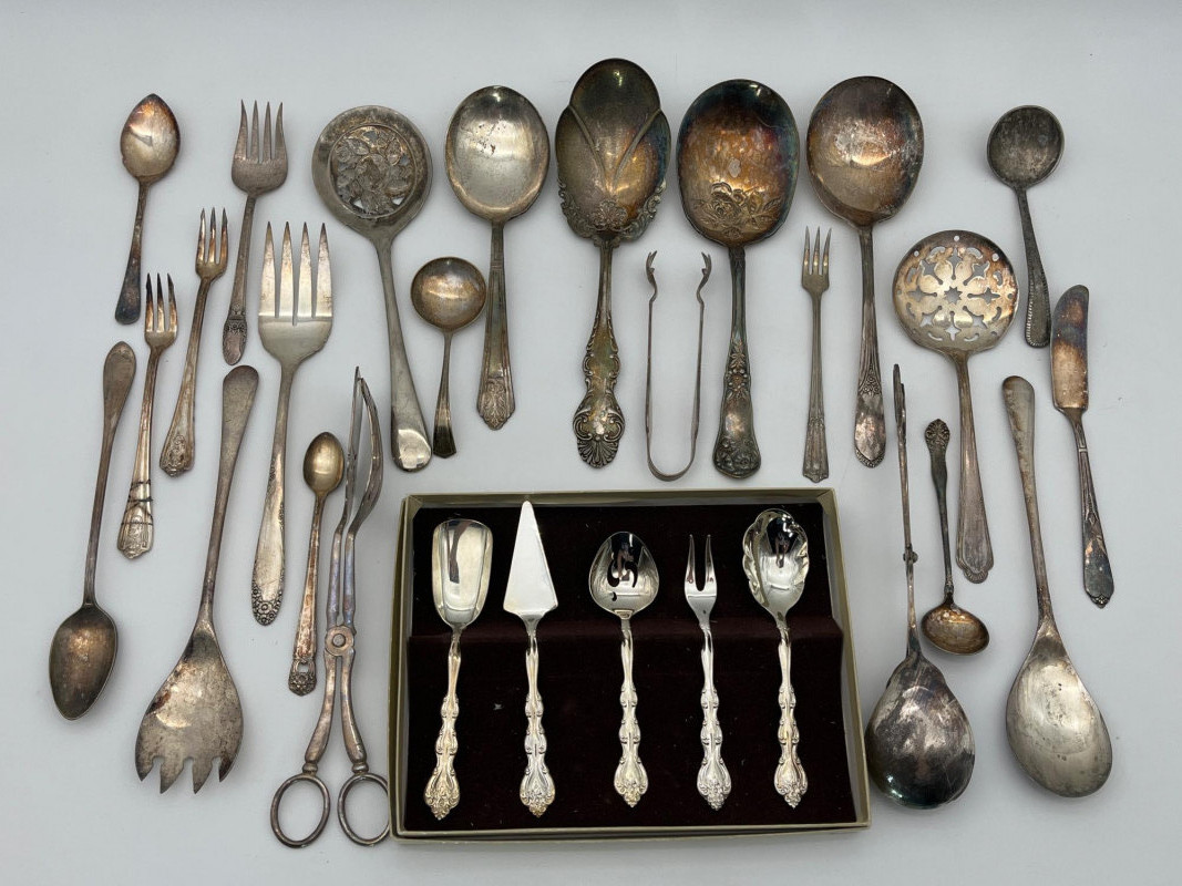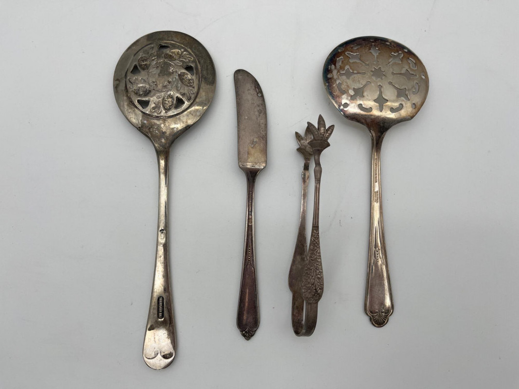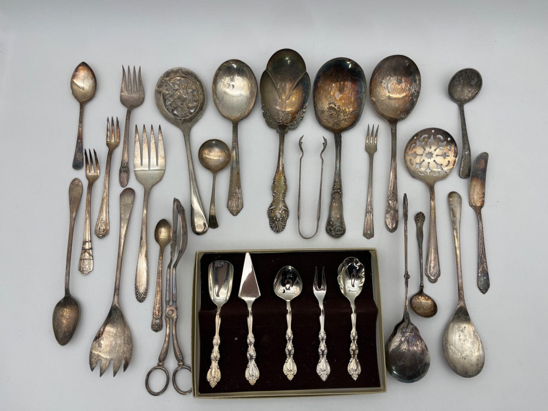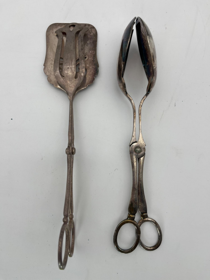 Silverplate Utensils Lot Featuring Many Serving Pieces There is a large assortment of pieces here from makers all over the world. There are two types of tongs, multiple large serving spoons, meat service spoons, slotted spoons, sugar and condiment spoons, and much more. Styles range from Victorian to modern and nearly everything in between!