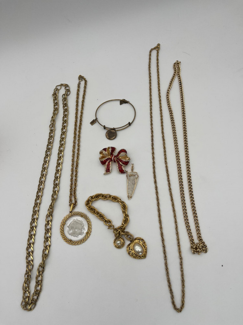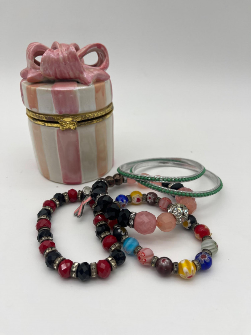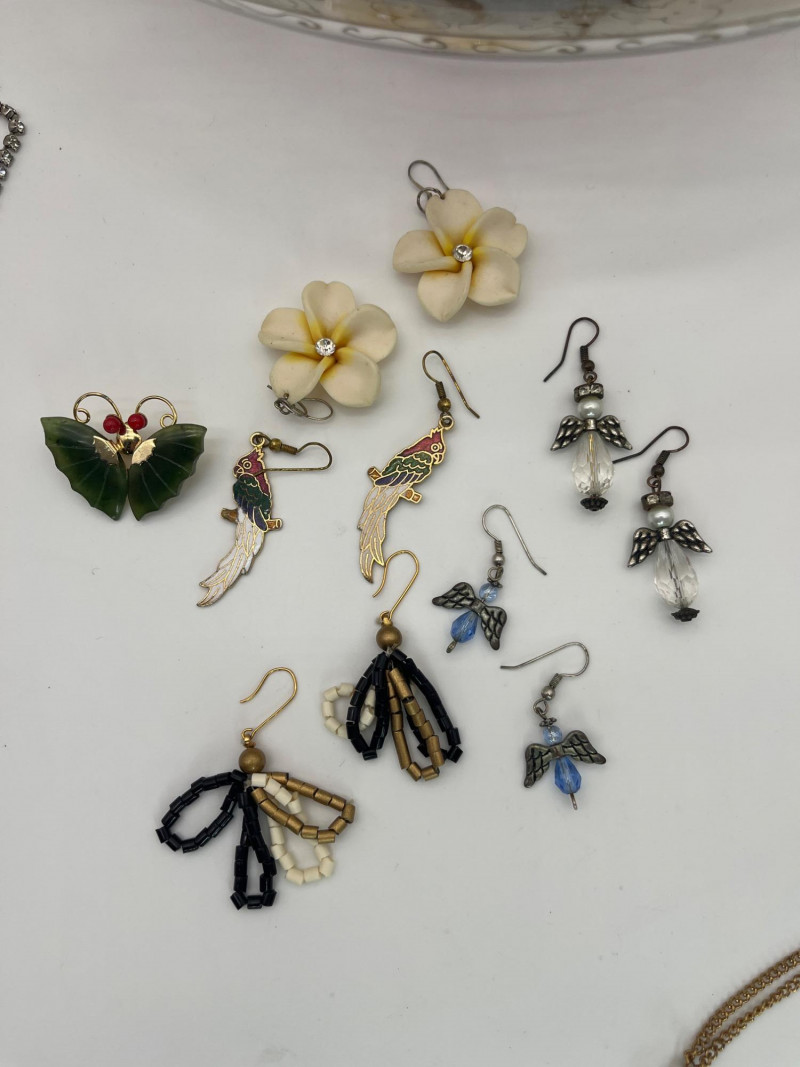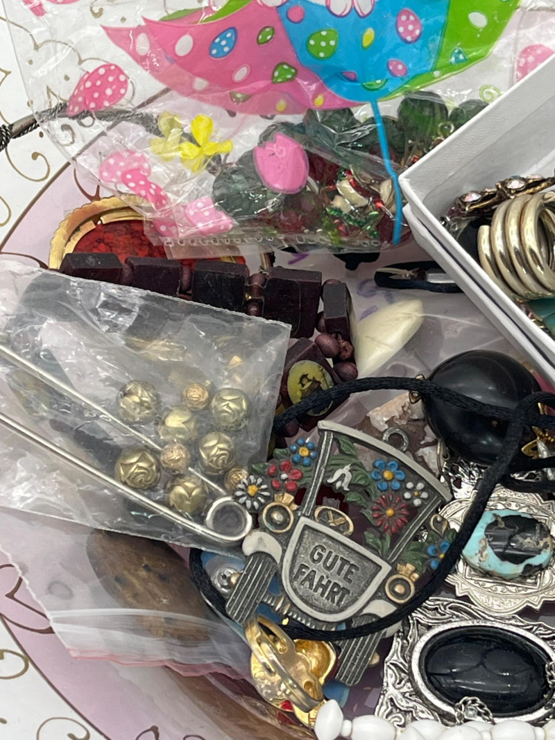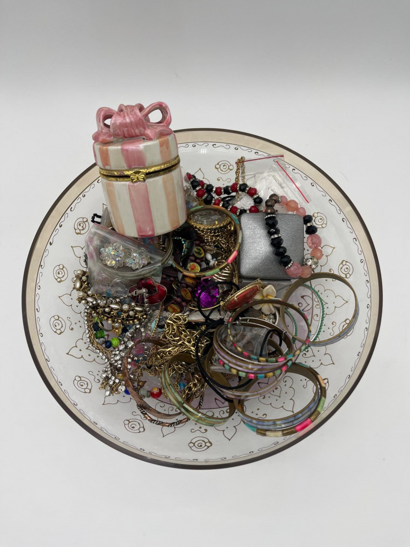 Big Bowl FULL of Costume Jewelry (Some for Repair, See Photos) This lot includes everything shown. The items shown separately are just shown to highlight this lot. As noted in the title, some pieces may need repair or be for parts if you're crafty. This lot also includes a pink and white, ceramic jewelry box shown in the last photo.