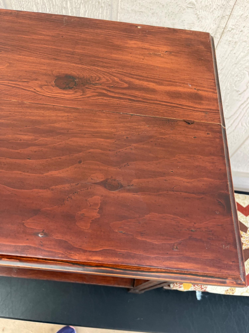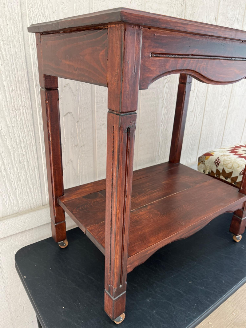 Antique Wooden Side Table with Wheels & Small Nailhead Foot Stool The table is 26" tall, 23 1/2" long, and 14" deep. It has a rich, dark finish and beautiful grain and knots on both the top and bottom level. The wheels are wood as well adding to it's vintage charm! The foot stool is 10" high, 15" long and 10" wide. It looks either recently reupholstered or perhaps newer than the table. It still "fits" the homey, vintage feel of the table.