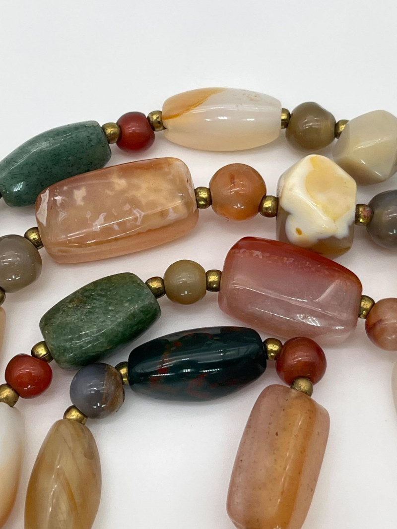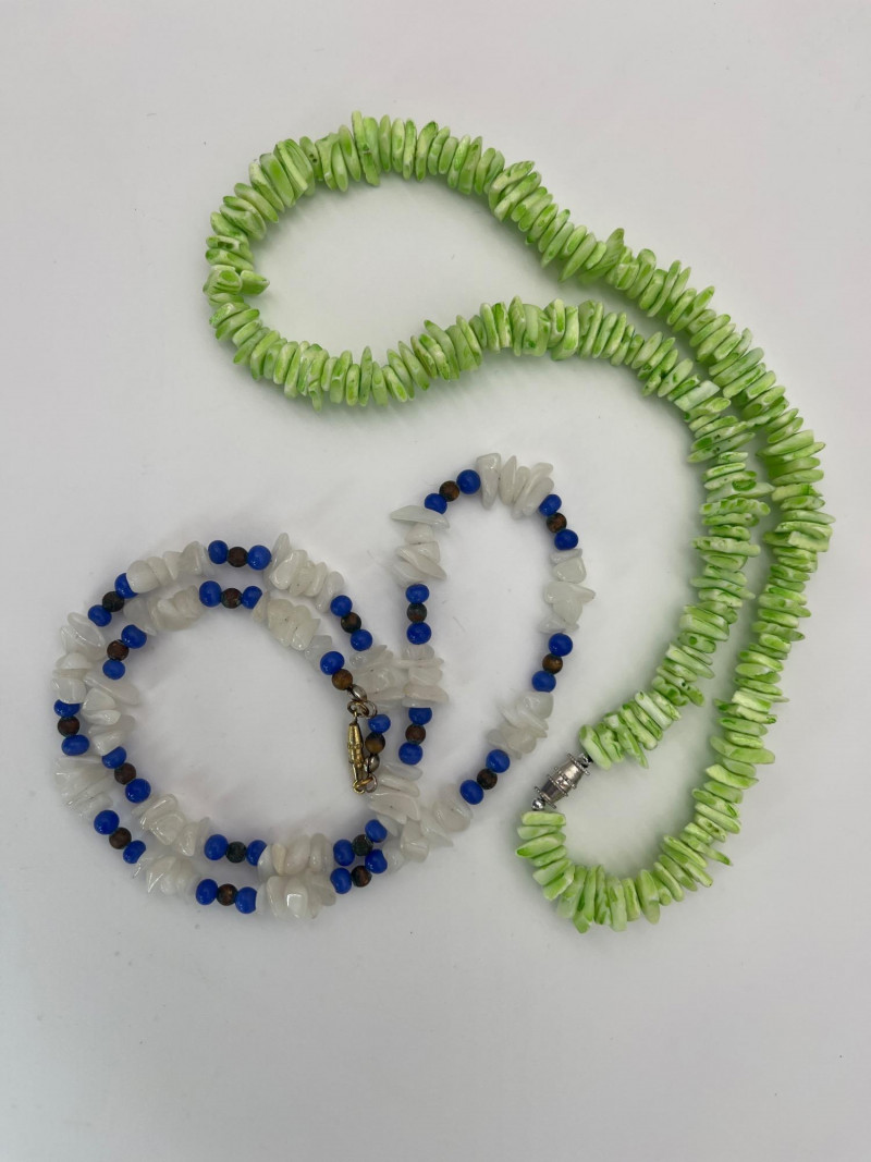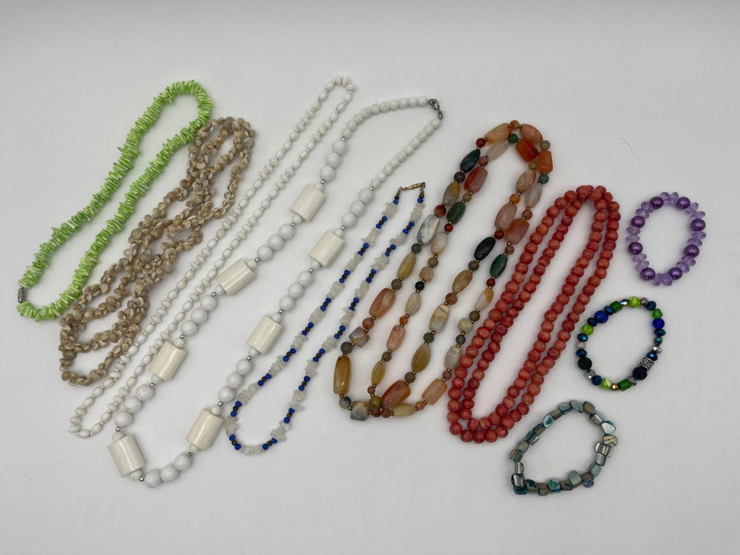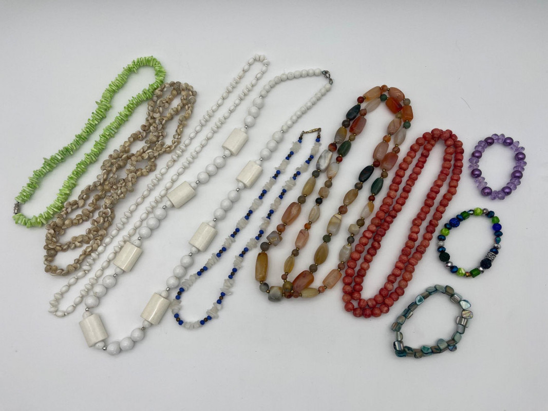 Colorful Collection of Beaded Necklaces & Bracelets in Natural & Beads These necklaces range from 18' - 40". Most are natural stone or shell, one is a vintage plastic beaded piece from the 70's. The bracelets are all elastic.