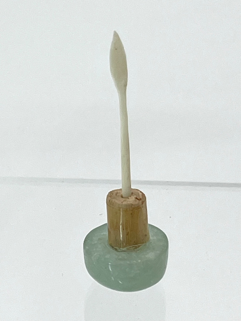 Antique Qing Dynasty Carved Agate Snuff Bottle with Jade Lid Snuff bottles were widely used during the Qing Dynasty in China to contain, primarily, powdered tobacco. These bottles were not only functional but also status symbols, reflecting on the wealth and taste of their owners. Agate was a popular material for snuff bottles due to its durability and the beautiful patterns that could be revealed through carving. The craftsmanship involved in create these bottles was highly valued, with intricate designs often incorporating auspicious symbols and motifs. This particular bottle is a mostly opaque natural agate with orange and brown inclusions throughout. The outside is intricately carved and then polished. The stopped looks to be the original as it has the same circumference as the opening of the bottle. The stopper lid is a pale jade with what looks to be a carved bone spoon. The stopper portion looks to have been repaired at some point with an adhesive tape to hold the fibers of the wood together. It should be noted that this bottle does not stand perfectly straight when set on a flat surface. This is not uncommon of carved stone bottles. This piece is 2 3/8" tall, 1 1/2" wide by 1" deep (front to back).